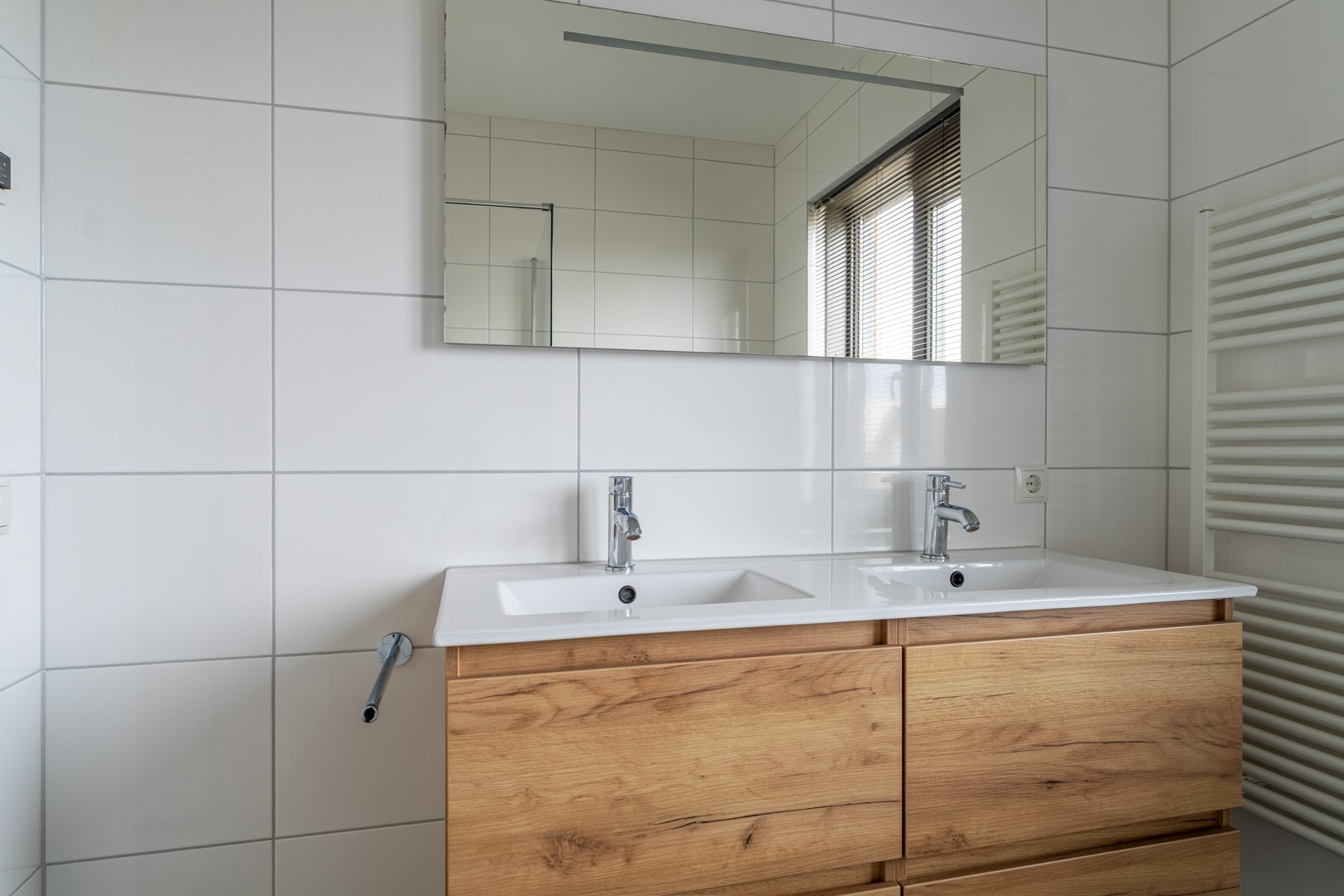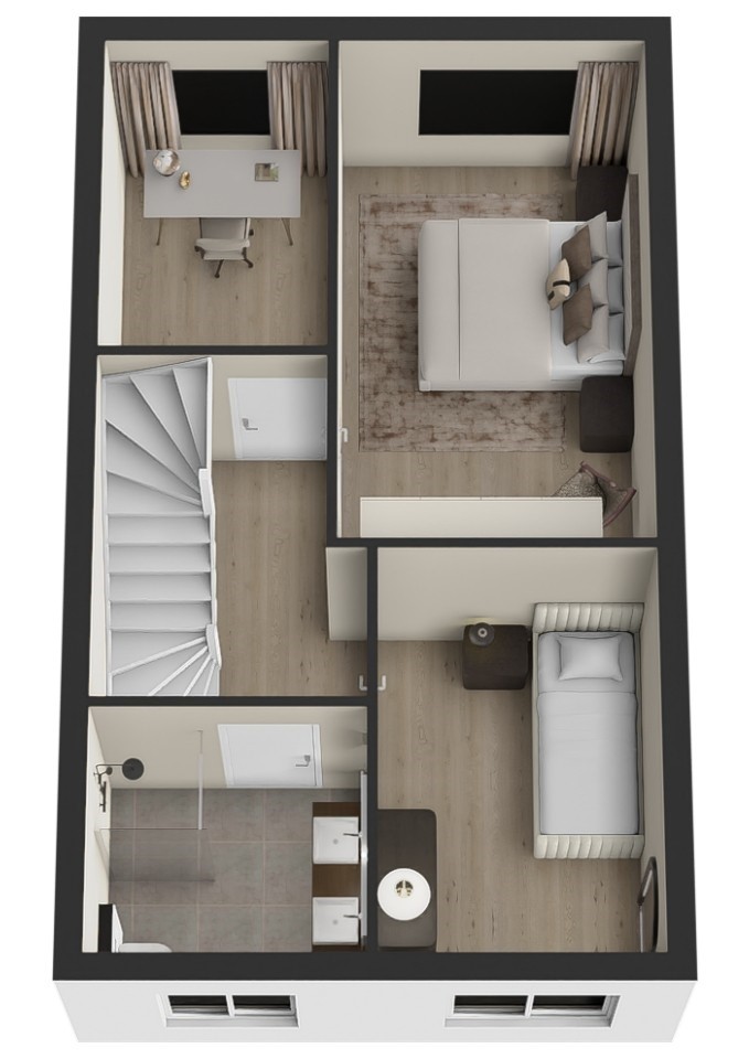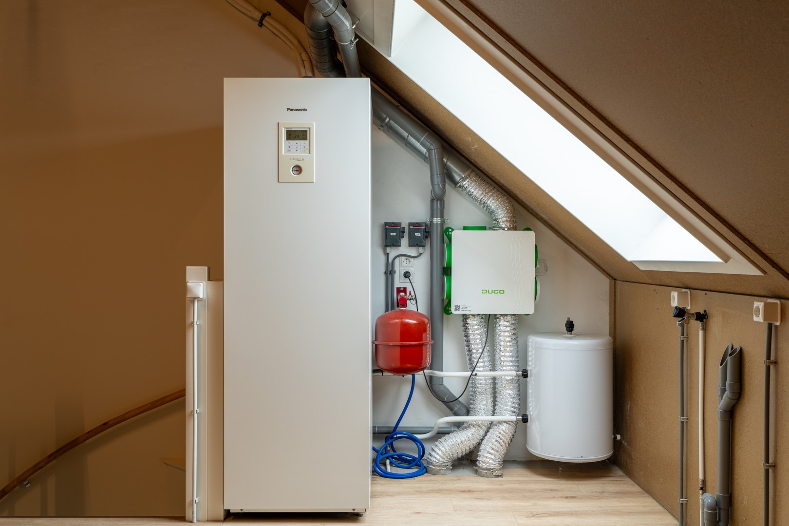 ideaal voor wie liever leeft dan poetst. De moderne badkamer is uitgerust met een inloopdouche, dubbel wastafelmeubel, zwevend closet en designradiator. Op de zolderverdieping vind je een ruime open verdieping met dakraam, voorzien van alle techniek die dit huis zo duurzaam maakt: een warmtepomp, mechanische ventilatie en een wasmachineaansluiting. Dankzij de bergruimtes achter het knieschot kun je hier gemakkelijk al je seizoenspullen kwijt.