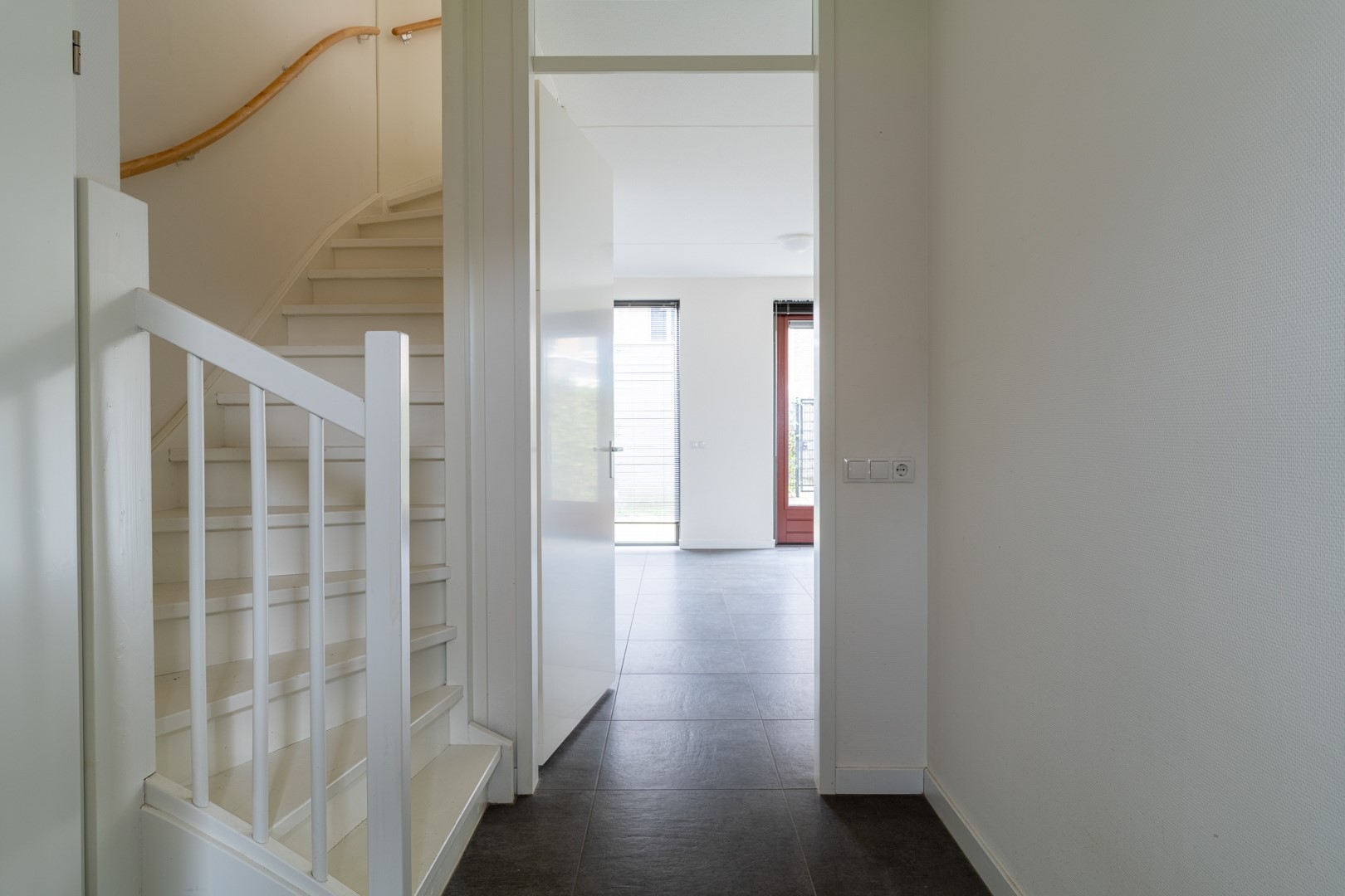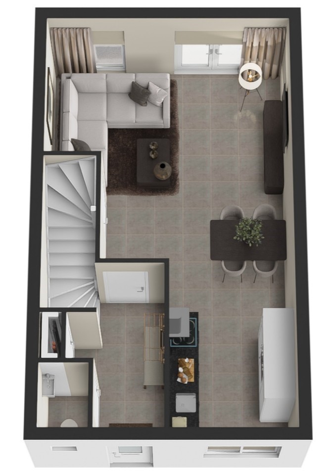 De hal heet je welkom met een keurige toiletruimte (natuurlijk met zwevend closet) en een fontein. Loop door naar de living en je voelt direct hoe makkelijk je hier neerploft op de bank. De strakke tegelvloer met vloerverwarming maakt pantoffels overbodig. Door de dubbel openslaande tuindeuren laat je het zonlicht royaal binnen en loopt binnen moeiteloos over in buiten. De trapkast verdient bonuspunten: ideaal voor je voorraad of alle spullen die je even uit het zicht wilt hebben.