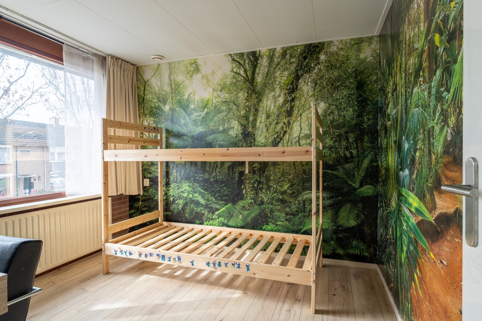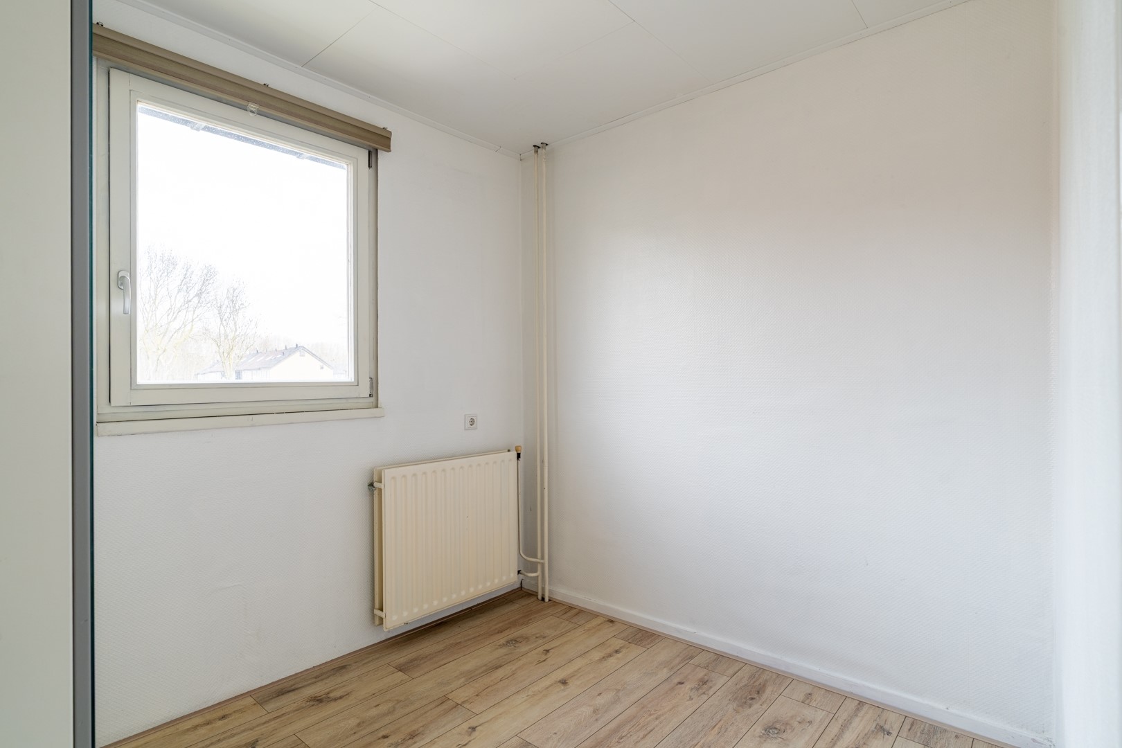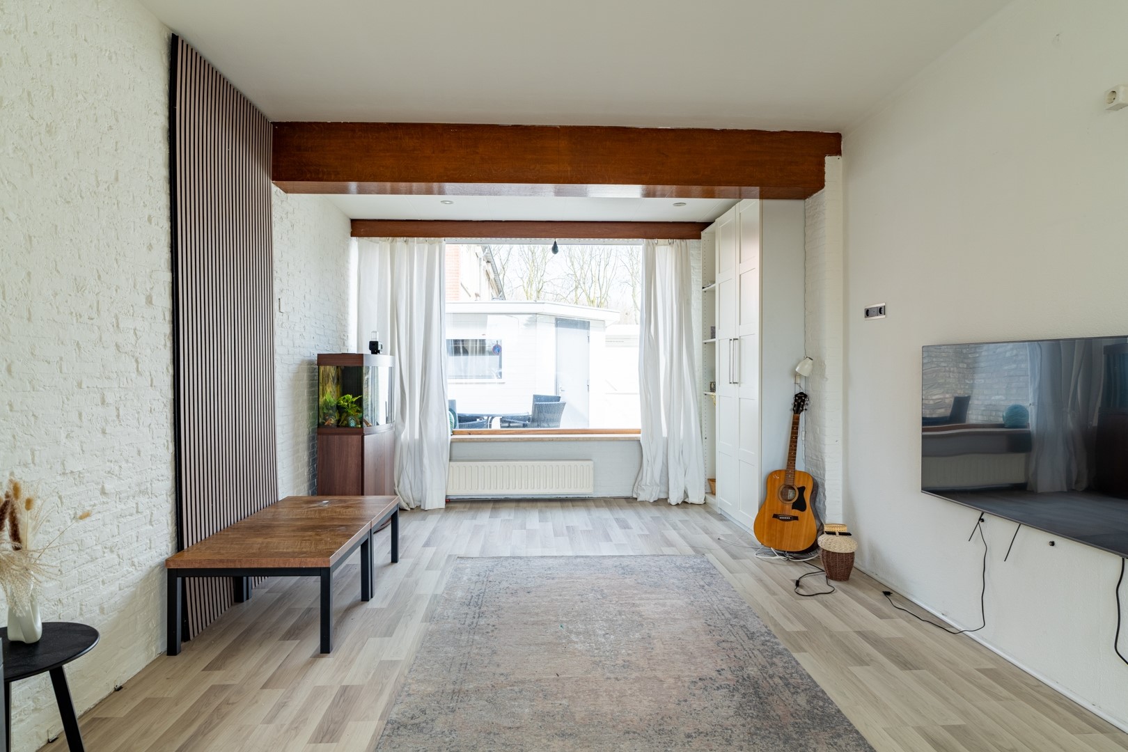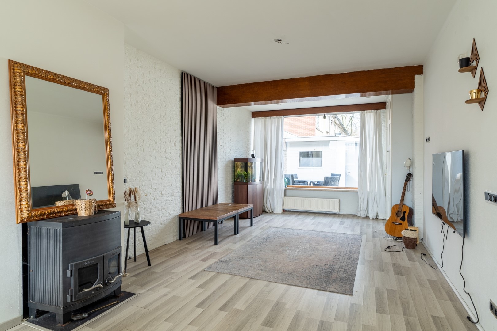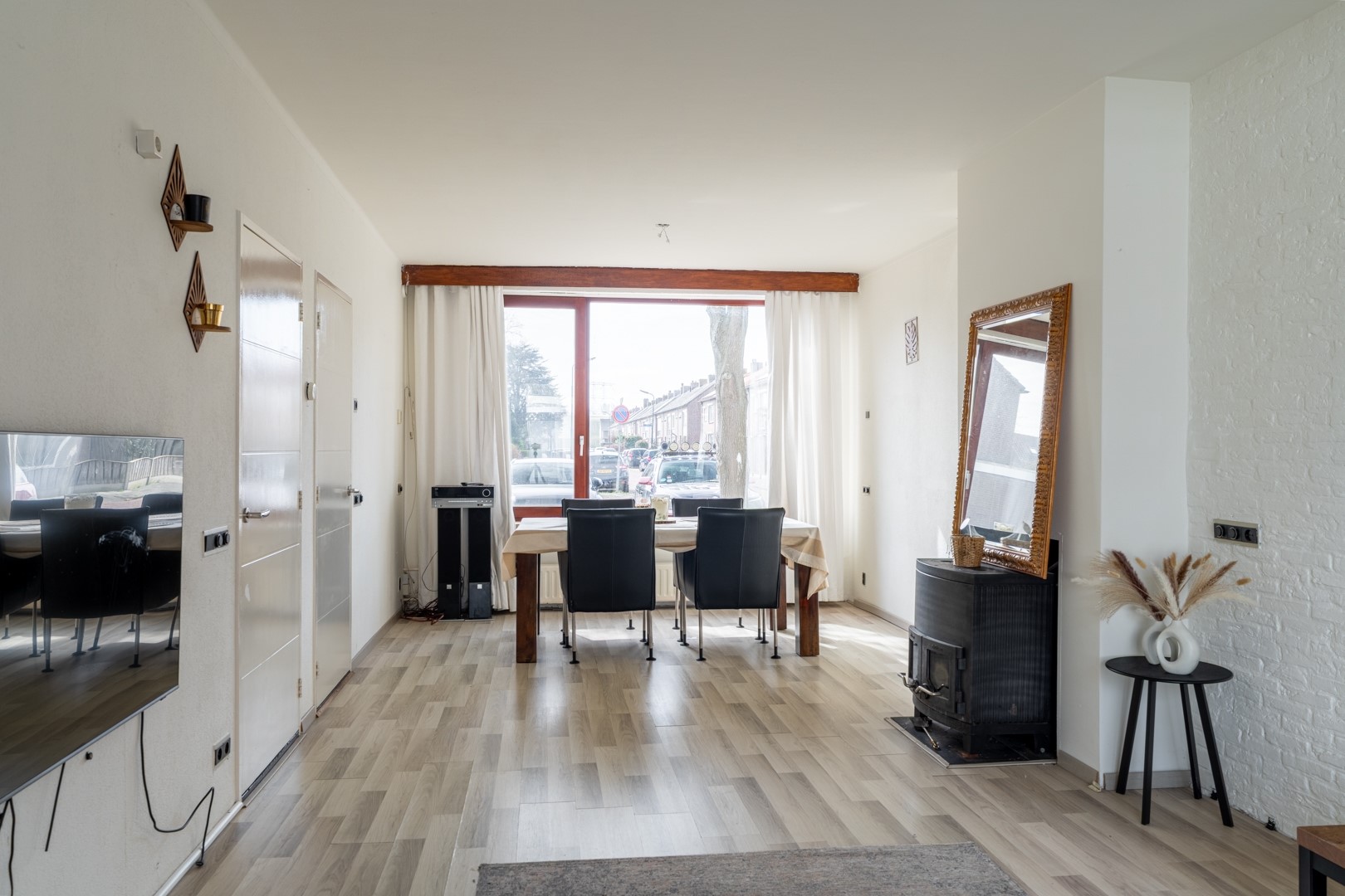 Binnenkomen doe je via de hal met trapkast (handig voor alles wat je “even snel” wilt opbergen) en een toiletruimte met fontein. De woonkamer is een fijne, lichte ruimte waar de houtkachel al klaarstaat voor knusse avonden, denk: dekentje, kop thee en nooit meer weg willen. De open keuken is momenteel creatief “verstopt” achter een kast, maar goed nieuws: die kan gewoon weer open. Dus of je nu houdt van een afgesloten kookhoek of een gezellige leefkeuken waar iedereen zich bemoeit met het eten, de keuze is aan jou.