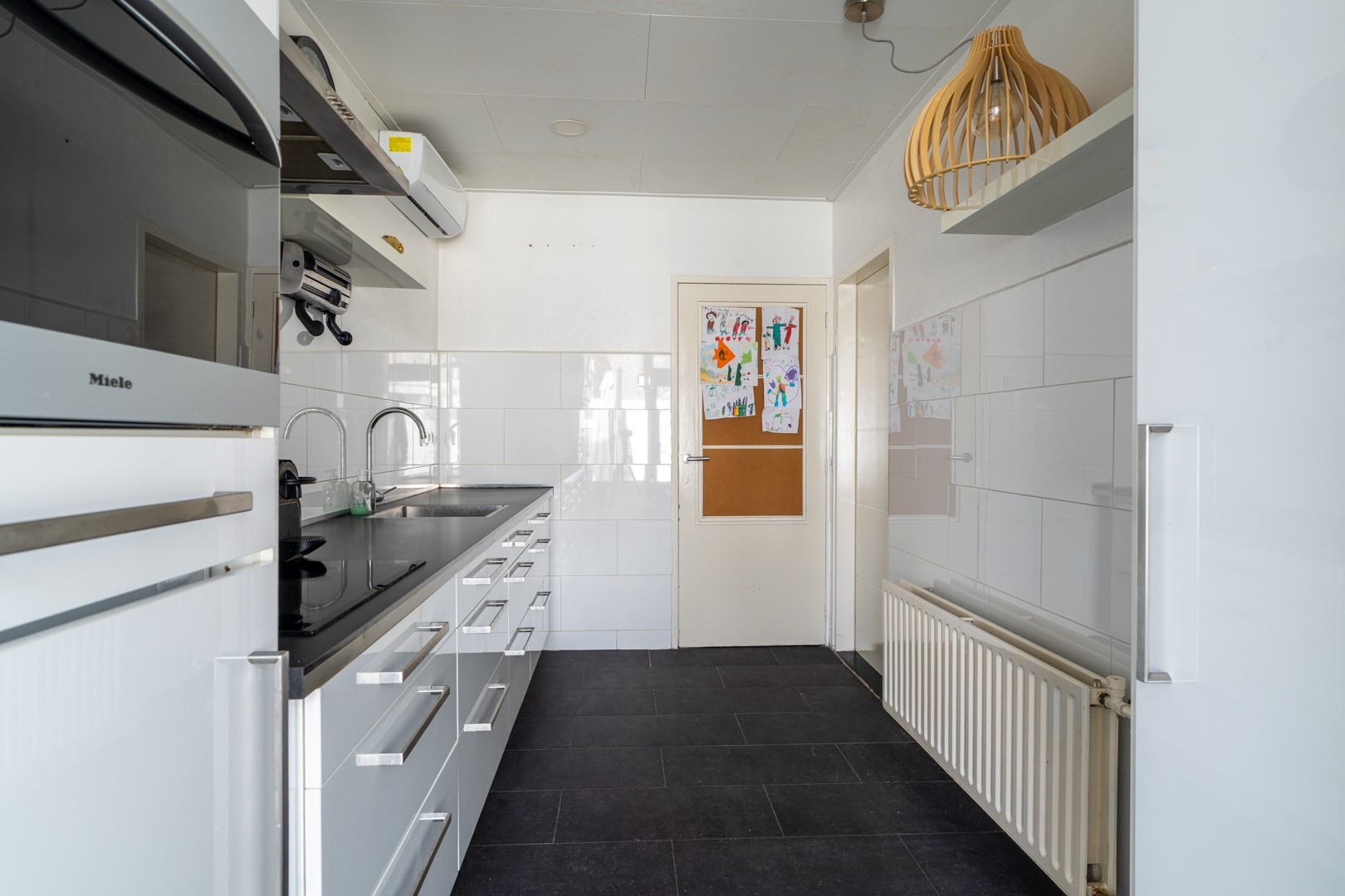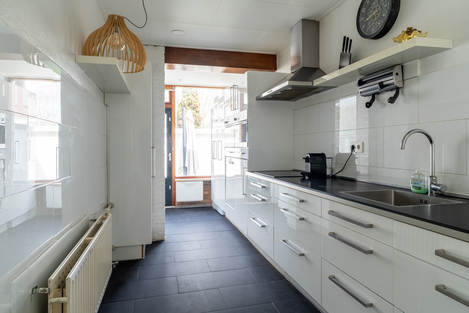 De keuken is van alle gemakken voorzien: een inductiekookplaat, afzuigkap, koelkast, vaatwasser, combi-oven én een stoomoven voor de thuiskok die net een stapje verder wil. De aanwezige airco zorgt ervoor dat je ook tijdens zomerse kookavonden koel blijft. Via de tuindeur loop je zo naar buiten, ideaal voor een snelle barbecue-switch of om even te checken of de zon nog schijnt.