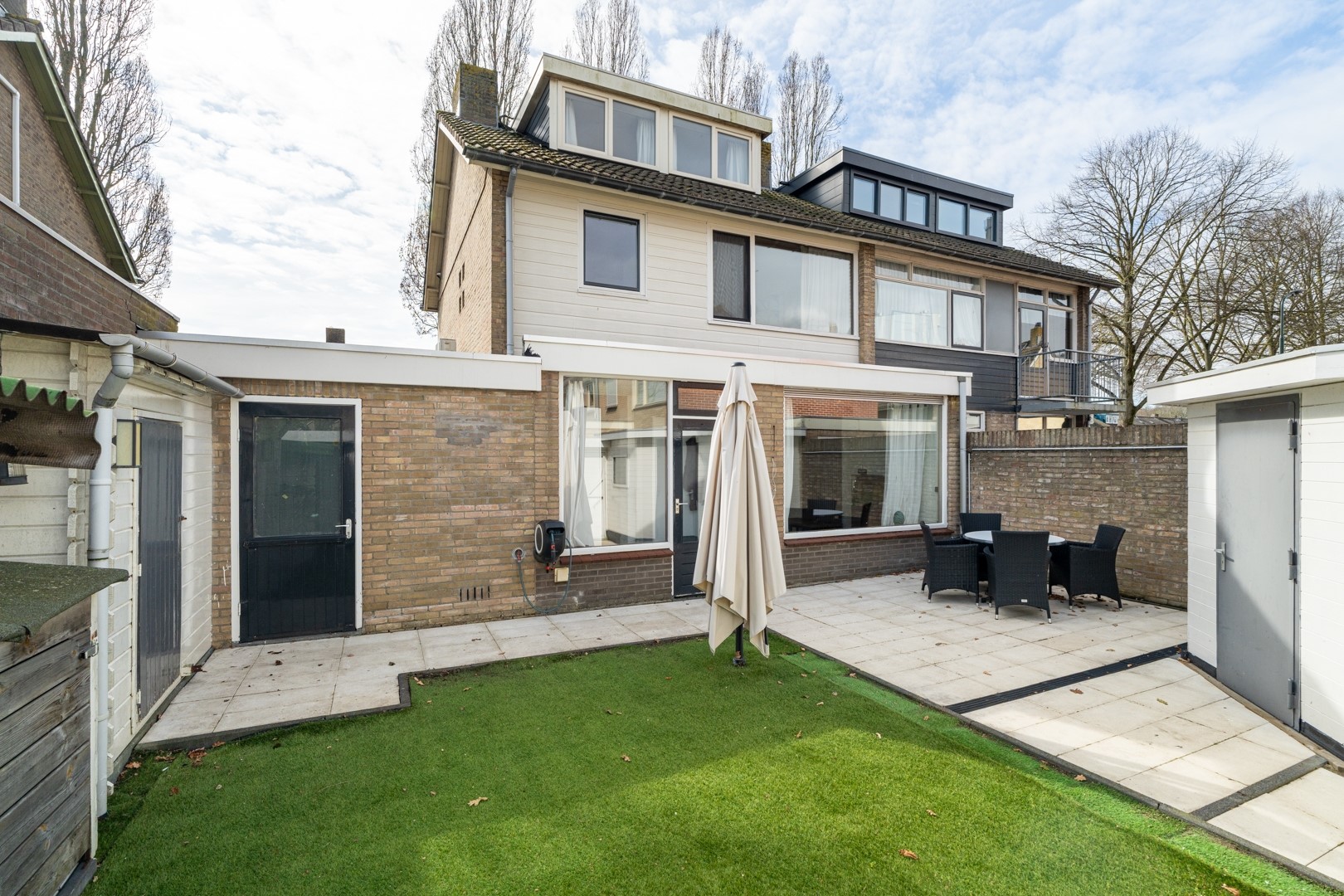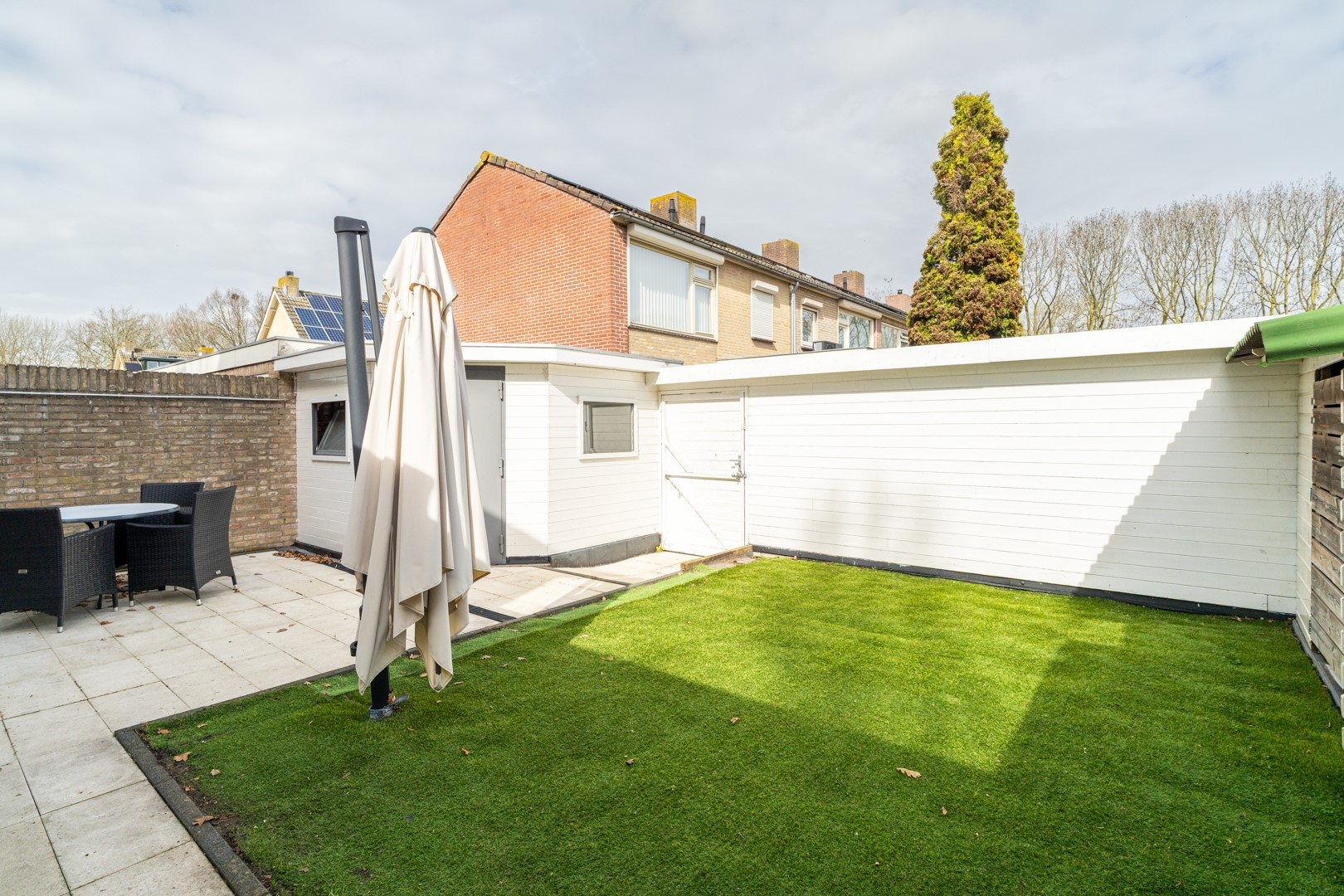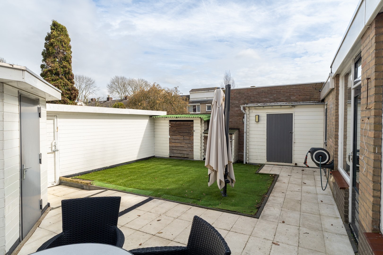 De tuin is onderhoudsvriendelijk ingericht met siertegels en kunstgras, dus meer genieten, minder maaien. Daarnaast is er een berging van circa 7 m² met elektra én een aangebouwde garage van circa 18 m², eveneens met elektra en verwarming. Of je nu wilt klussen, opslaan of stiekem een mancave wilt creëren, de ruimte is er. Voor de auto’s is het ook goed geregeld: een carport, een plek bij het plantsoen én in de garage. Drie auto’s parkeren? Geen probleem. Zelfs visite hoeft niet te stressen.