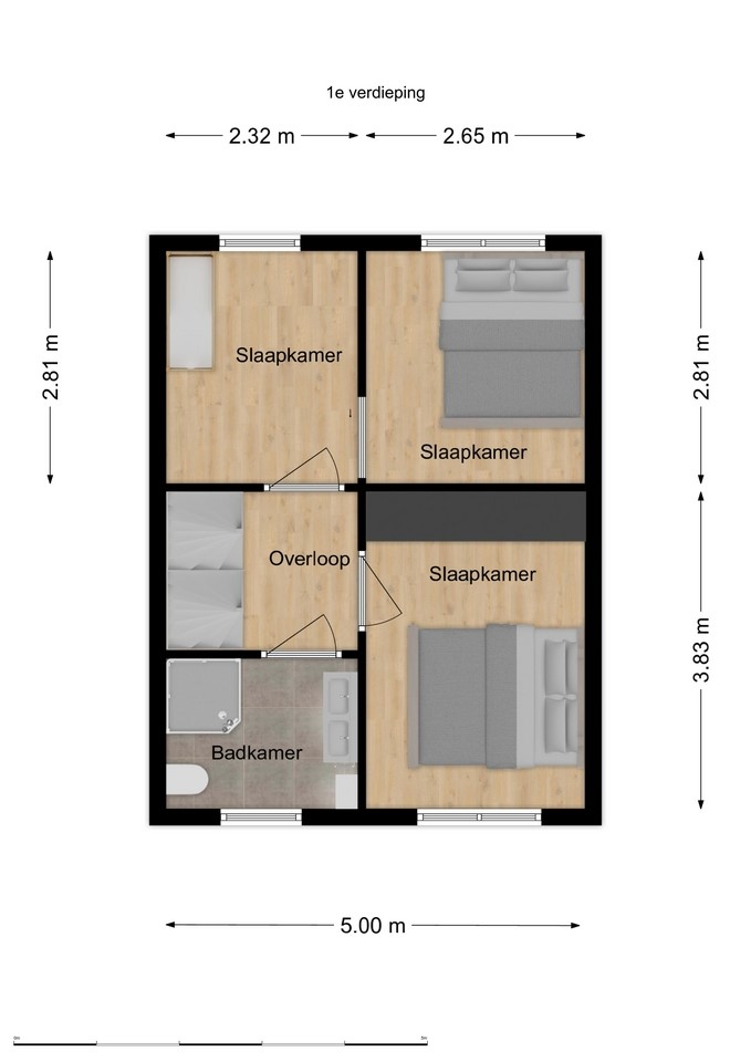De eerste verdieping telt drie slaapkamers, stuk voor stuk licht en goed in te richten. De badkamer is netjes uitgevoerd met een douche, ligbad, tweede toilet en een dubbele wastafelmeubel. Het geheel voelt fris, modern en comfortabel aan.