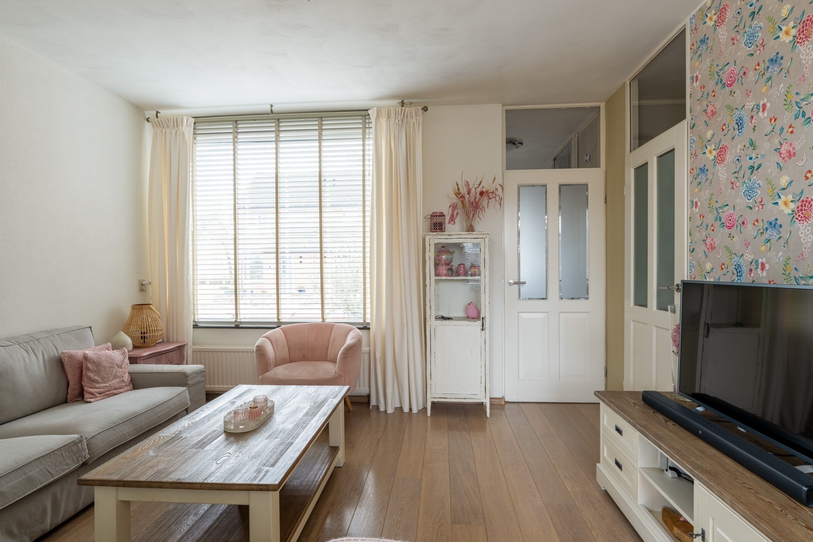 Bij binnenkomst valt meteen op hoe netjes en verzorgd deze woning is. In de hal bevinden zich de garderobe, meterkast en het toilet. Vanuit hier stap je de woonkamer binnen: een lichte, aangename ruimte met een praktische trapkast en de trapopgang naar de eerste verdieping. De grote ramen zorgen voor veel daglicht en geven de kamer een open en rustige uitstraling.