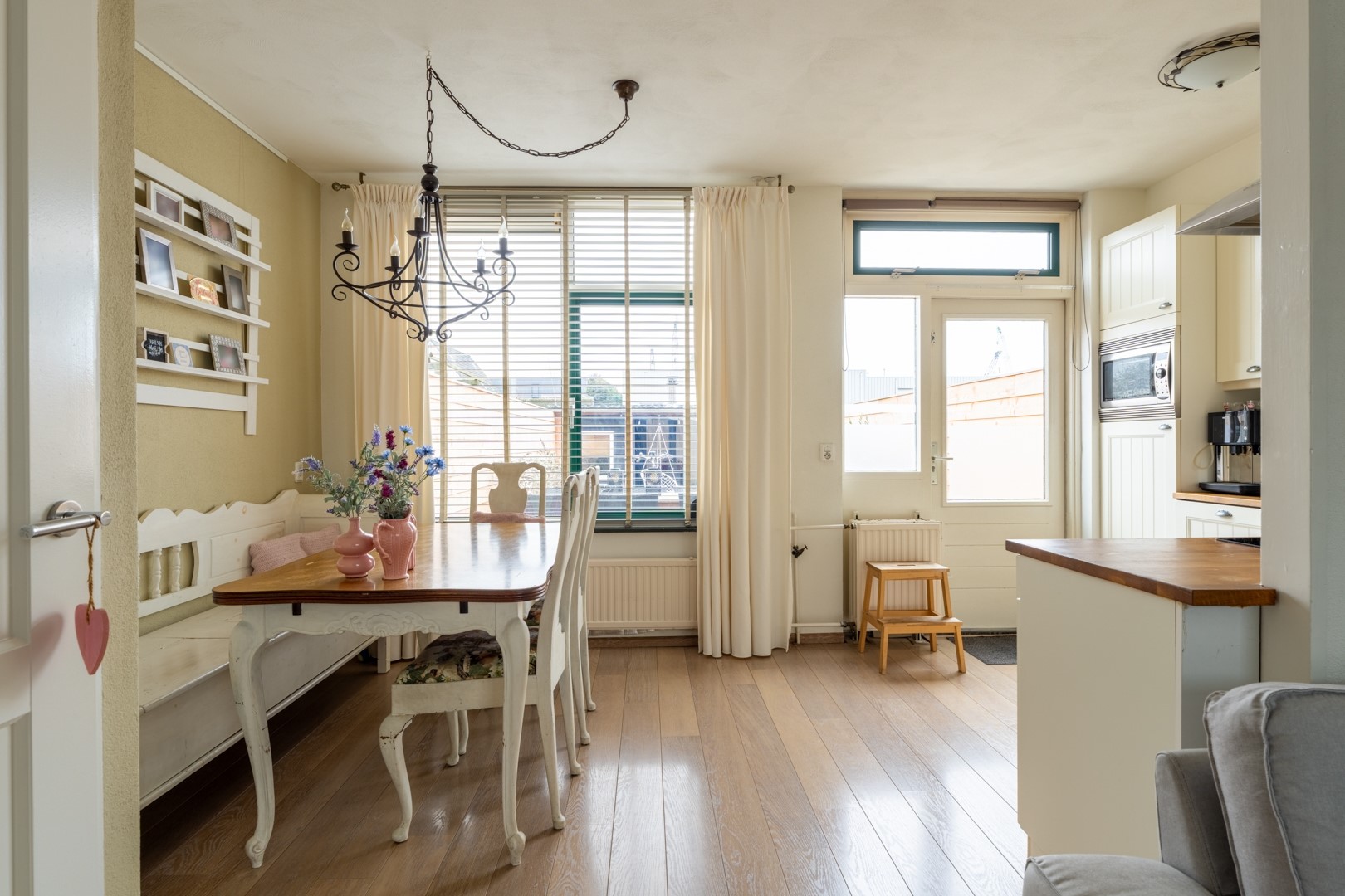 Aan de achterzijde ligt landelijke keuken. Deze is compleet uitgerust met o.a. een inductie kookplaat, afzuigkap, combimagnetron, vaatwasser en koelkast. Dankzij de logische indeling en ruime opzet vormt dit een fijne plek om te koken en samen te zijn. Vanuit de keuken kom je in de leuke achtertuin.