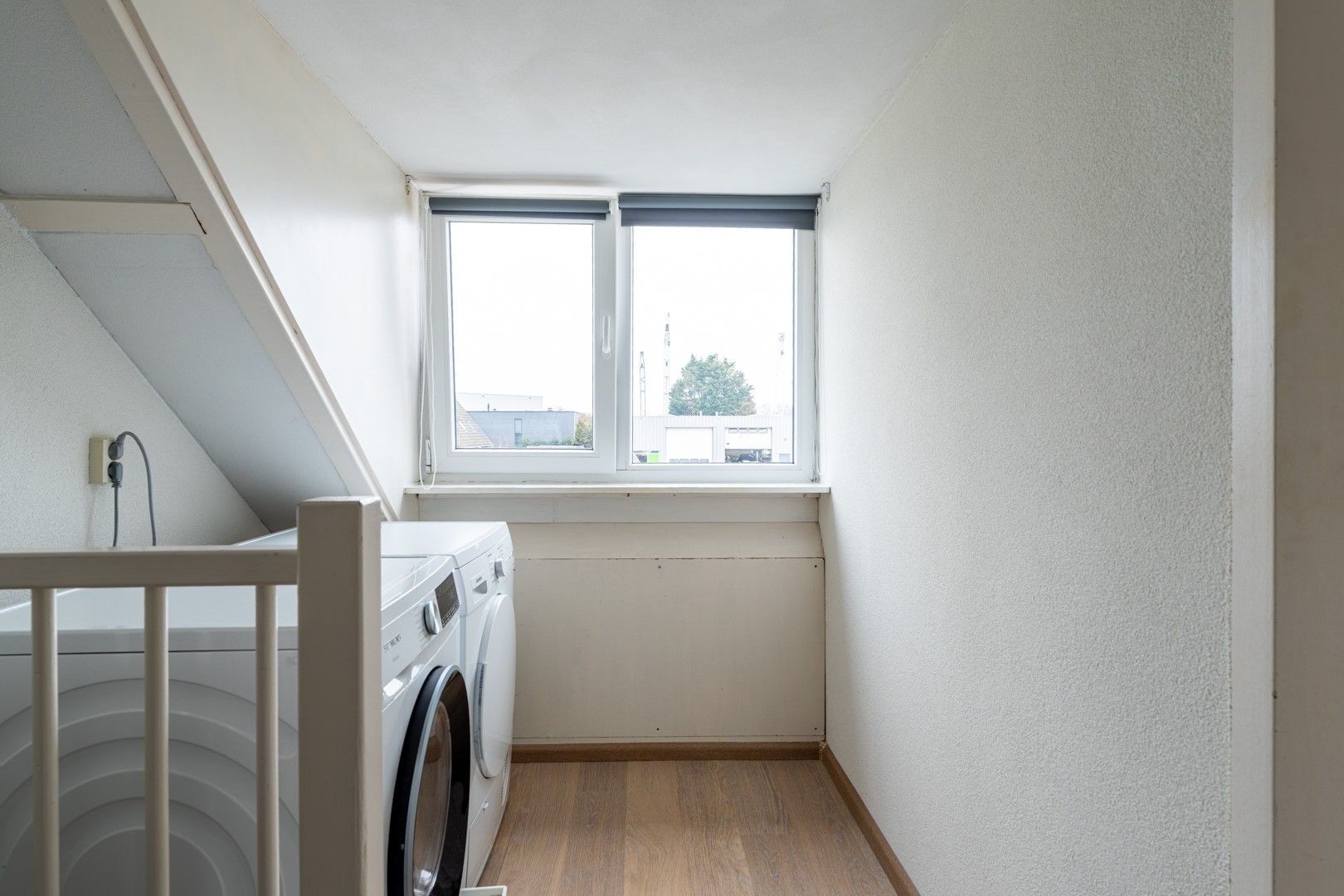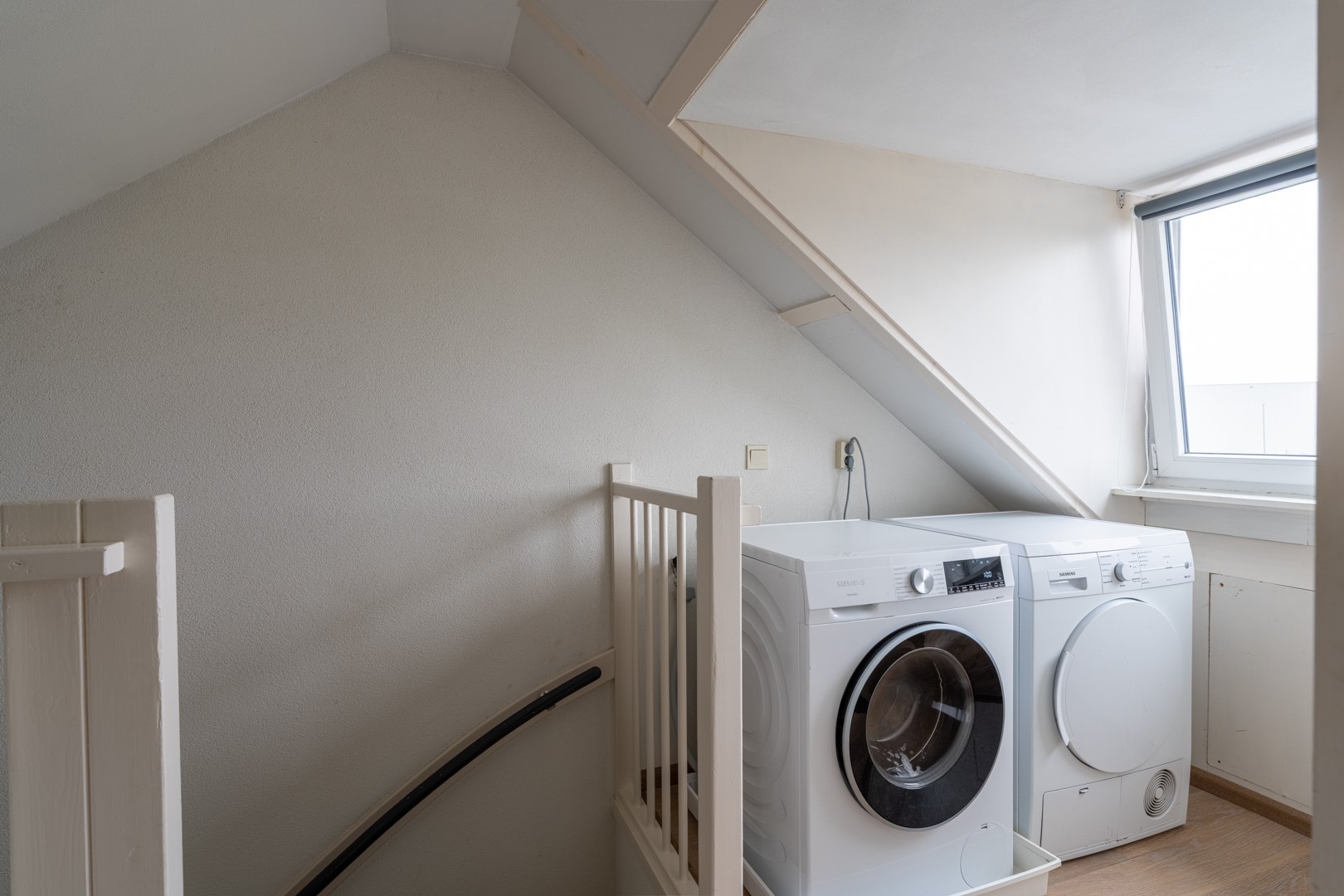 Via de vaste trap bereik je de tweede verdieping: een handige voorzolder met de opstelling van de wasmachine en droger achter deze handige voorzolder bevindt zich de vierde slaapkamer.