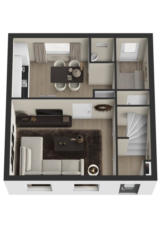 Je komt binnen via de hal met vaste trap naar de verdieping. De woonkamer is heerlijk licht en biedt voldoende ruimte voor een gezellige zithoek. De woonkeuken vormt het hart van het huis en is voorzien van een complete keukenopstelling met onder andere een 5-pits fornuis met oven, koelkast, vaatwasser en afzuigkap. Hier is ook plek voor een ruime eettafel. Vanuit de keuken bereik je het achterportaal met toilet en toegang tot de praktische kelder – ideaal als extra bergruimte.