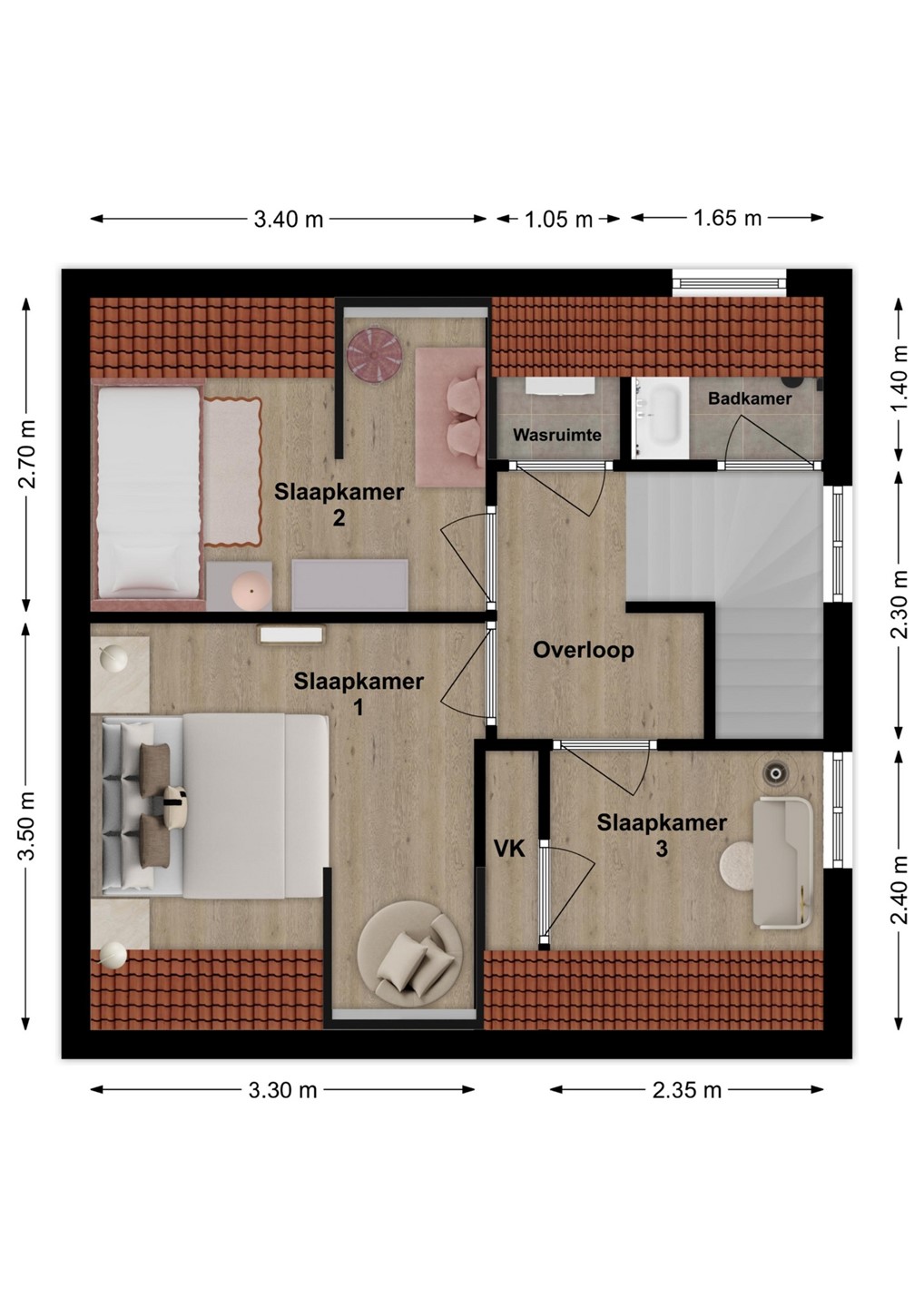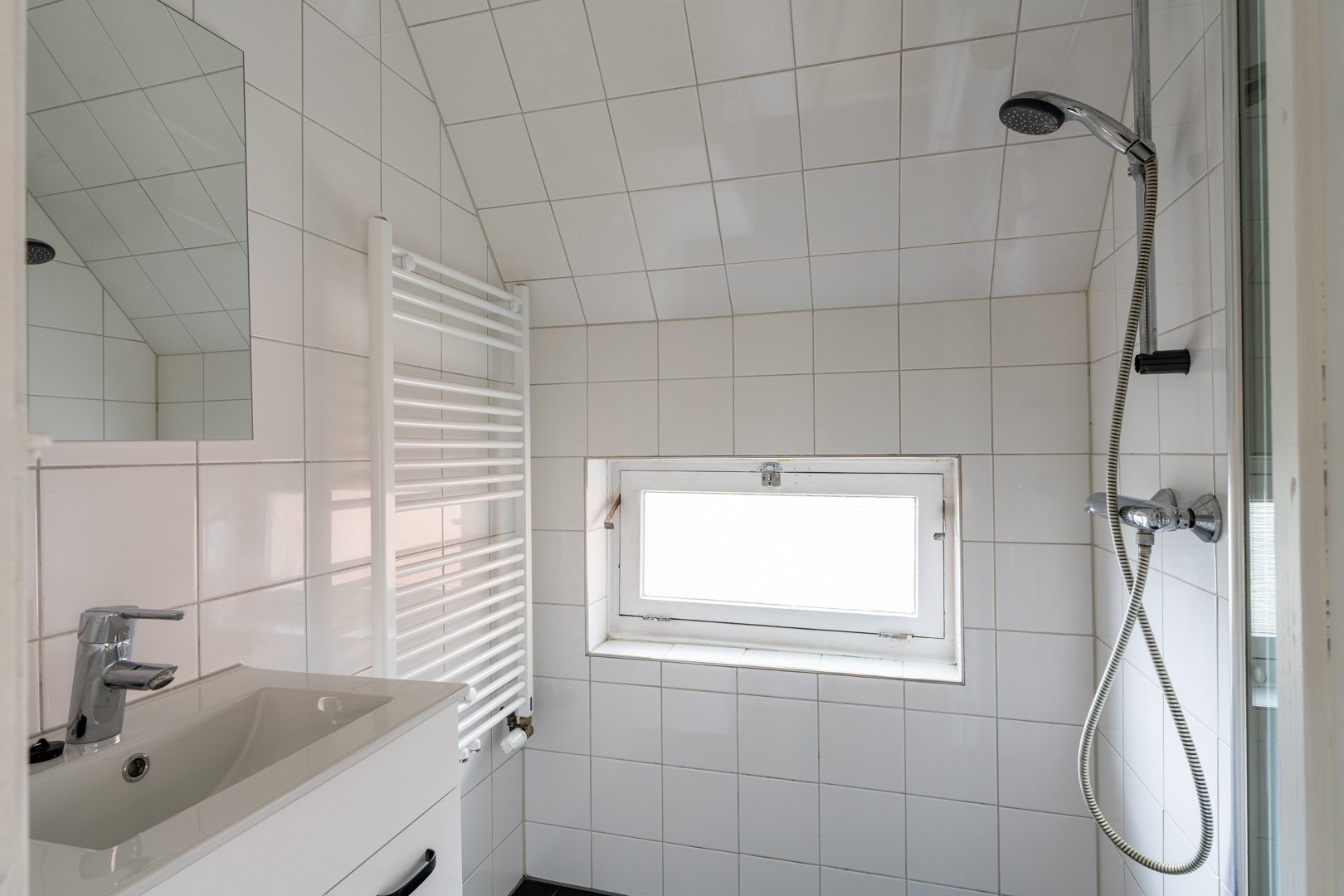 Op de eerste verdieping bevinden zich drie keurige slaapkamers. De overloop beschikt over een washoek en een grote vaste kast, waar eventueel een tweede toilet gerealiseerd kan worden. De badkamer is eenvoudig maar functioneel ingericht met een douche en wastafel.Via een losse trap is de ruime bergzolder bereikbaar. Hier bevindt zich de cv-installatie en volop extra opslagruimte.
