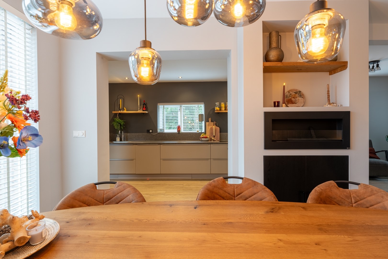 Via de entree kom je direct in de ruime woonkamer en bij de trapopgang naar de verdieping. Onder de trap bevindt zich een praktische kelderruimte. De woonkamer is heerlijk ruim, voorzien van vloerverwarming en strak afgewerkt. Openslaande tuindeuren verbinden binnen moeiteloos met het zonneterras en bij de eethoek zorgt een sfeervolle sierhaard voor extra gezelligheid.