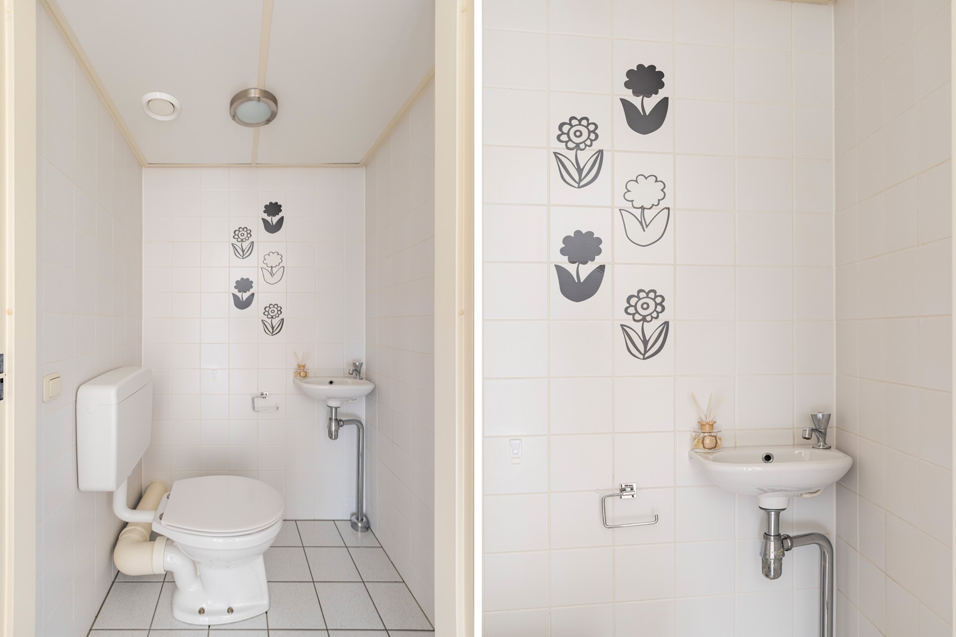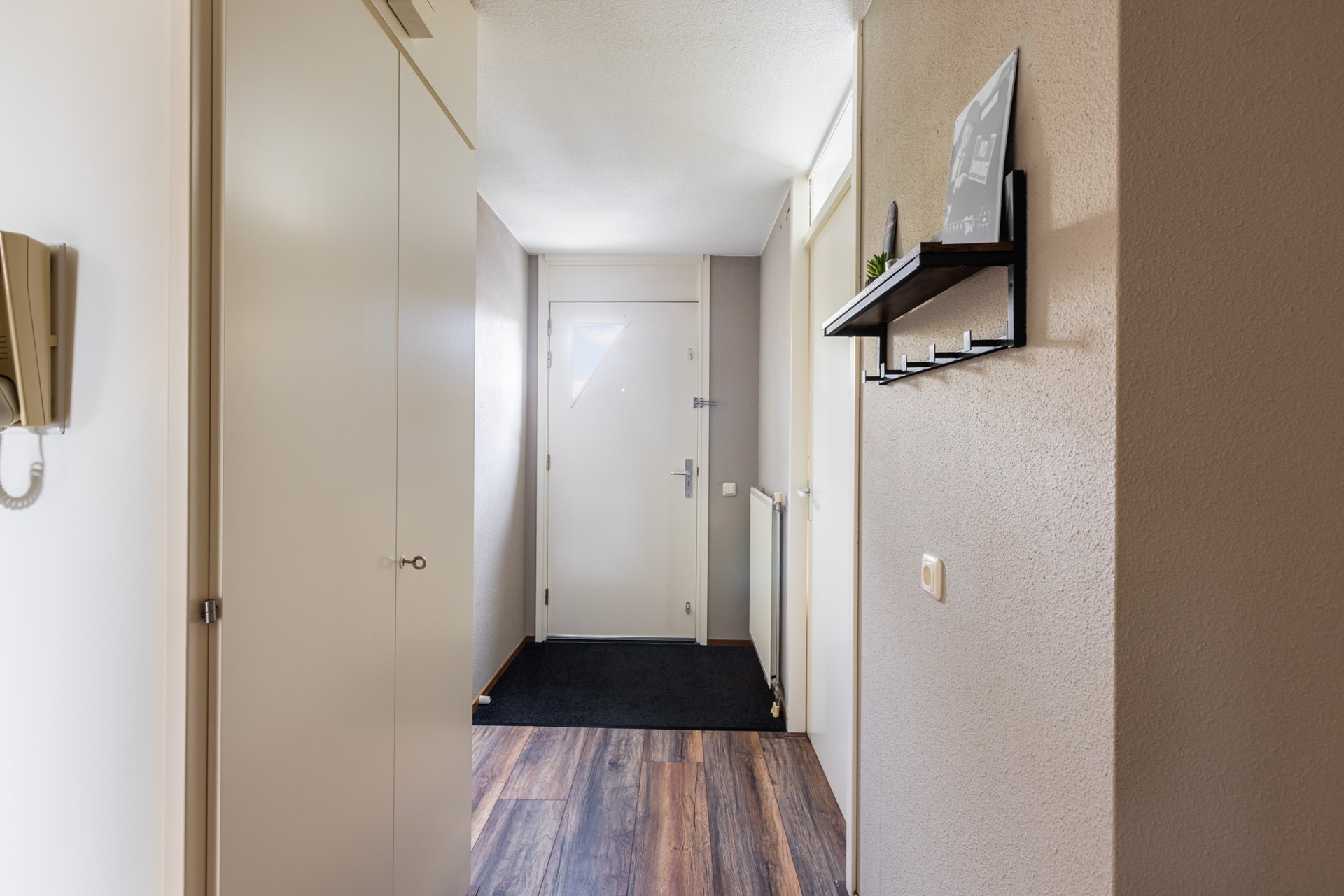 De centrale entree bevindt zich op de begane grond, waar ook de brievenbussen zijn gesitueerd. Via het trappenhuis of de lift bereik je de tweede verdieping. Bij binnenkomst kom je in de hal, die toegang biedt tot de bijkeuken, werkkamer, het toilet en de woonkamer. De woonkamer is aangenaam licht en voelt direct ruim aan. Via de schuifpui stap je zo het balkon op — een fijne verlenging van je leefruimte. Daarnaast is er praktische vaste kastruimte aanwezig.