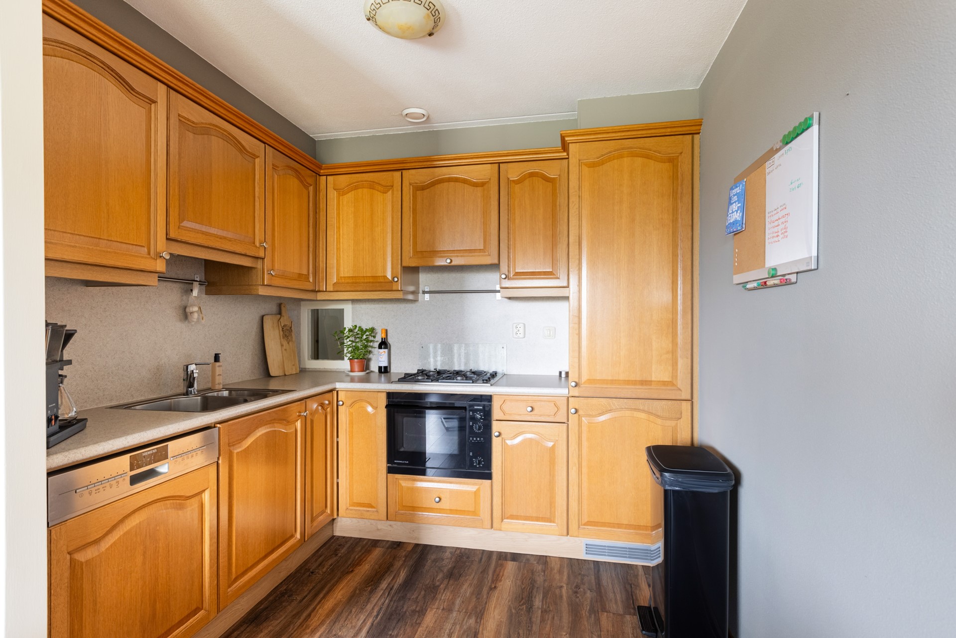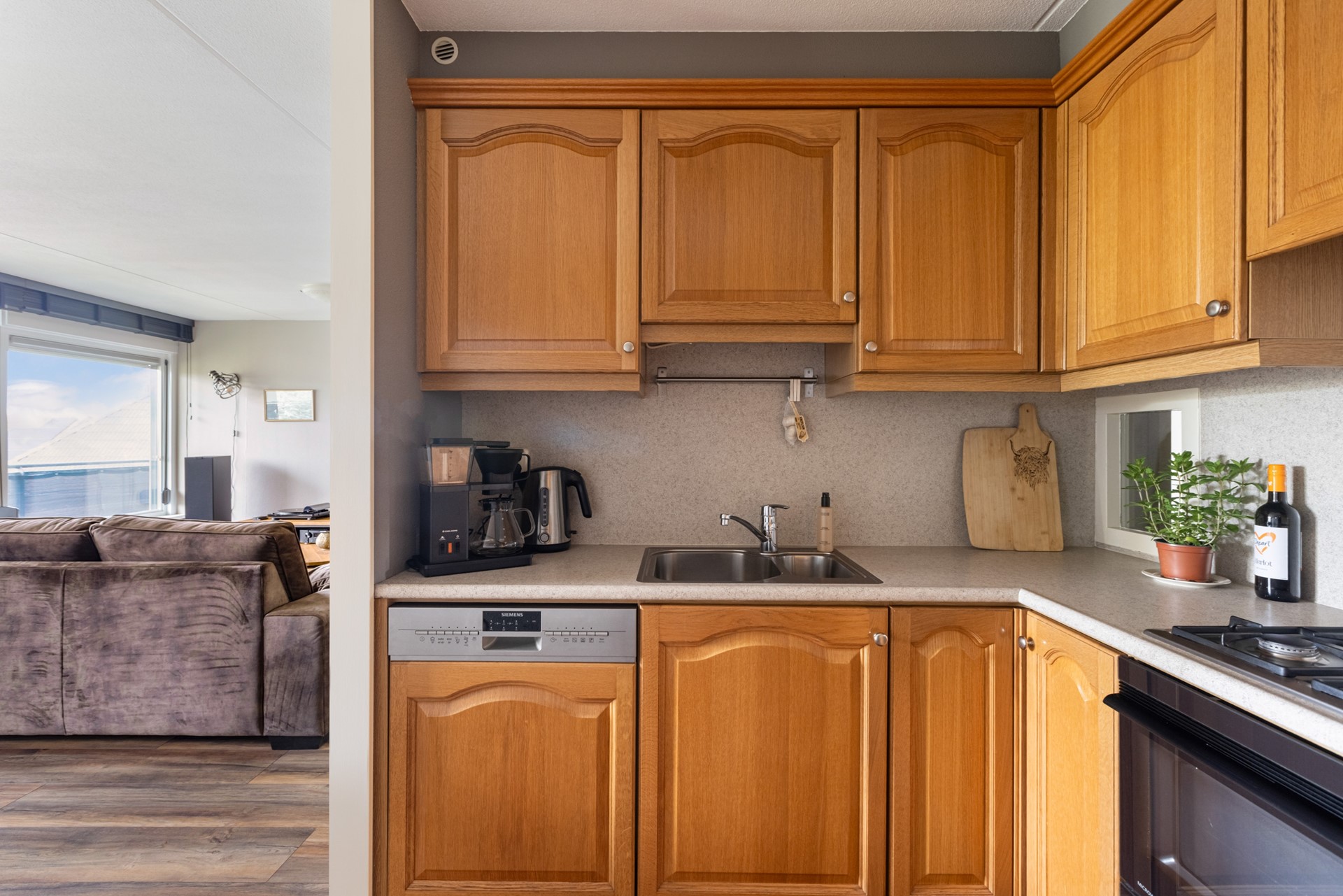 De keuken is uitgevoerd in een warme eikenhouten hoekopstelling en uitgerust met diverse inbouwapparatuur, zoals een koelkast, vriezer, gaskookplaat, combimagnetron, afzuigkap en vaatwasser. Alles wat je nodig hebt om comfortabel te koken is hier aanwezig.