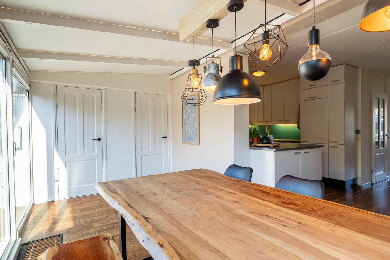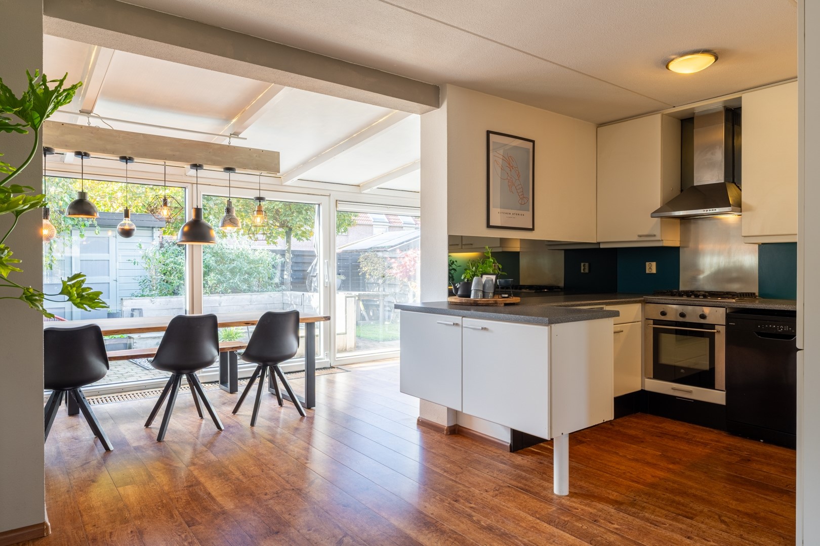 Achter de keuken ligt de serre: een zee van licht dankzij grote raampartijen en een schuifpui naar de tuin. Dé plek voor een extra eettafel, een leeshoek of om gewoon even te genieten van het buitengevoel met binnencomfort.