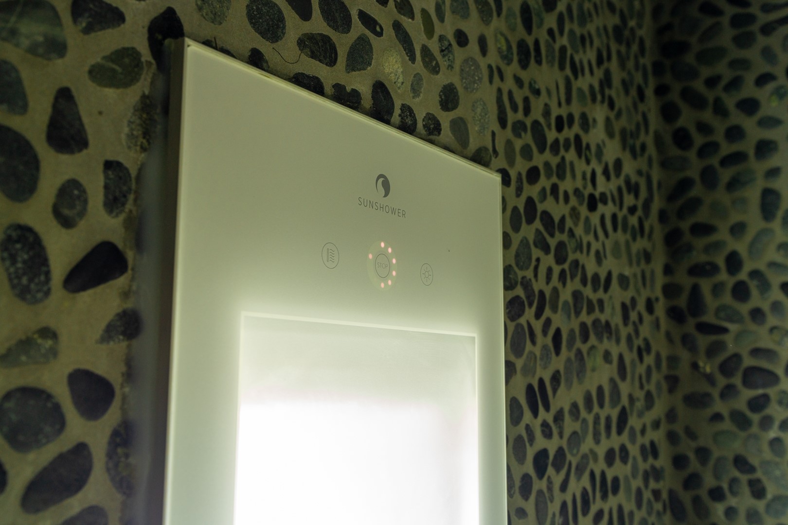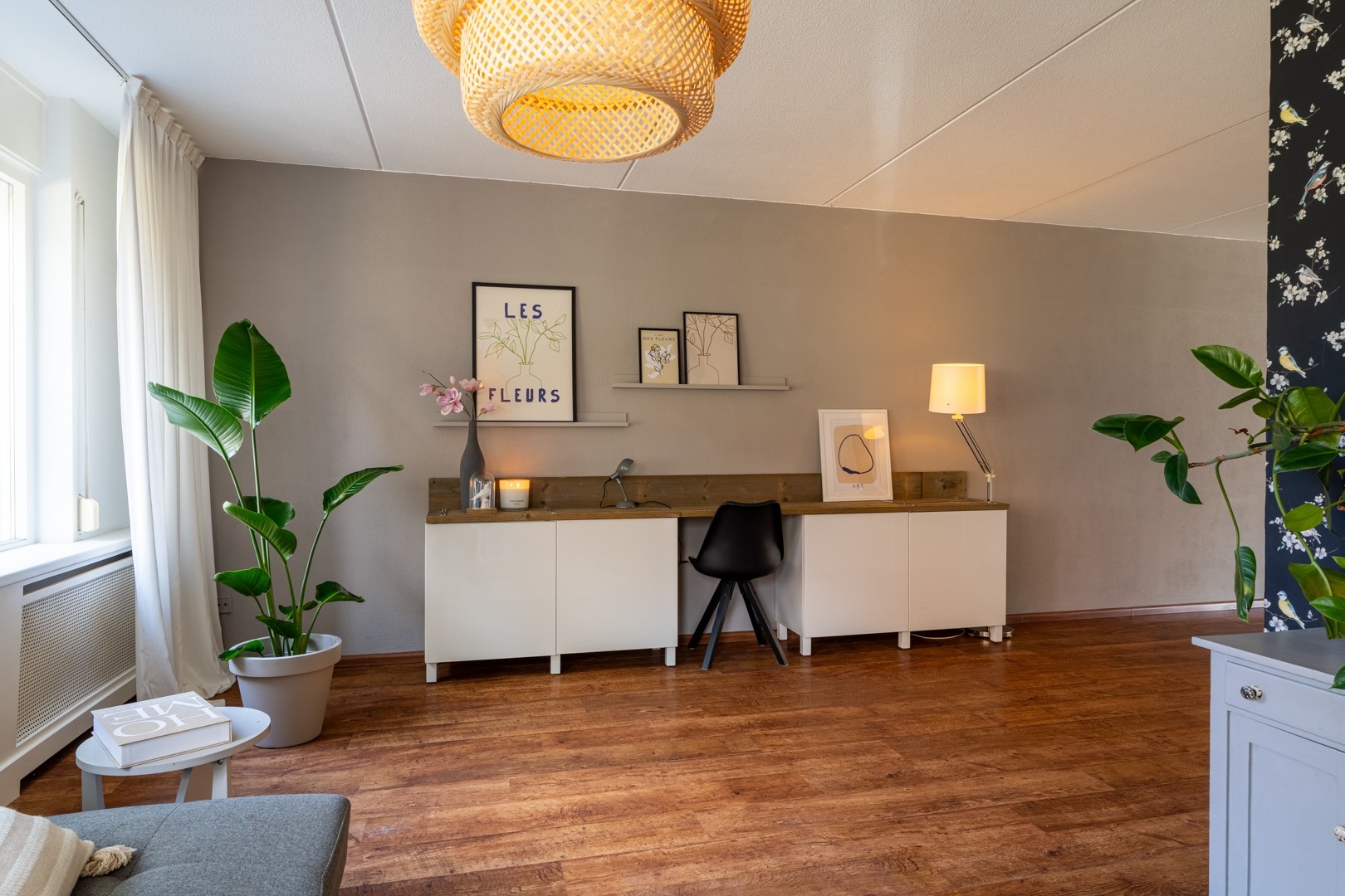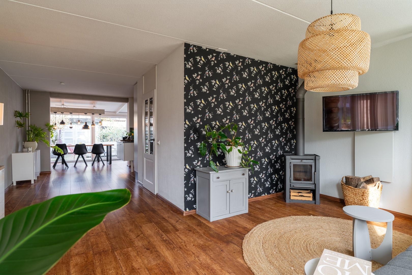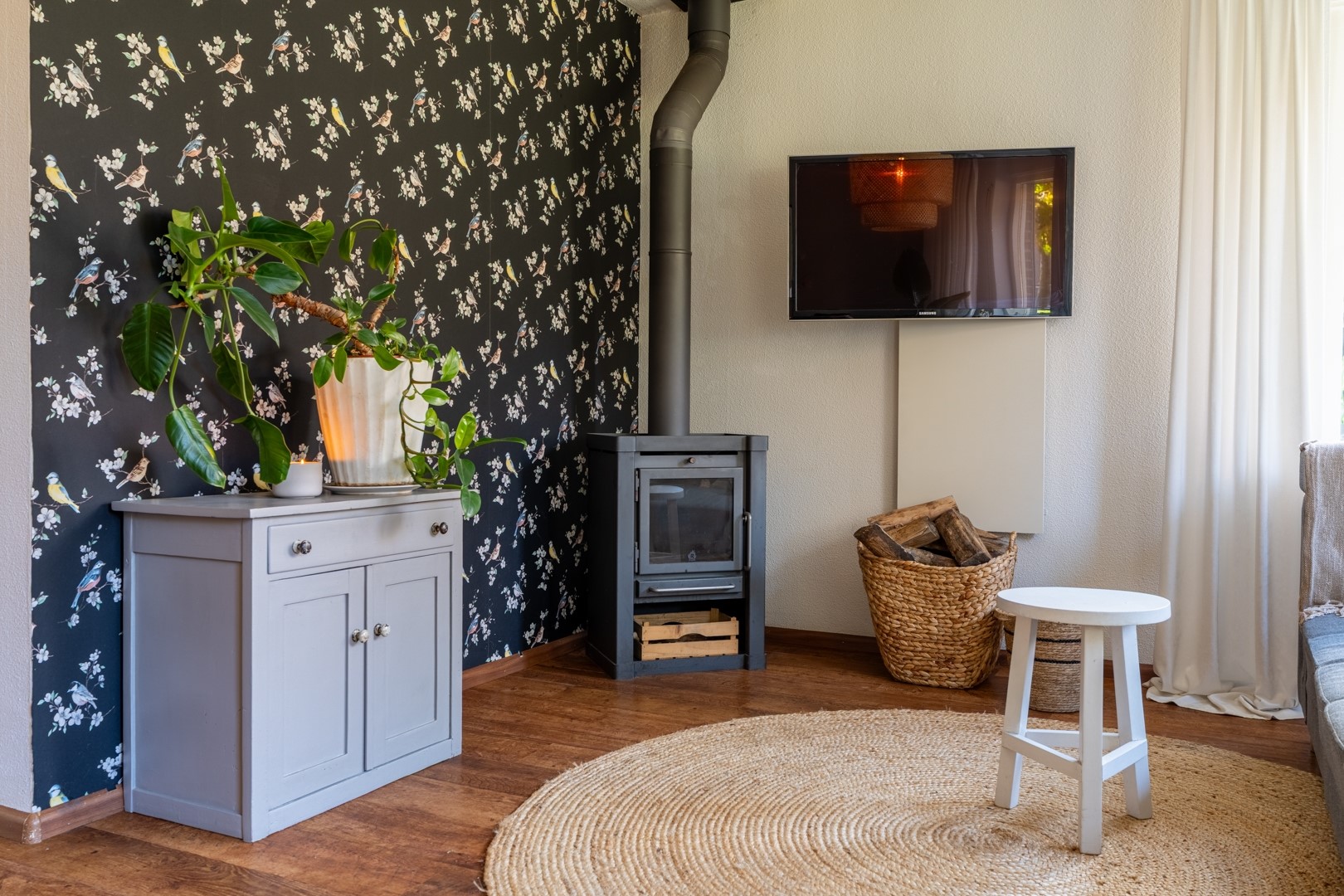 De woonkamer aan de voorzijde van het huis is lekker licht en biedt een fijn uitzicht over het groene plantsoen. Dankzij de houtkachel wordt het hier al snel knus en gezellig. Met rolluiken aan de voorzijde bepaal je zelf hoeveel licht en privacy je wilt – én houd je de hitte buiten op warme dagen.