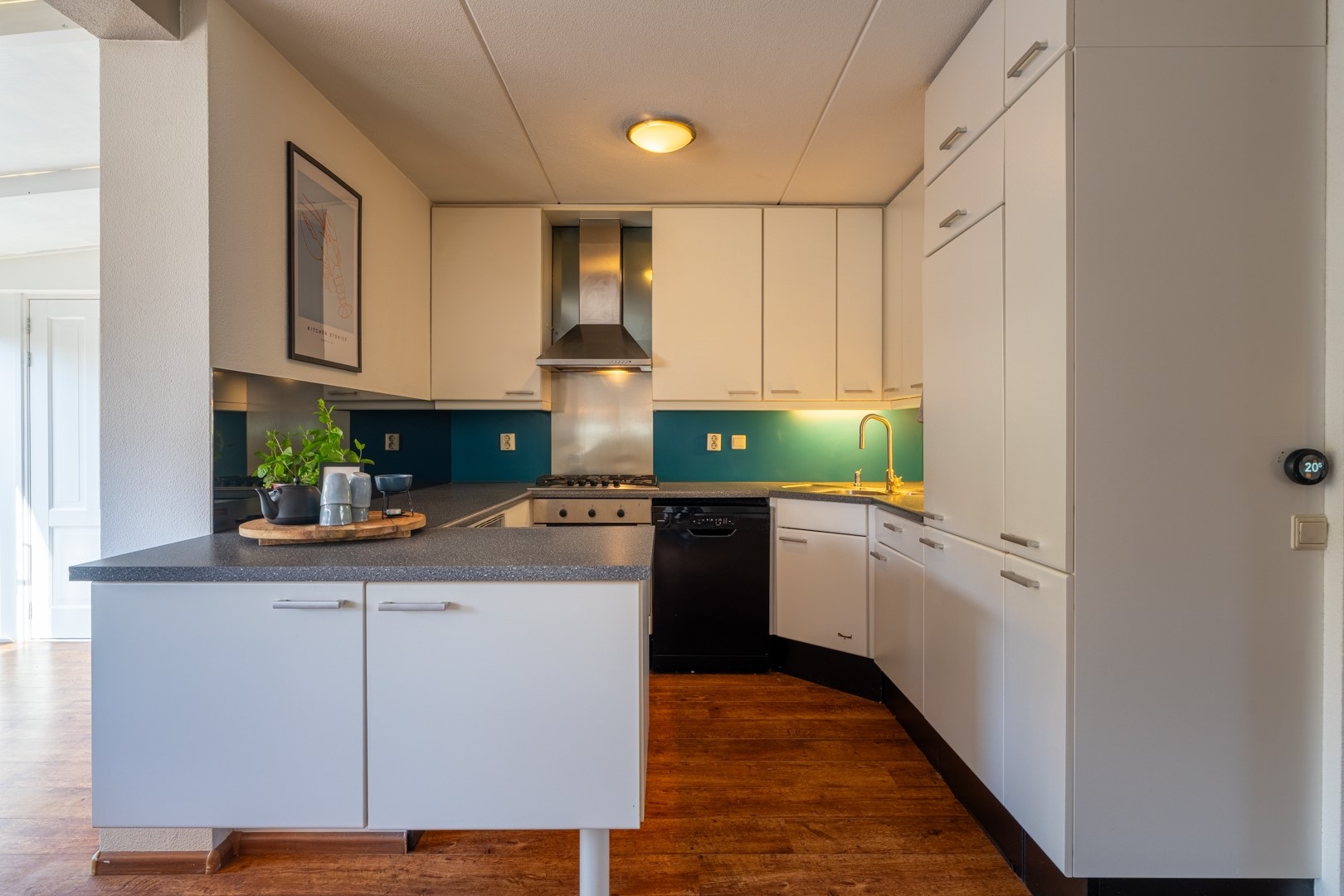 De centraal gelegen keuken is U-vormig opgezet in een neutrale kleur, met alles wat je nodig hebt binnen handbereik. Denk aan een 5-pits gaskookplaat, oven, magnetron, afzuigkap, koelkast en vaatwasser. Leuk detail: het eilandje waar je makkelijk serveert of – laten we eerlijk zijn – de vaat even op parkeert.
