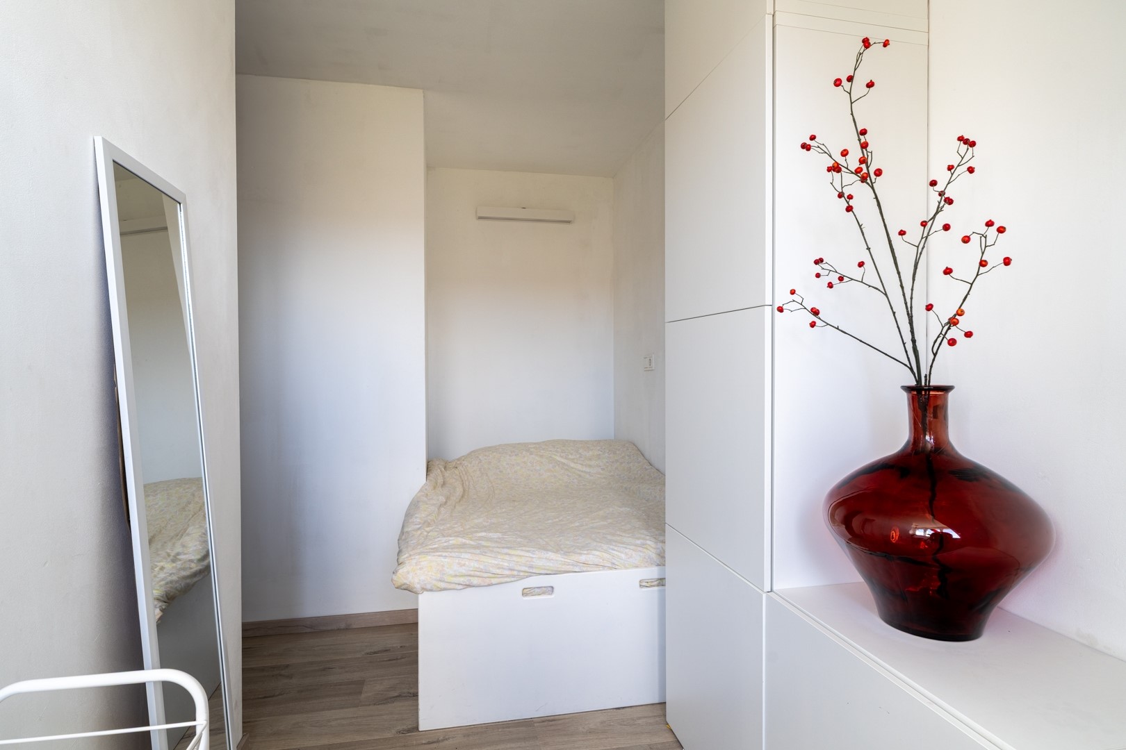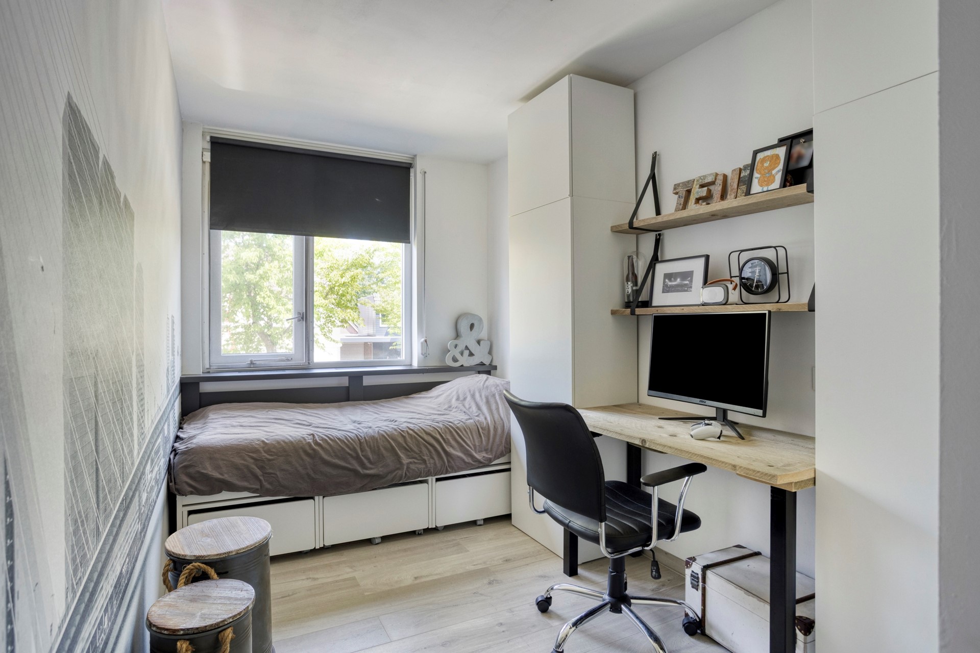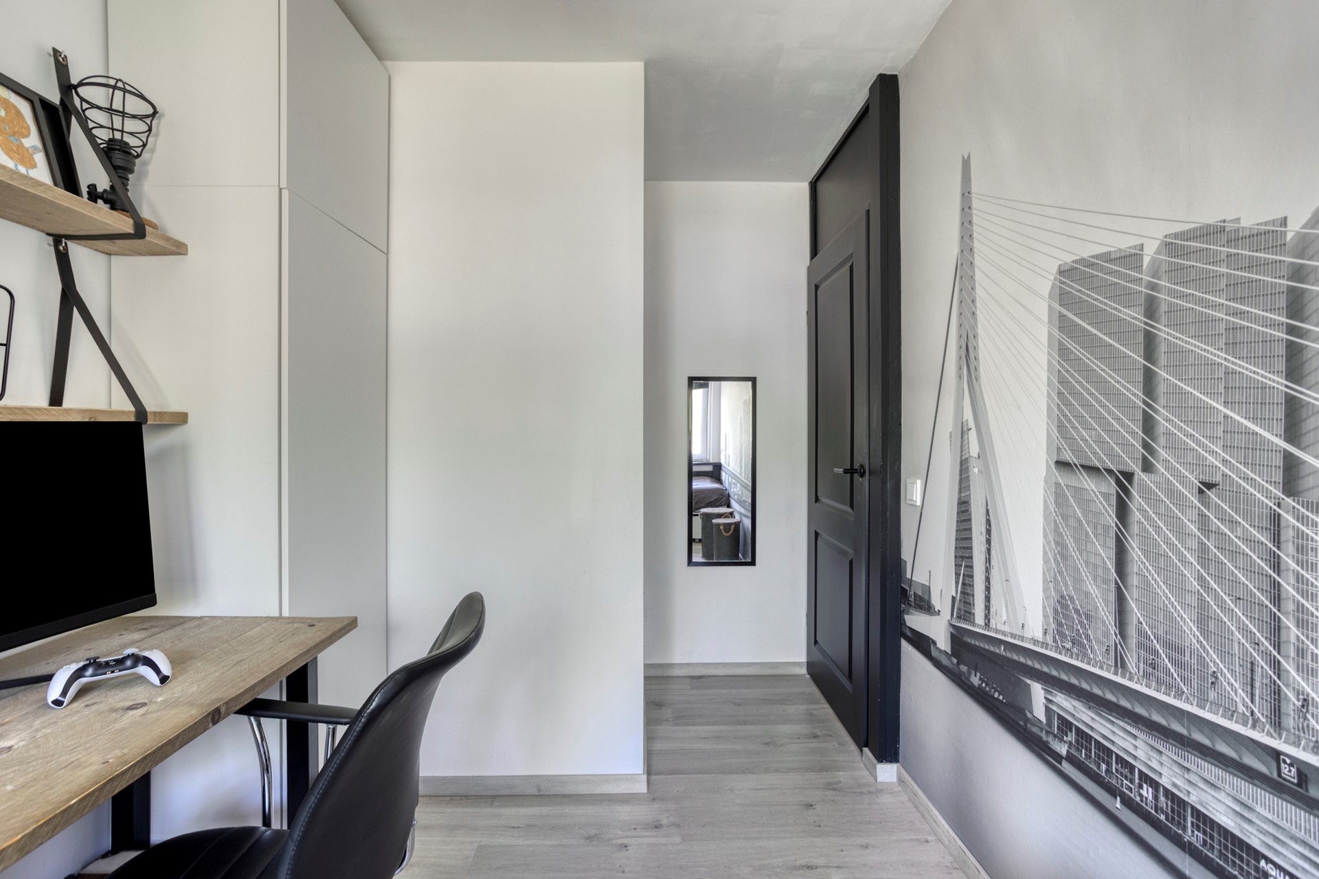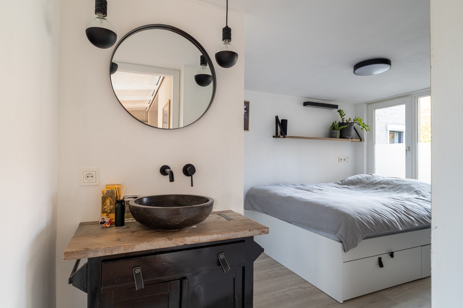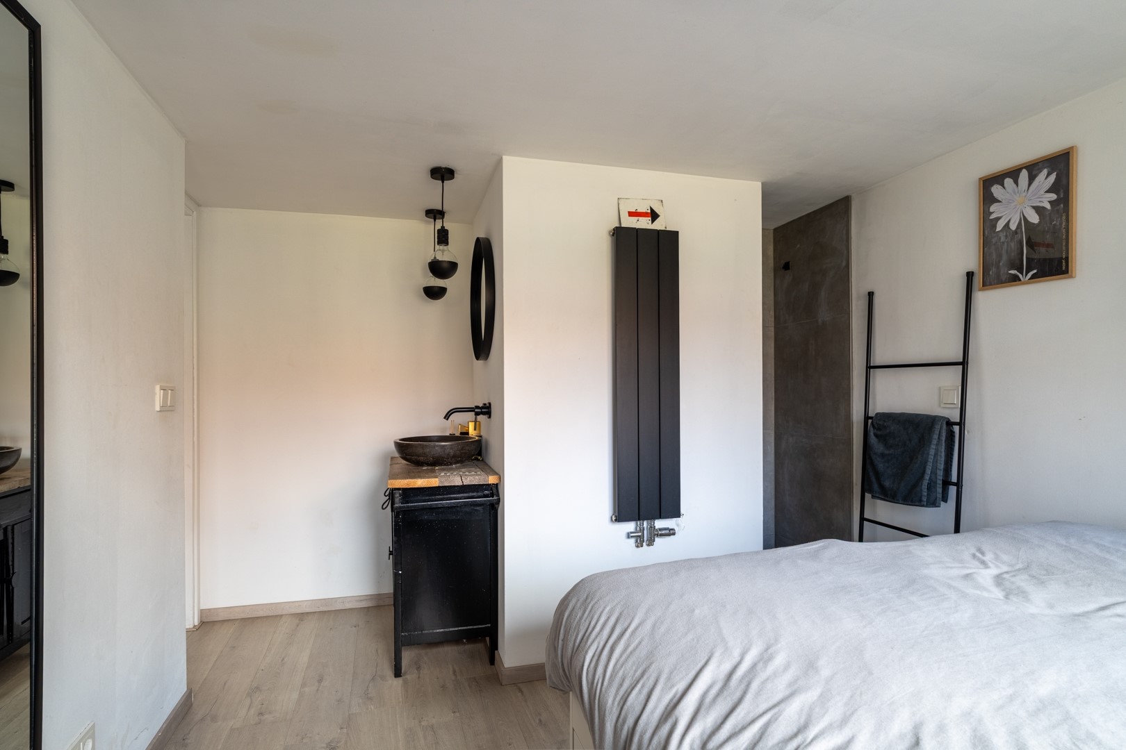 Op de begane grond bevindt zich een slaapkamer met eigen douche en wastafelmeubel – perfect als levensloopbestendige oplossing of als comfortabele logeerkamer. Aangrenzend vind je een praktische bijkeuken met washoek en een grote schuifkastenwand.