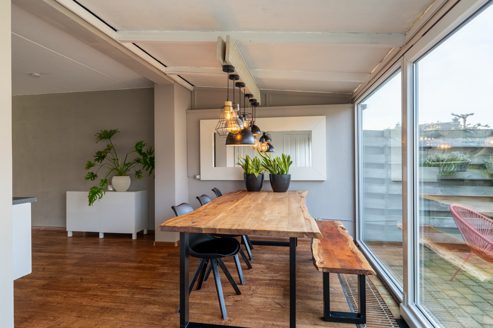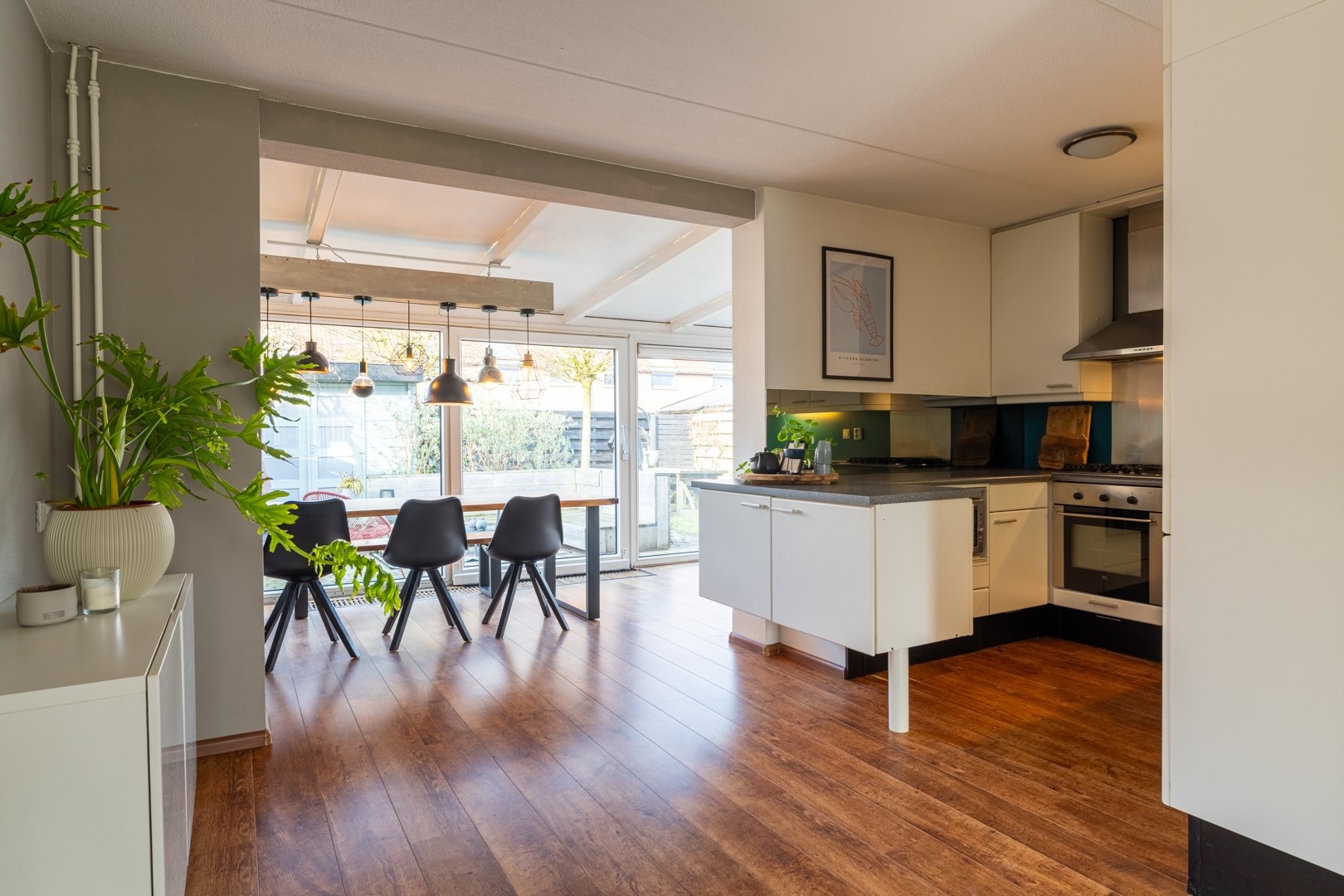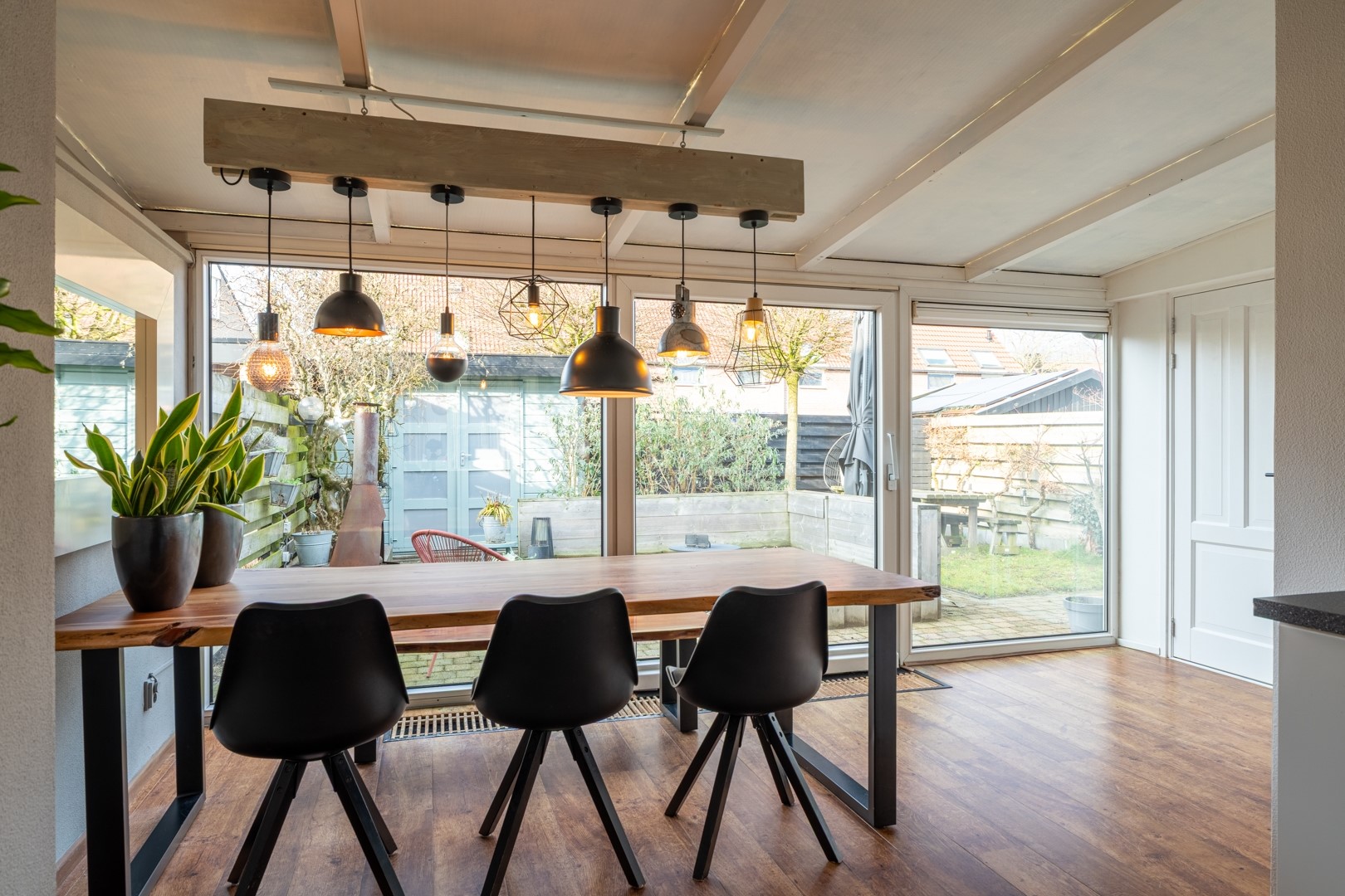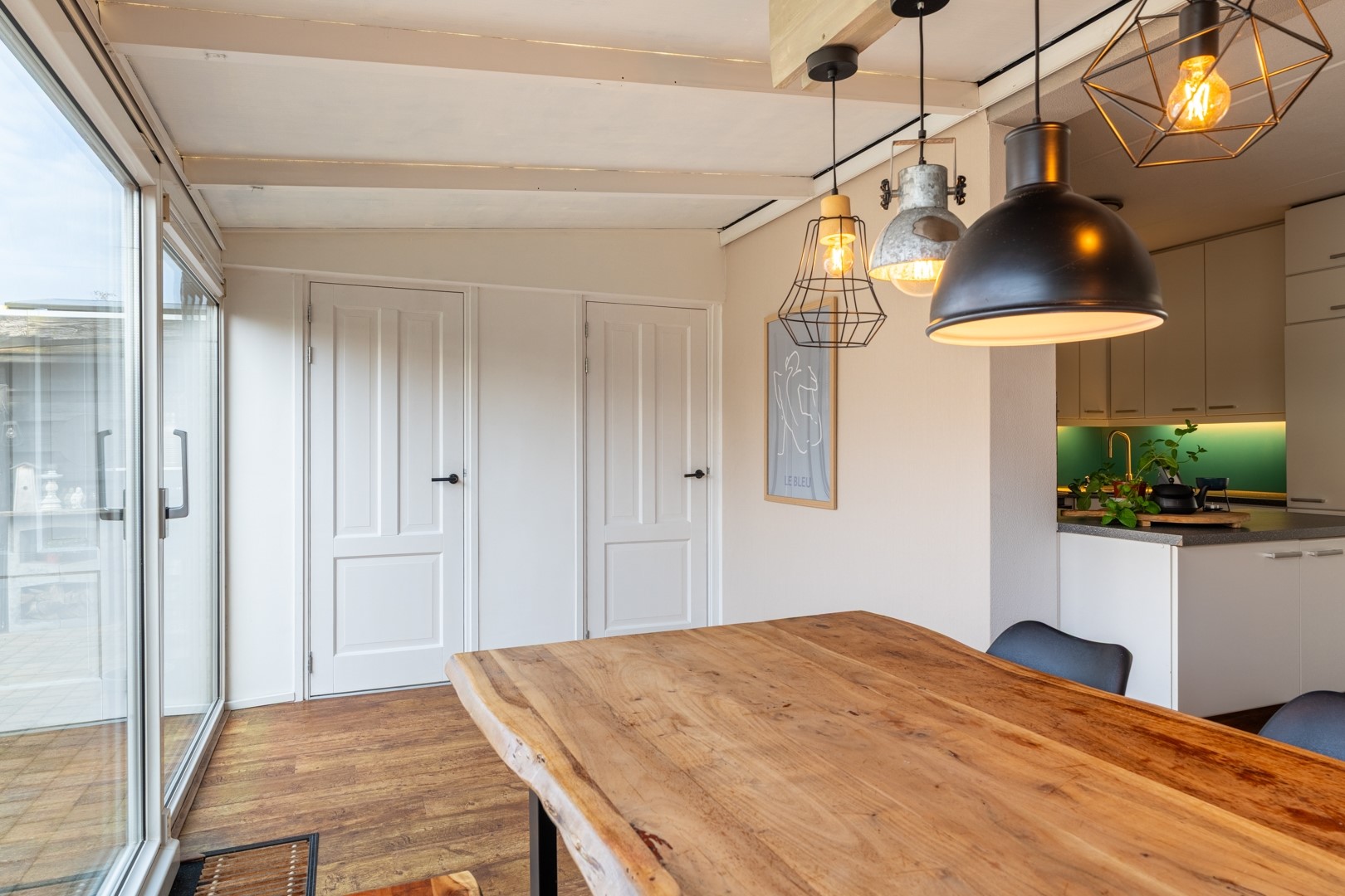 De centraal gelegen keuken is niet gloed nieuw maar leuk opgezet in U-vorm met een neutrale kleur en alles wat je nodig hebt binnen handbereik. Denk aan een 5-pits gaskookplaat, oven, magnetron, afzuigkap, koelkast en vaatwasser. Leuk detail: het eilandje waar je makkelijk serveert of – laten we eerlijk zijn – de vaat even op parkeert. Achter de keuken ligt de grote serre grenzend aan de tuin. Dit is dé plek om heerlijk te dineren of te relaxen met een leeshoek of om gewoon even te genieten van het buitengevoel met binnencomfort.