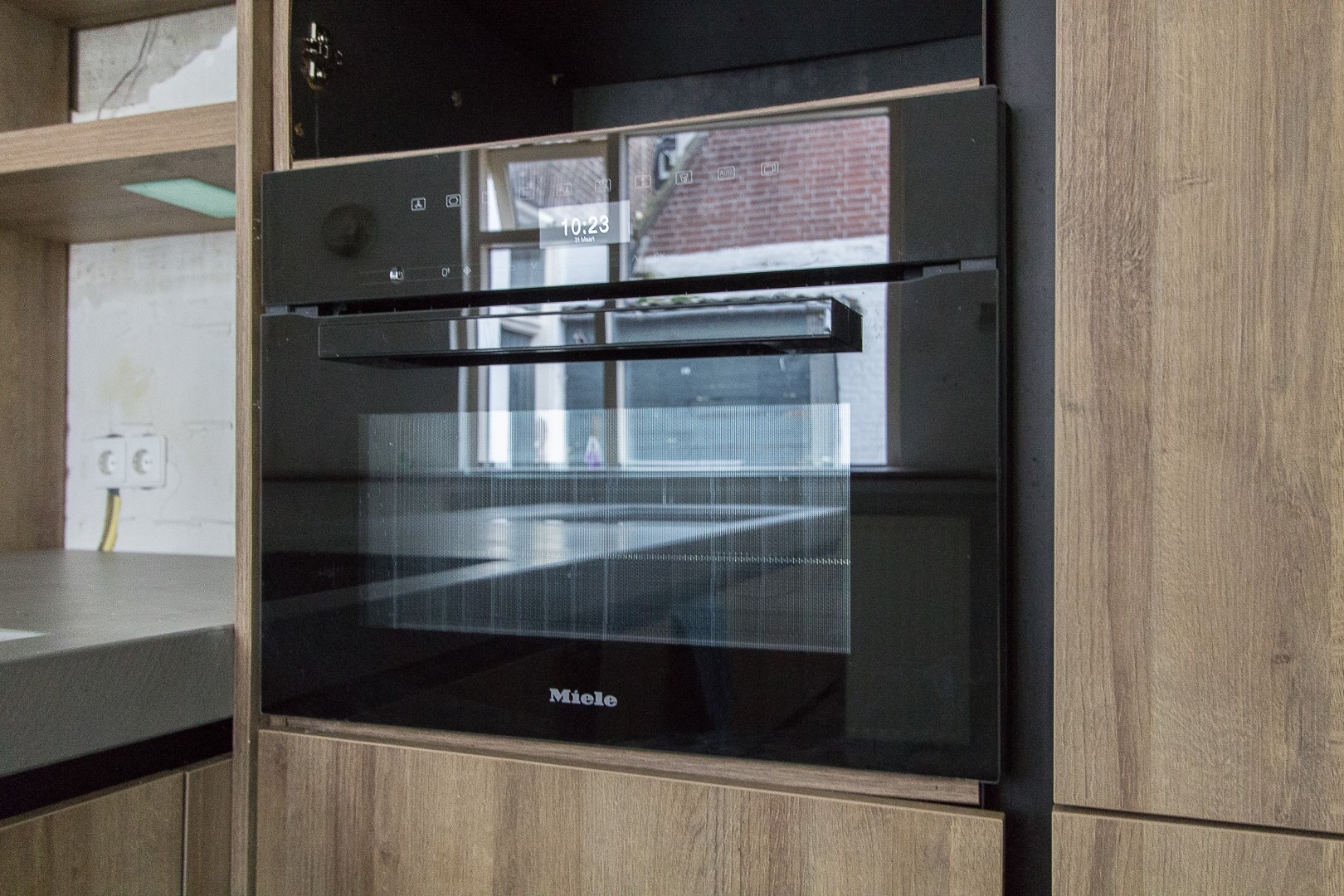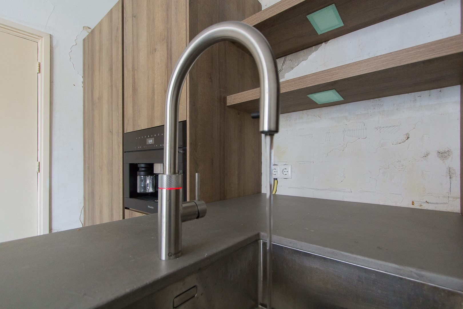 Lange ontvangsthal met trapopgang en meterkast en loopdeur naar de achtertuin, L-vormige woonkamer met gezellige schouw, aan de achterzijde toegang tot de halfopen keuken v.v. moderne en luxe keukenopstelling met sfeervolle eetbar-kookeiland v.v. inbouwapparatuur zoals keramische kookplaat, afzuigkap (geïntegreerd), combimagnetron, vaatwasser, koelkast, vriezer, Quooker en expresso-koffiemachine. Achter de keuken bevindt zich de bijkeuken met wasmachineaansluiting en CV-opstelling (type ATAG, HUUR) en achterdeur naar de tuin, en toegang tot de badkamer met ligbad, wastafel en toilet (= defect).