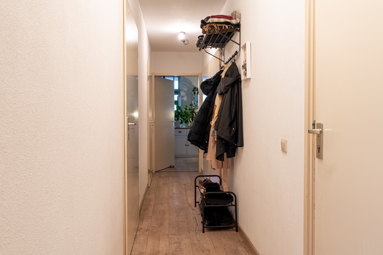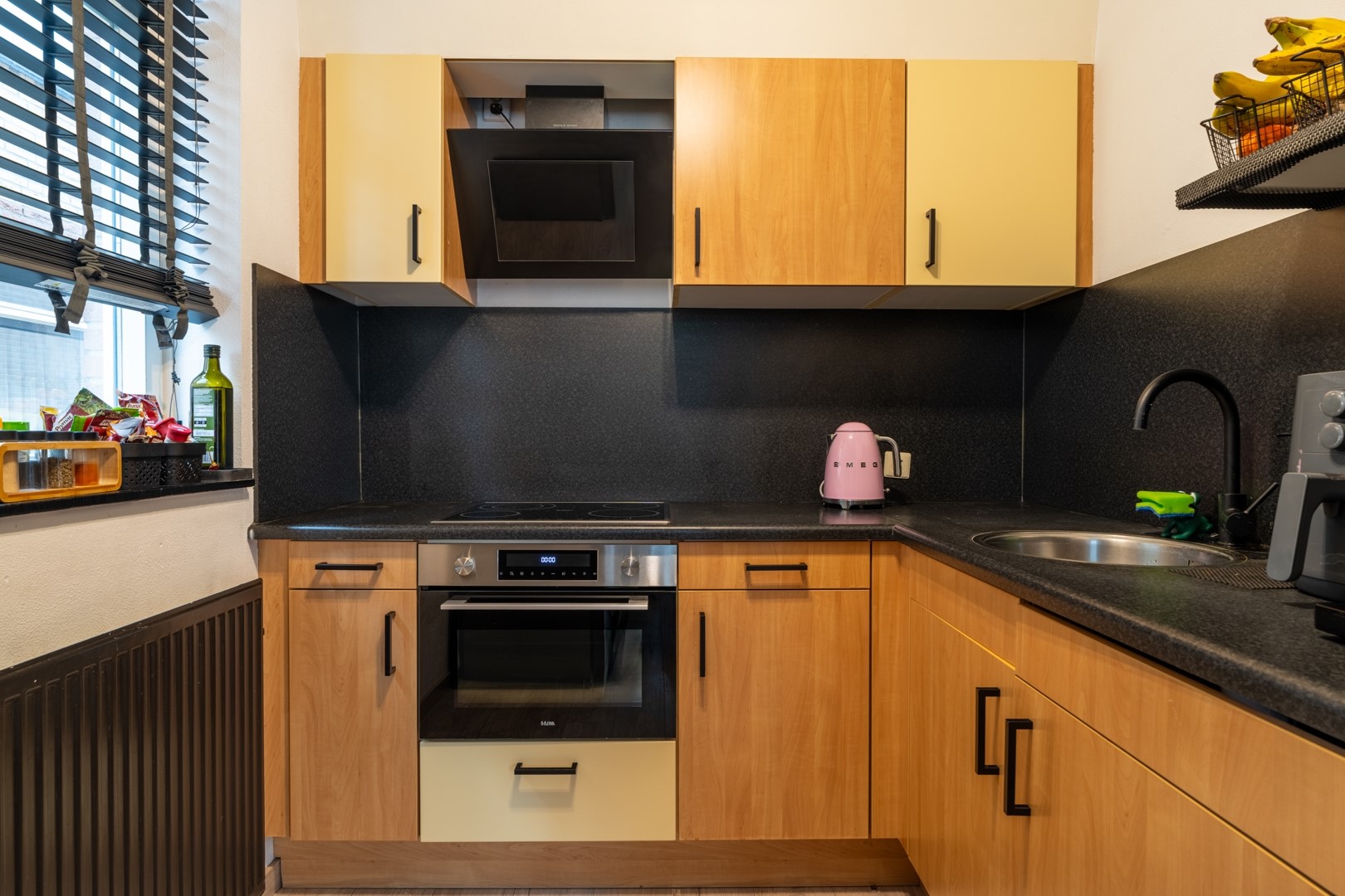 De woonkamer is door de hoekligging extra licht en biedt voldoende ruimte voor zowel een zithoek als een eettafel. Via de woonkamer bereik je het balkon aan de voorzijde. De open keuken is ingericht met een praktische hoekopstelling voorzien van kookplaat, oven en afzuigkap.