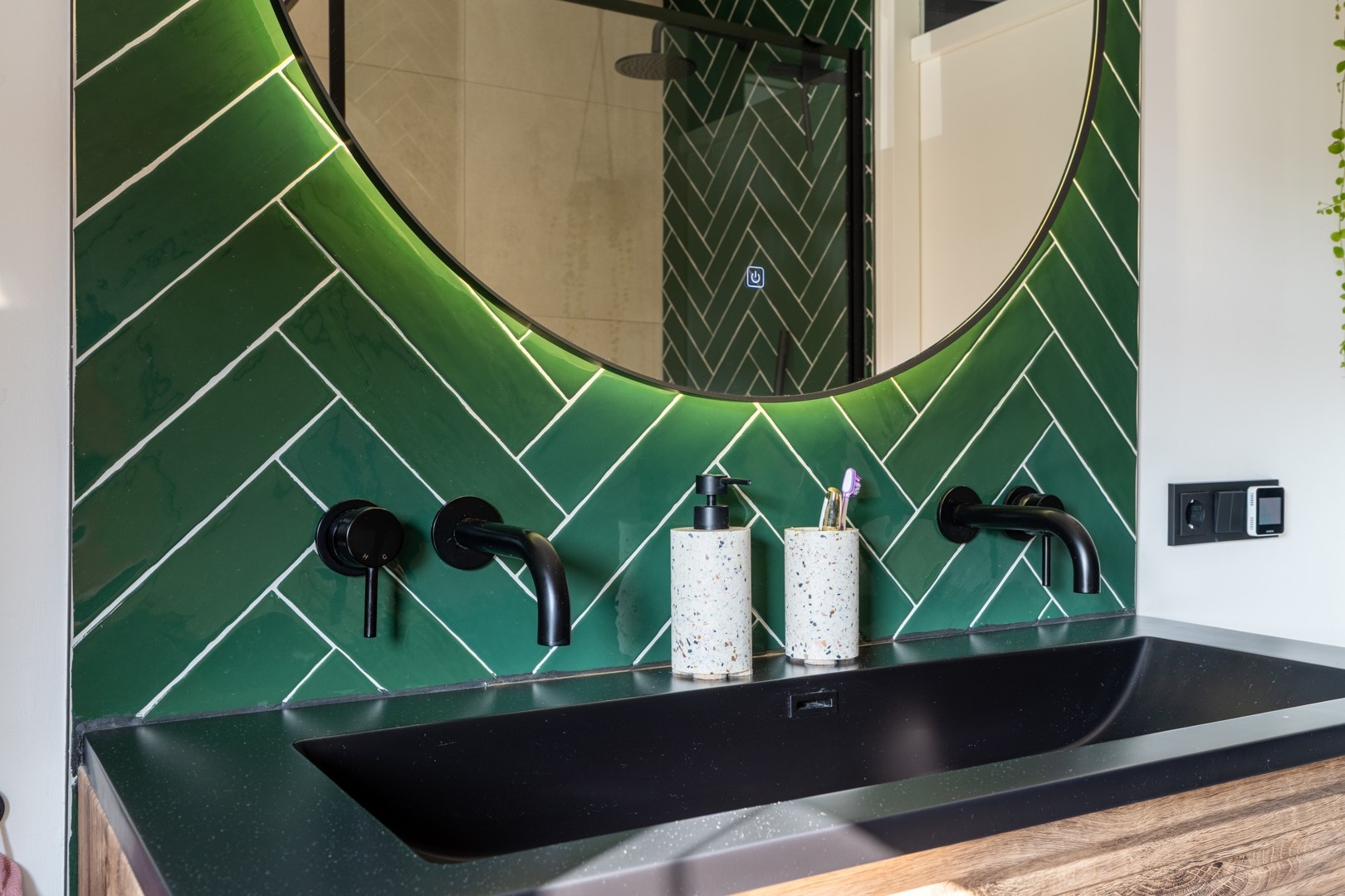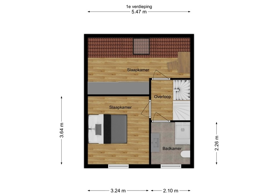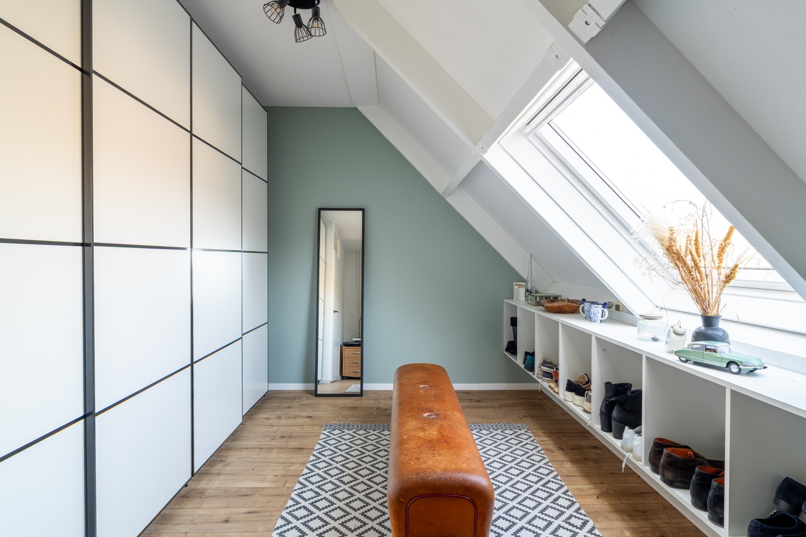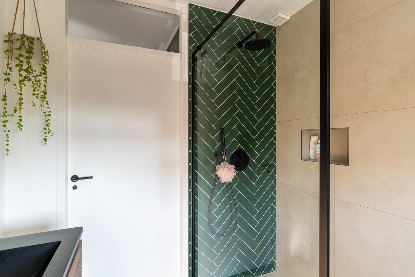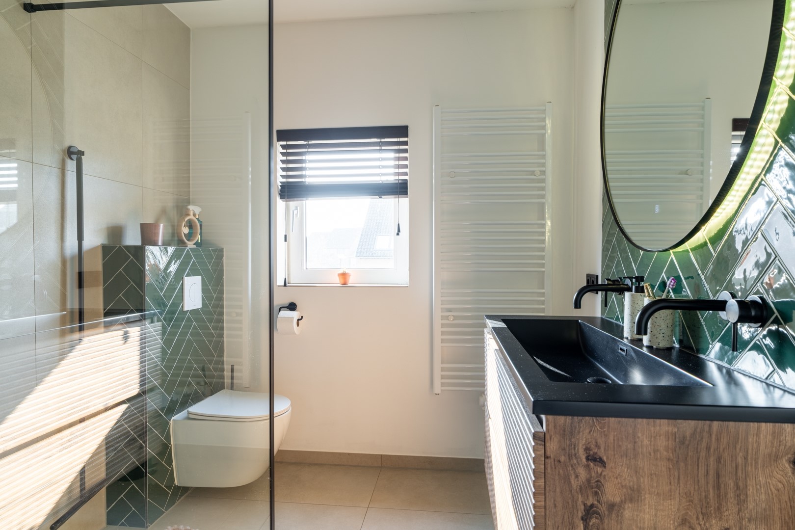 Overloop met trapopgang naar de zolderetage, 2 slaapkamers en badkamer met inloopdouche, wastafelmeubel met dubbele kraan en extra toilet.