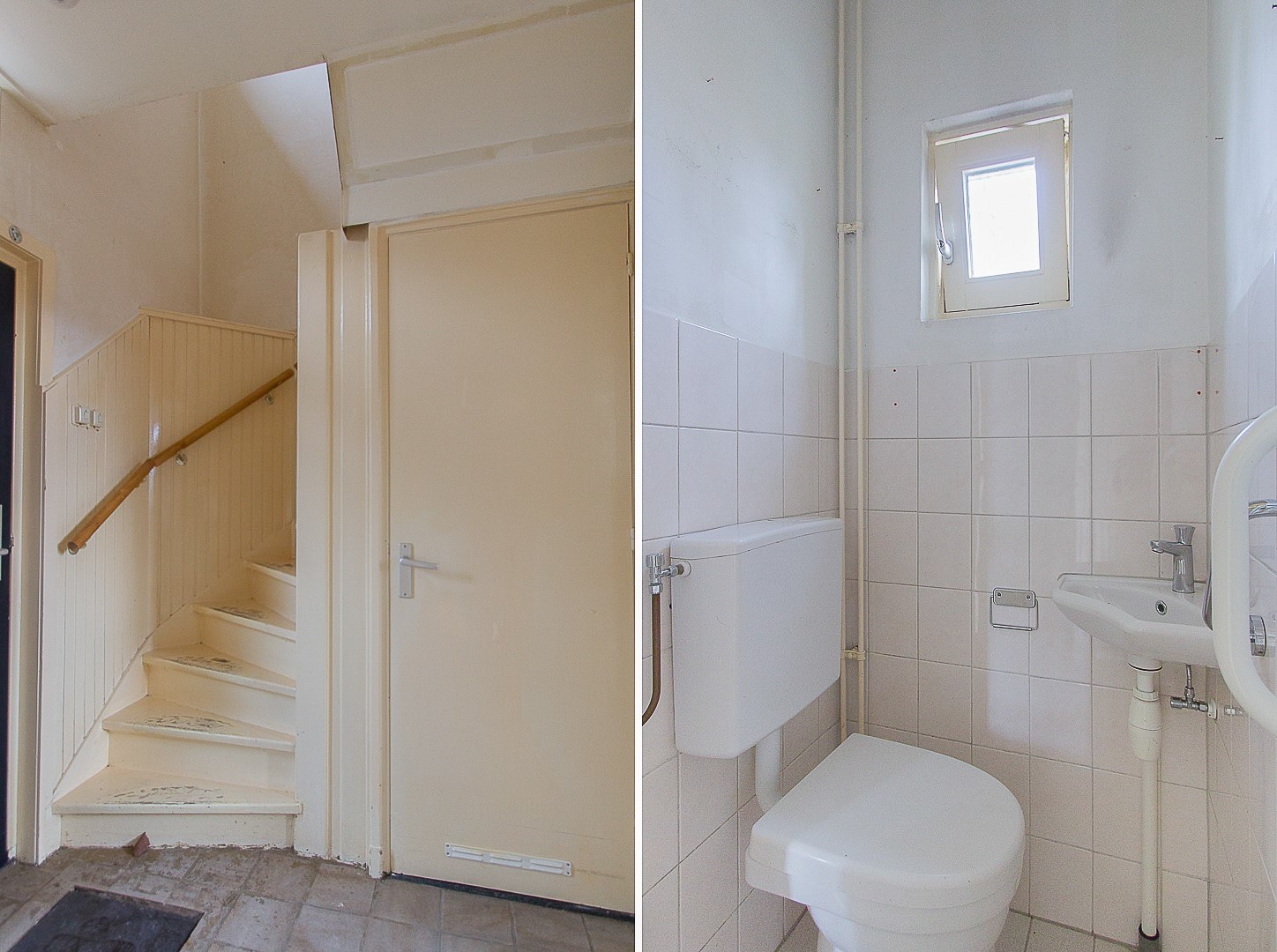 Entree/hal met meterkast en trapkast. Toiletruimte met staand toilet en fonteintje. Woonkamer. Open, eenvoudige keuken met wasmachineaansluiting en een enkele deur naar de tuin.