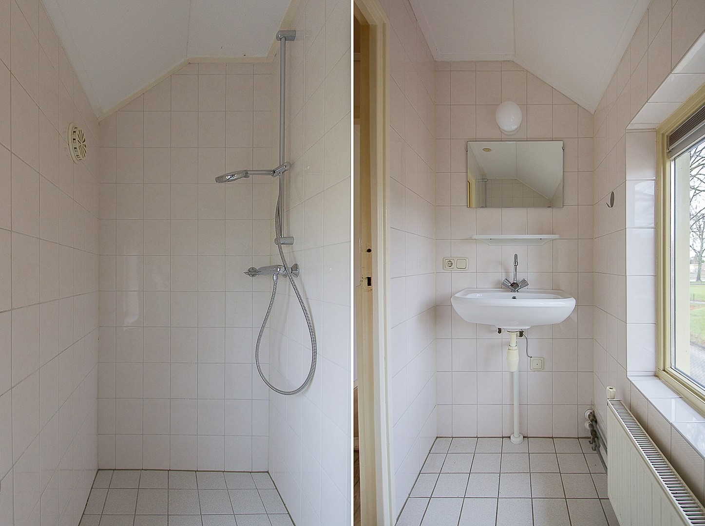 Overloop met toegang tot een bergvliering. Drie slaapkamers, waarvan één met inbouwkast en opstelplaats voor de HR combi-ketel. Eenvoudige badkamer met inloopdouche en wastafel.