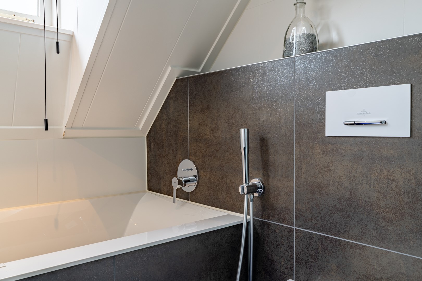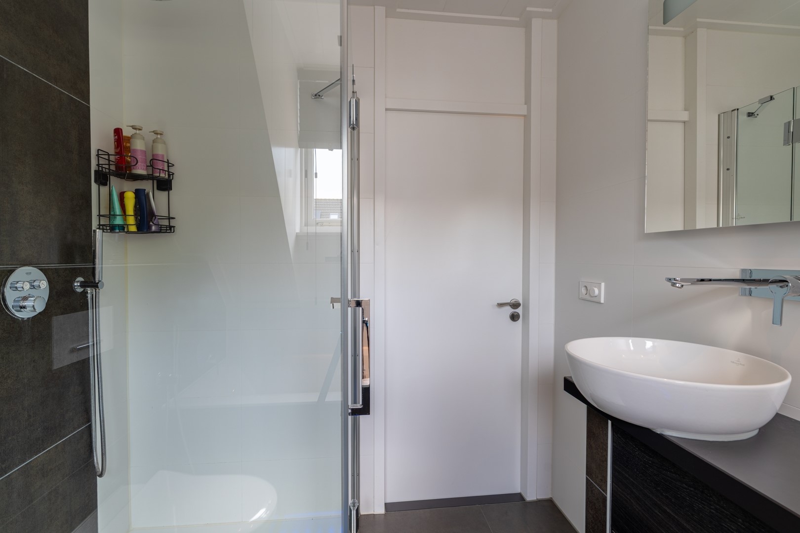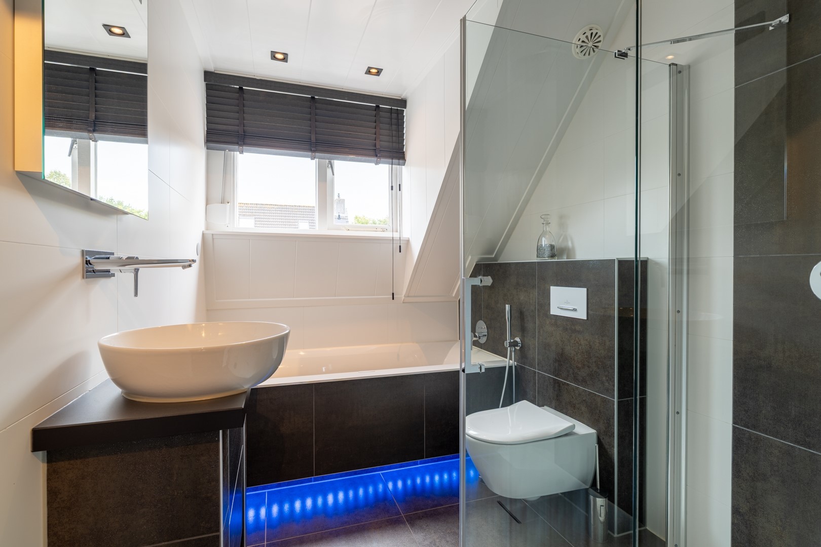 Overloop met vaste trapopgang naar de zolderetage, 2 ruime slaapkamers met eenvoudige mogelijkheid tot 3 en nette en complete badkamer ingedeeld met ligbad, inloopdouche, wastafelmeubel en 2e toilet.