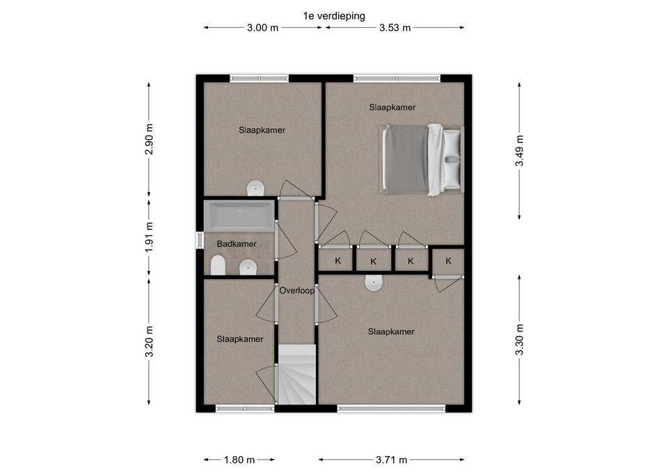 De overloop geeft toegang tot de vier slaapkamers en de badkamer. De slaapkamers zijn van goed formaat en praktisch ingedeeld. De badkamer is netjes uitgevoerd en voorzien van een ligbad, toilet en wastafelmeubel. Via de vaste trap in de slaapkamer aan de voorzijde bereikt u de tweede verdieping.
