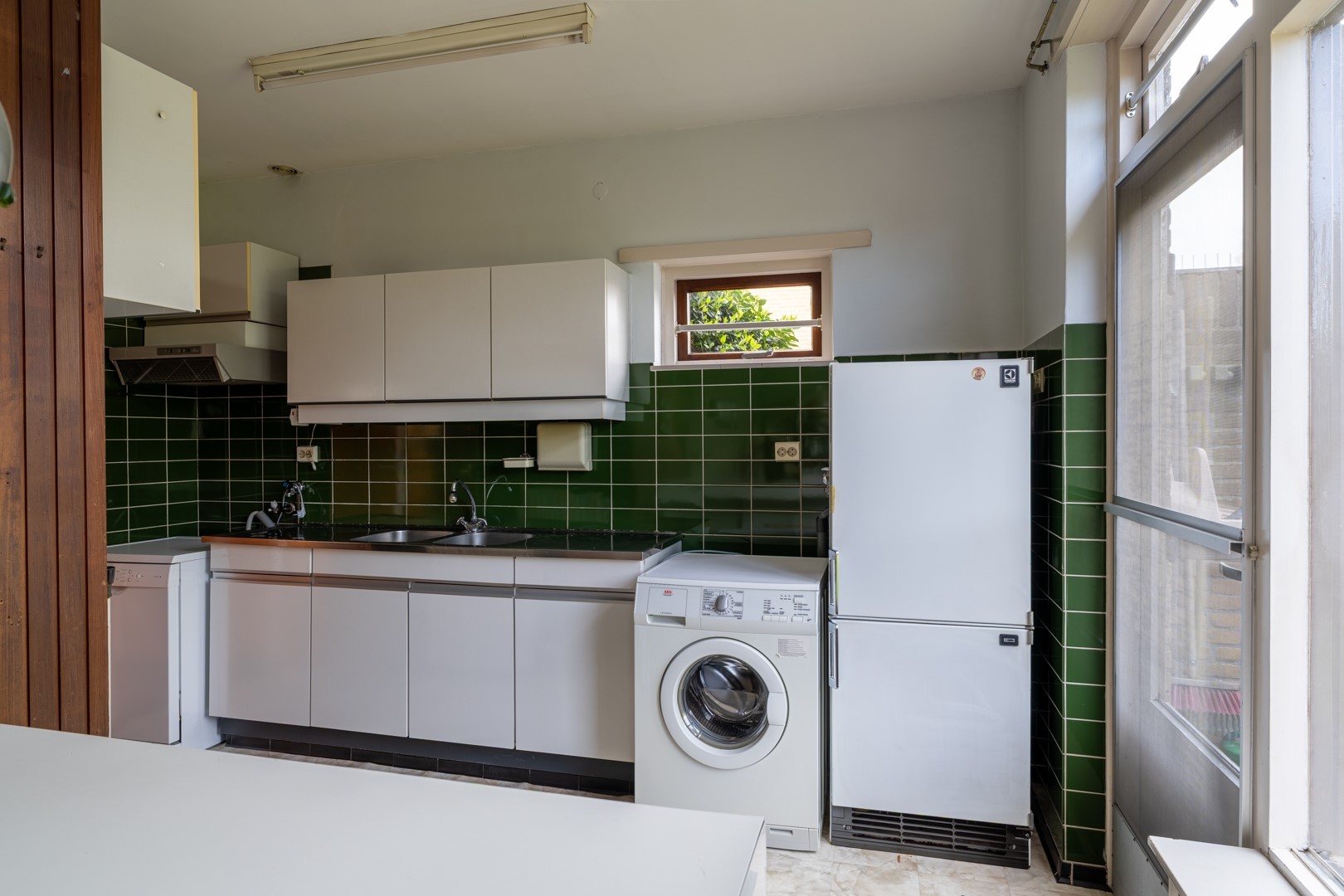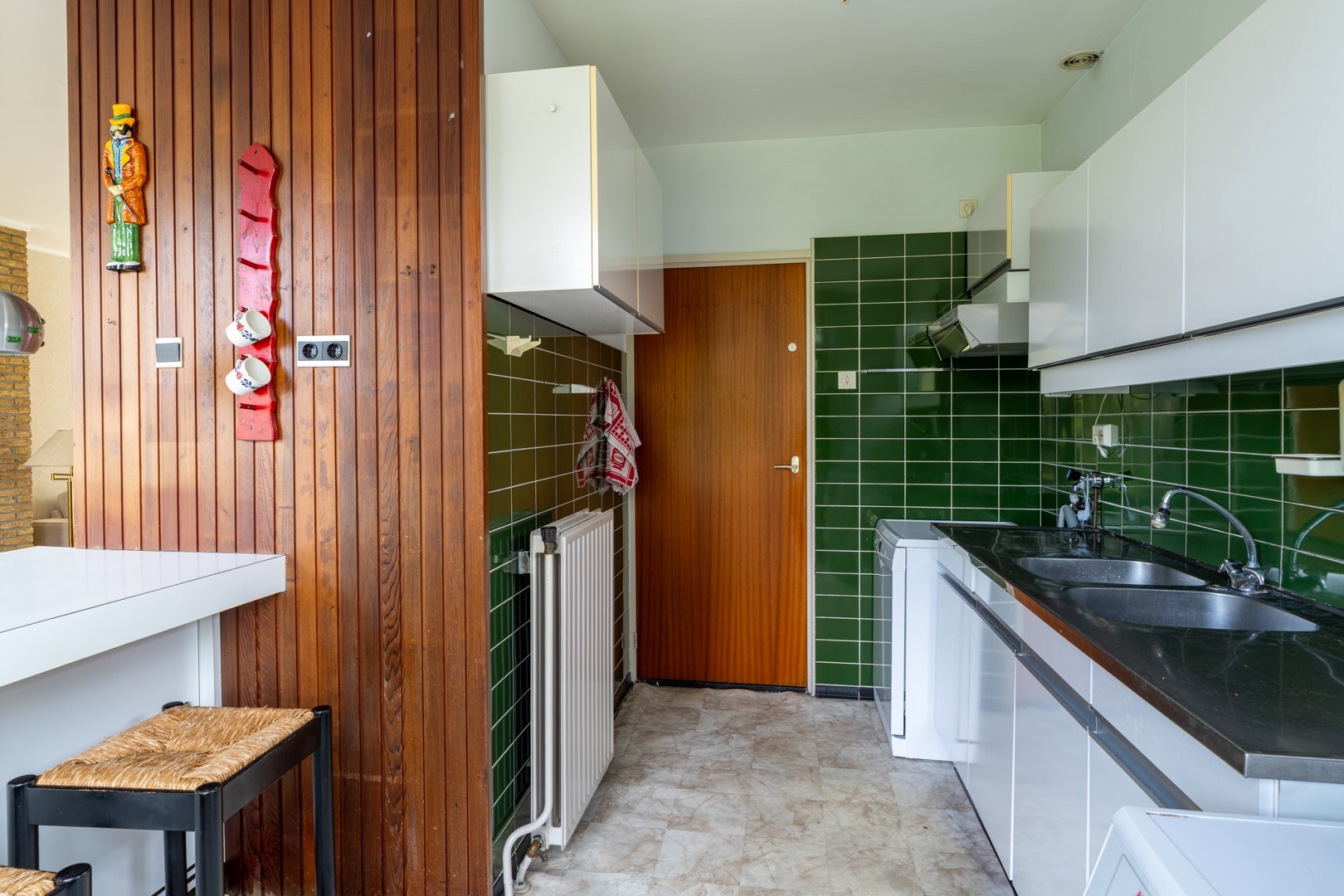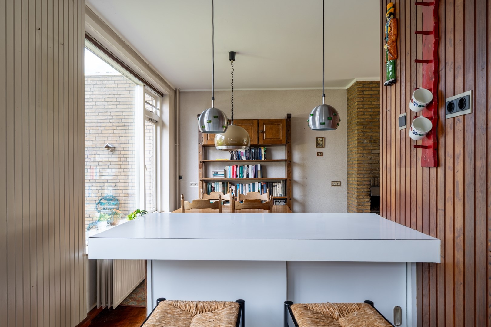 De open keuken bevindt zich aan de achterzijde en is praktisch ingericht met een rechte opstelling en een gezellige eetbar. De keuken geeft via een loopdeur toegang naar de achtertuin.