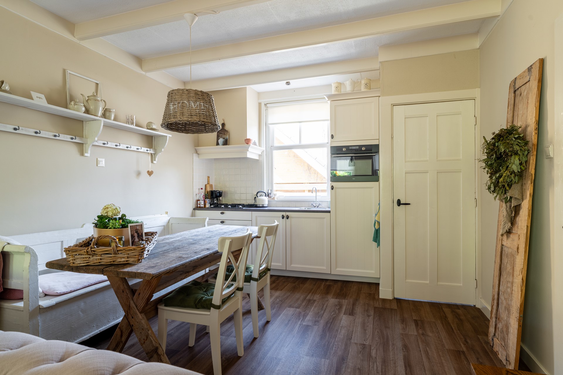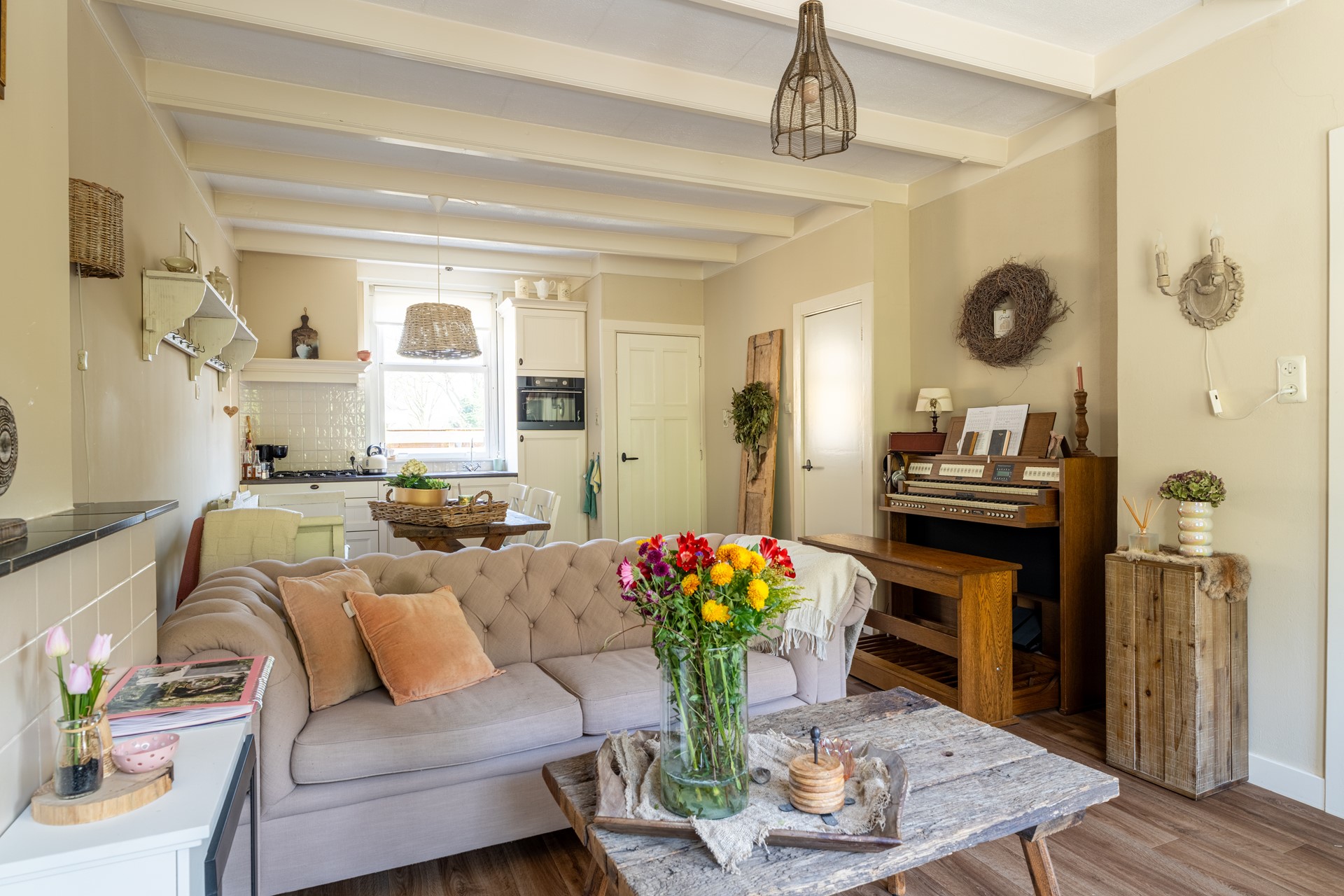 Via de entree/hal betreden wij de woning. De zeer sfeervolle woonkamer ademt karakter. Zowel de entree als de woonkamer zijn voorzien van vinyl met houtlook, gestuukte wanden, een balkenplafond en paneeldeuren. De open keuken beschikt over een keukenblok met gaskookplaat, combi-oven en koelkast.