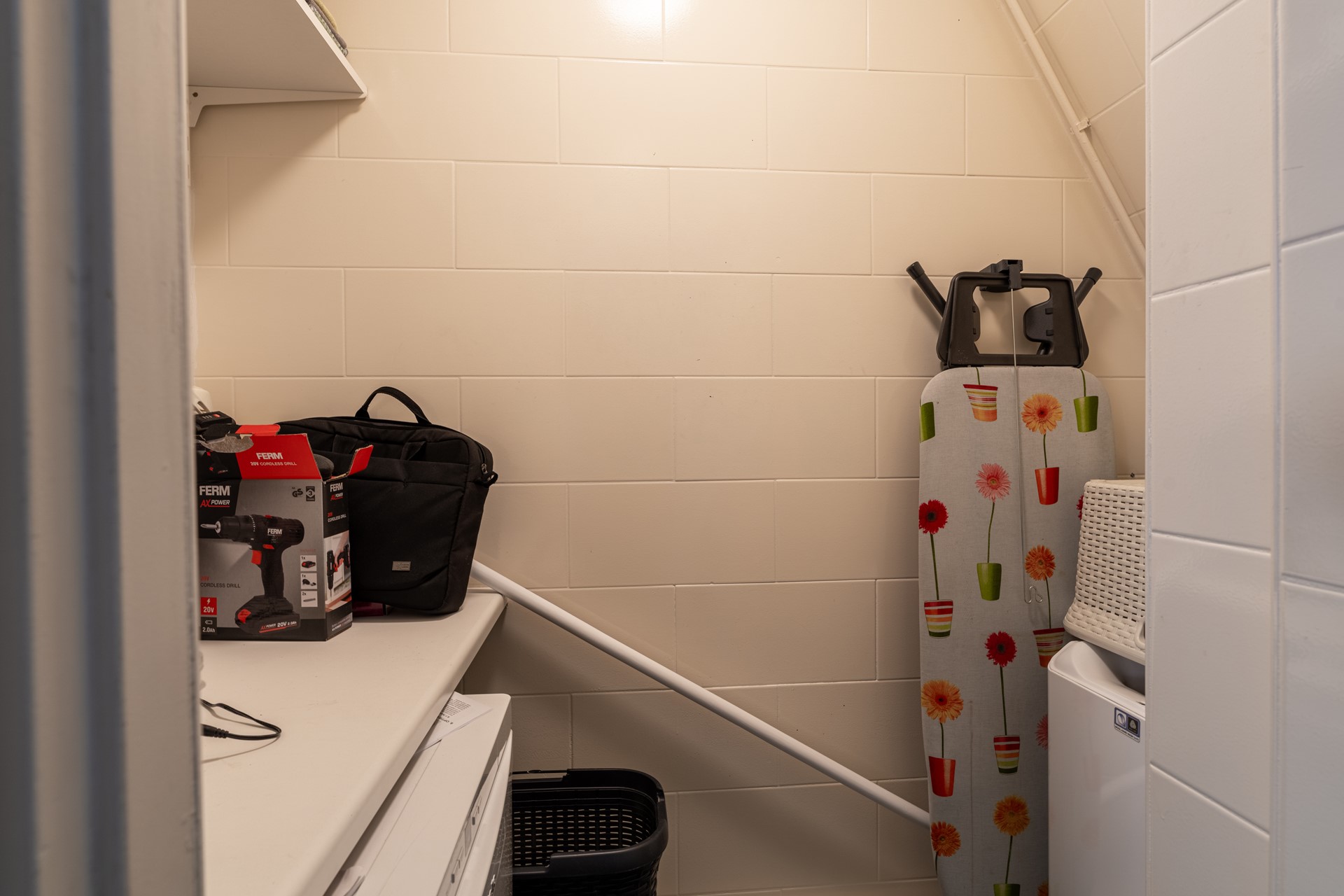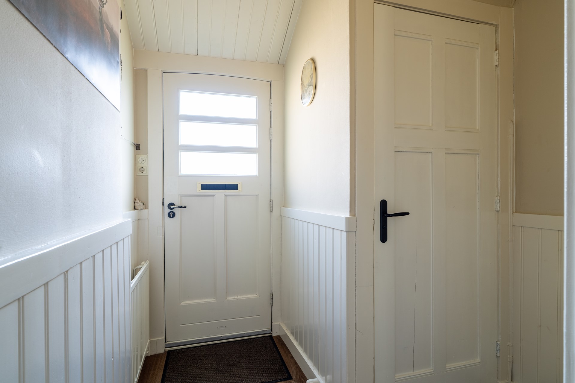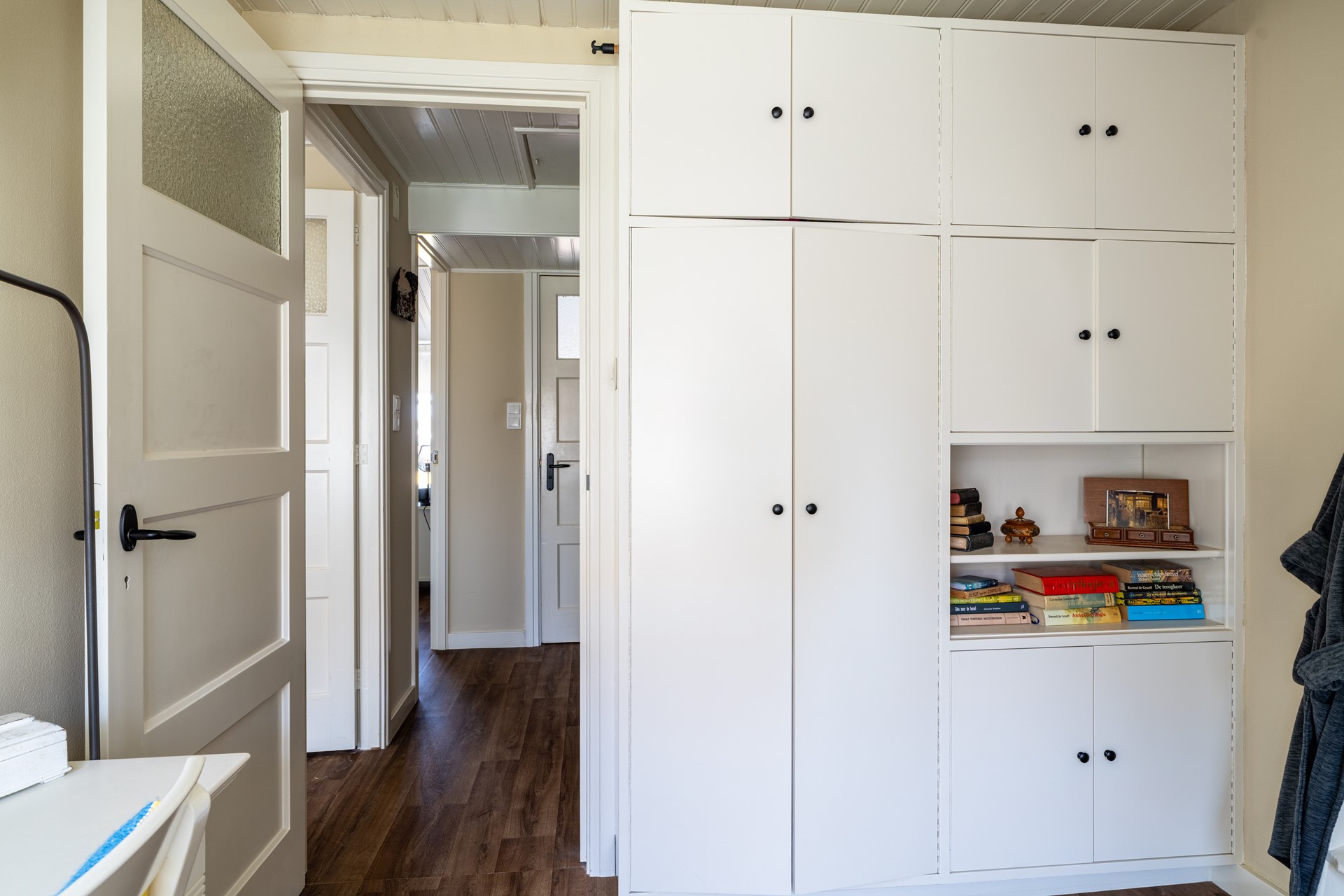 Zowel in de woonkamer als in de aanliggende hal vinden we twee praktische opbergkasten Daarnaast geeft de hal toegang tot een toilet en is in de vloer van de hal ook toegang tot een kleine ondergrondse bergruimte verwerkt.