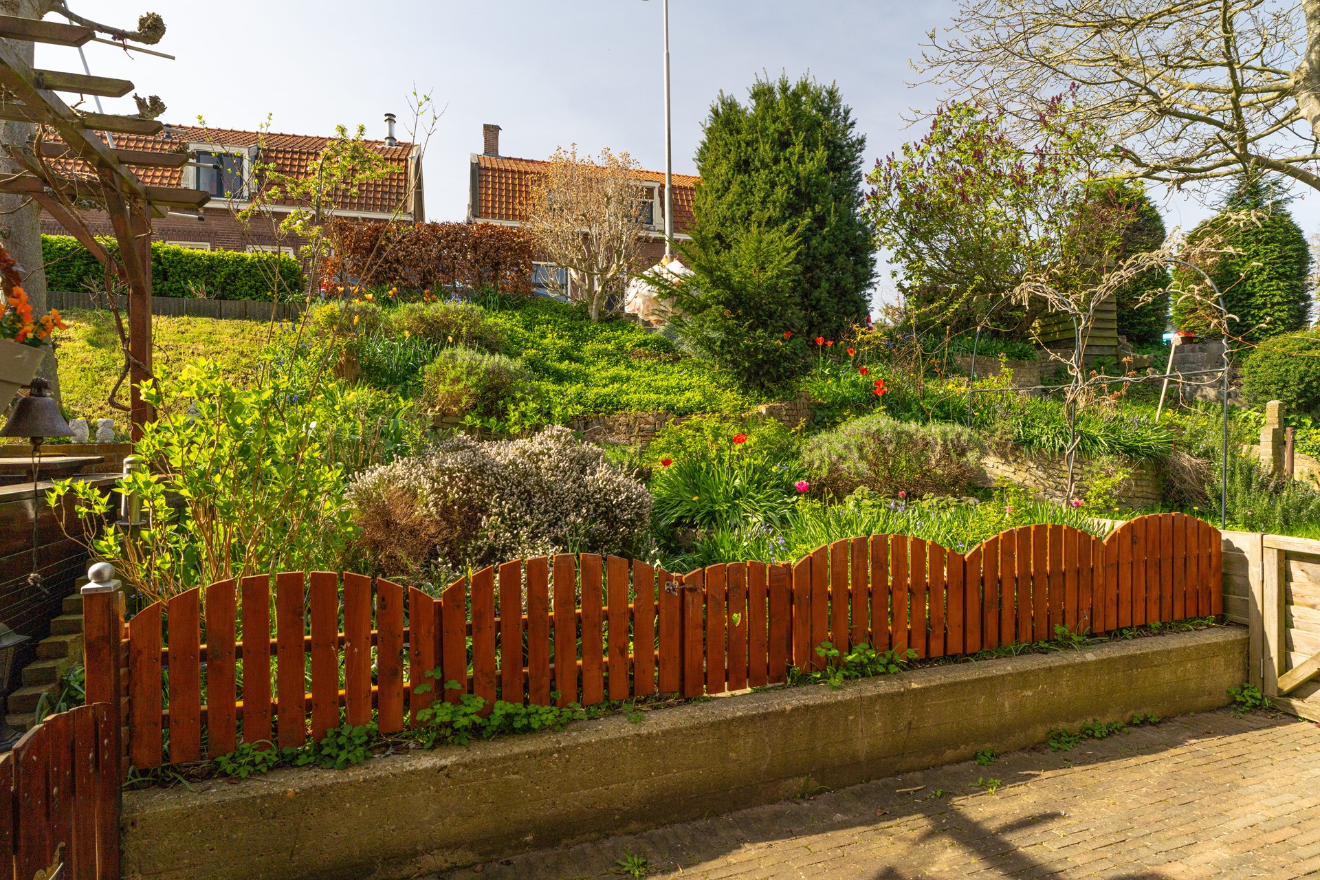 Aan de dijkzijde bevindt zich een zonnige tuin op het zuiden waar u heerlijk kunt genieten van de zon. Aan de achterzijde is een houten terras aanwezig. Tevens is er een stenen berging met elektra aanwezig.