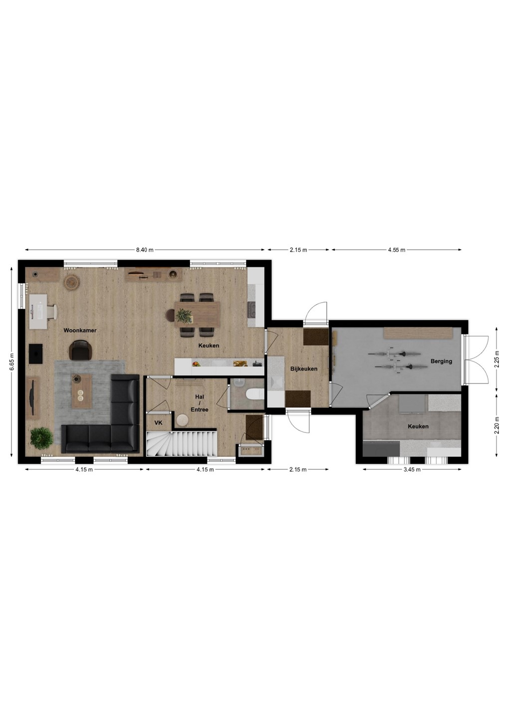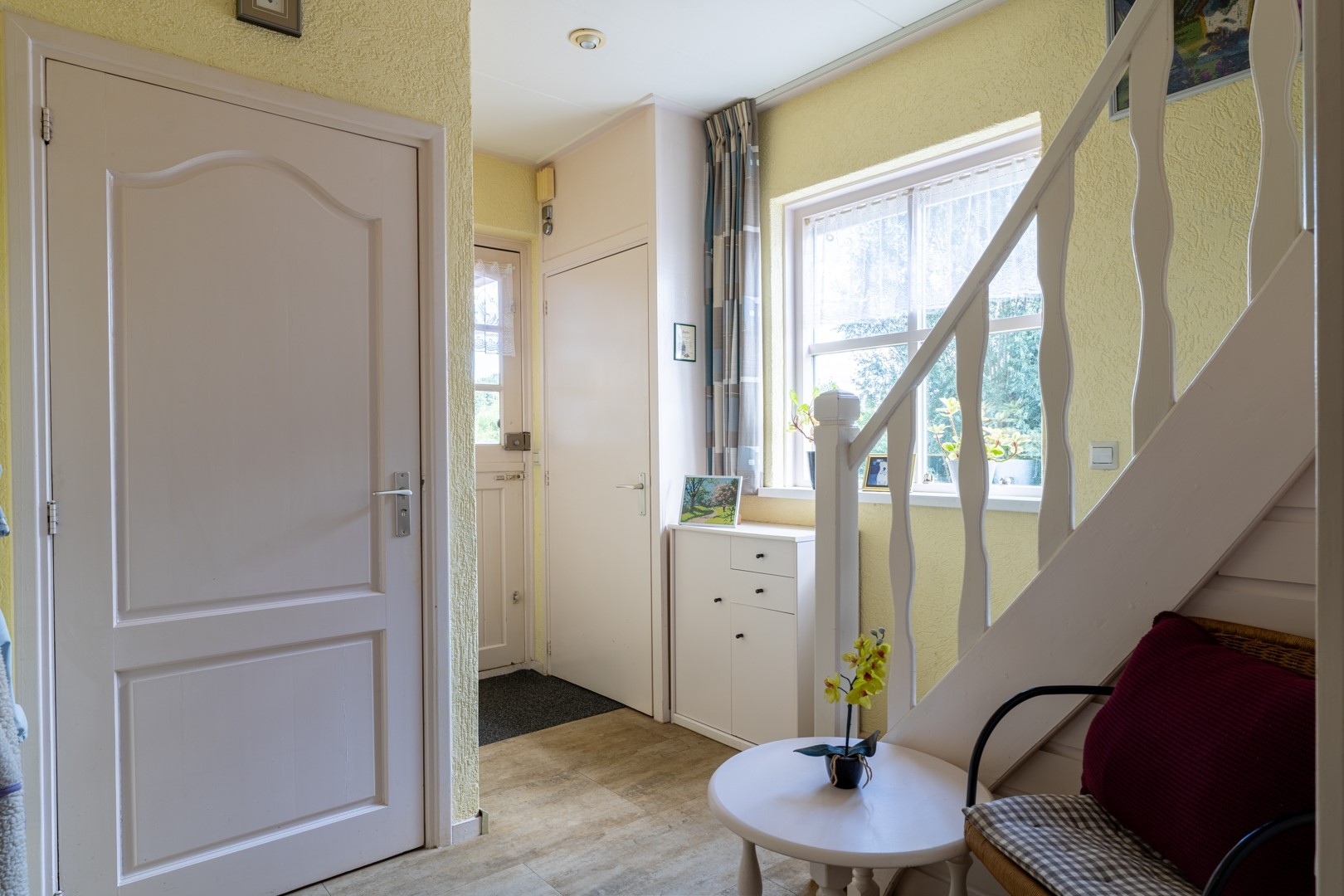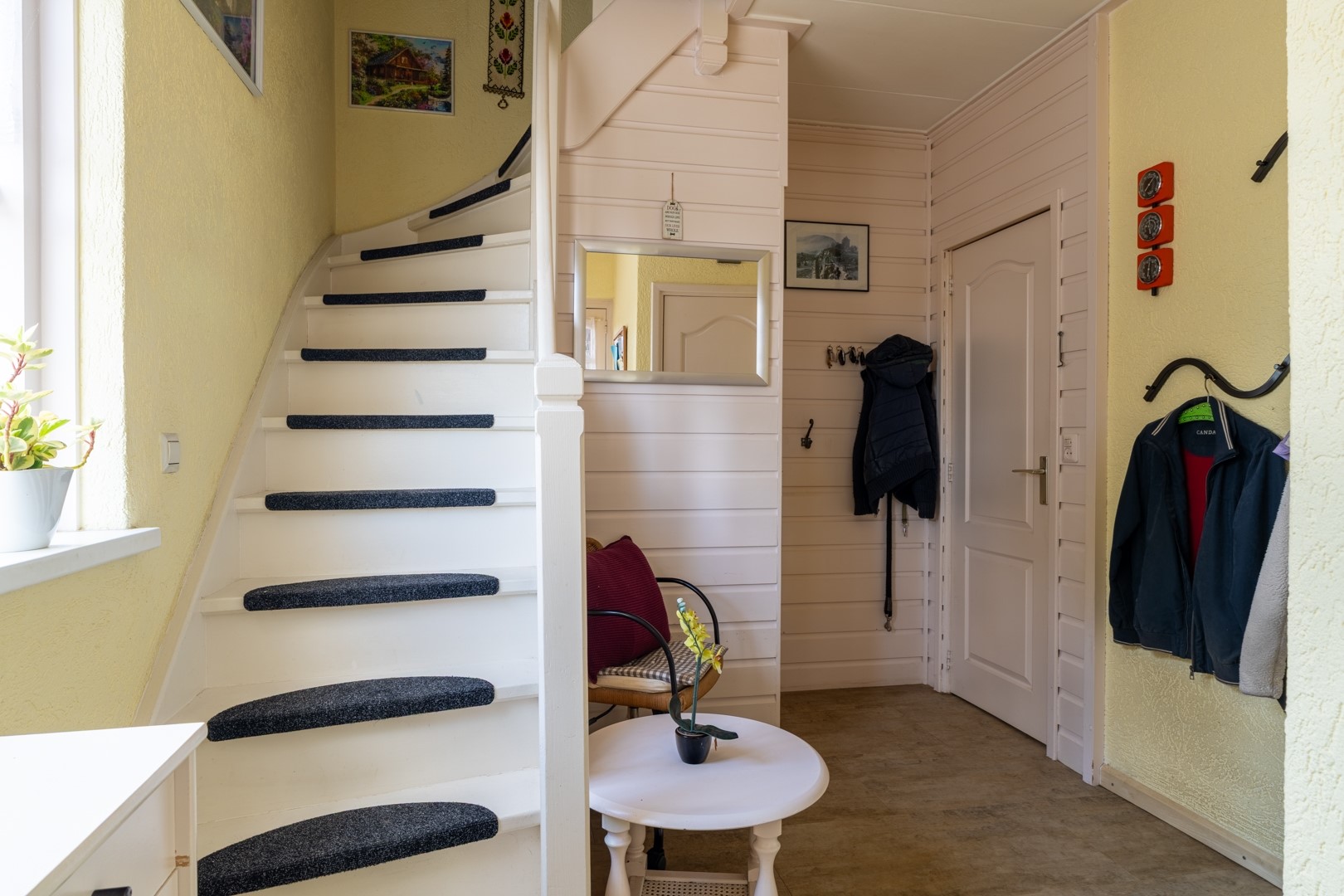 Via de voordeur aan de voorzijde kom je binnen in de hal/entree met de meterkast, het toilet en de trapopgang naar boven. Vanuit hier stap je de ruime, lichte woonkamer binnen. Dankzij de vele raampartijen valt er veel daglicht binnen, en de houtkachel zorgt voor een knusse sfeer tijdens de winteravonden. Aan de achterzijde geeft een grote schuifpui toegang tot het terras en de achtertuin – binnen en buiten lopen hier naadloos in elkaar over.
