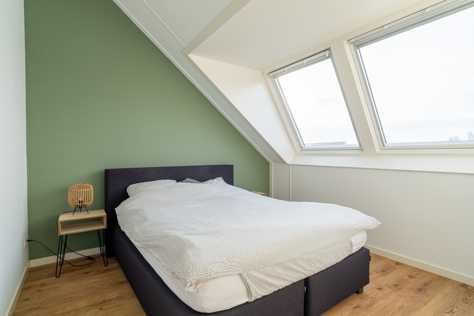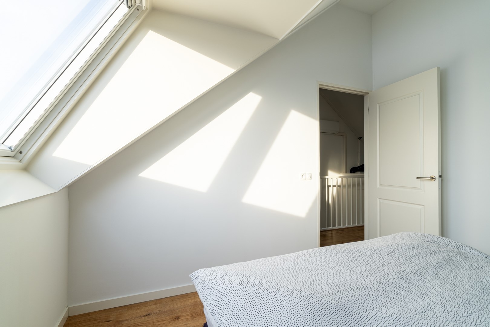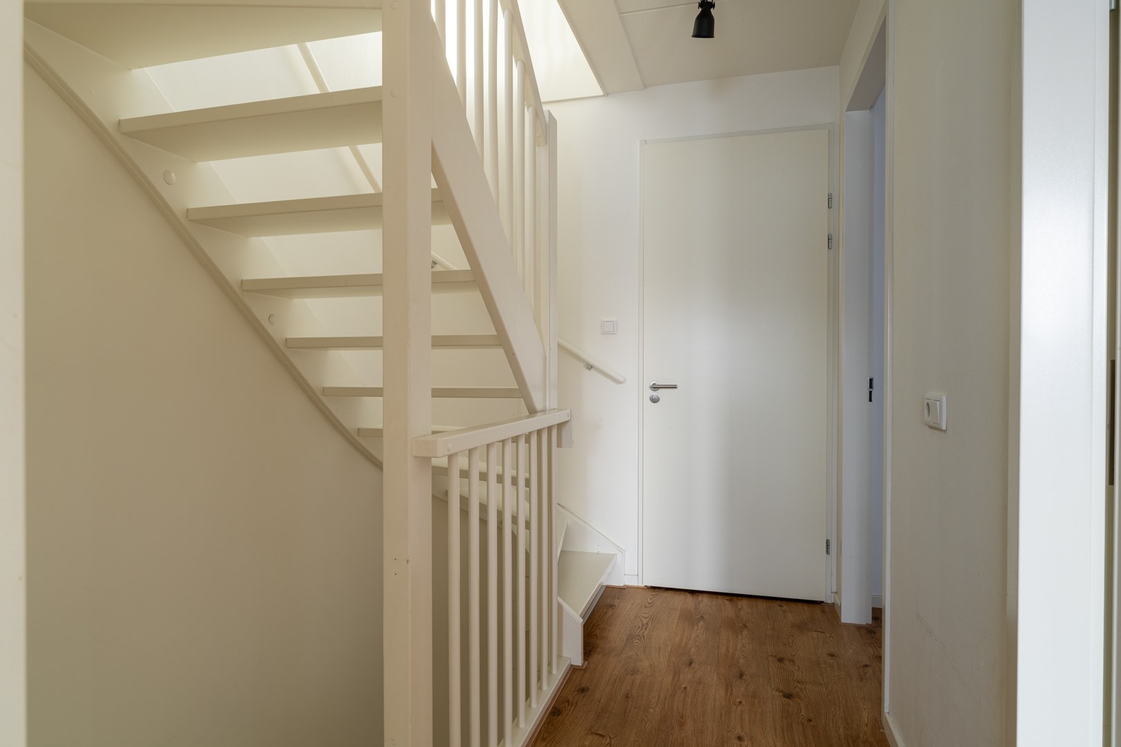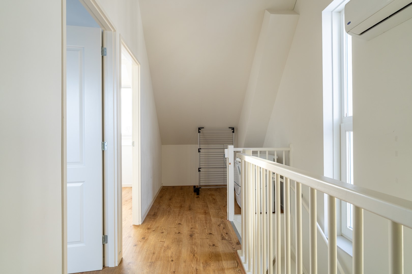 Op de eerste verdieping bevinden zich drie ruime slaapkamers en een moderne badkamer. De badkamer is compleet ingericht met een inloopdouche, vrijstaand ligbad, wastafelmeubel en een zwevend toilet. De tweede verdieping is een volwaardige woonlaag met Velux-dakkappellen, wat zorgt voor extra licht en ruimte voor nog twee (slaap)kamers. Op de overloop is een praktische washoek gerealiseerd met aansluitingen voor wasapparatuur en de WTW-installatie.