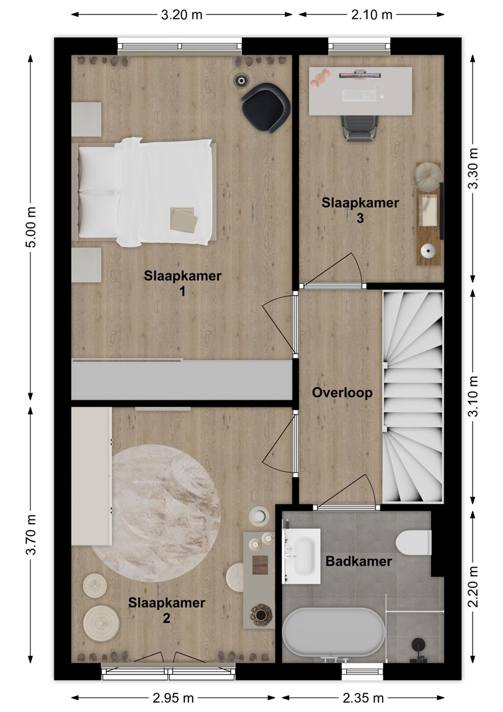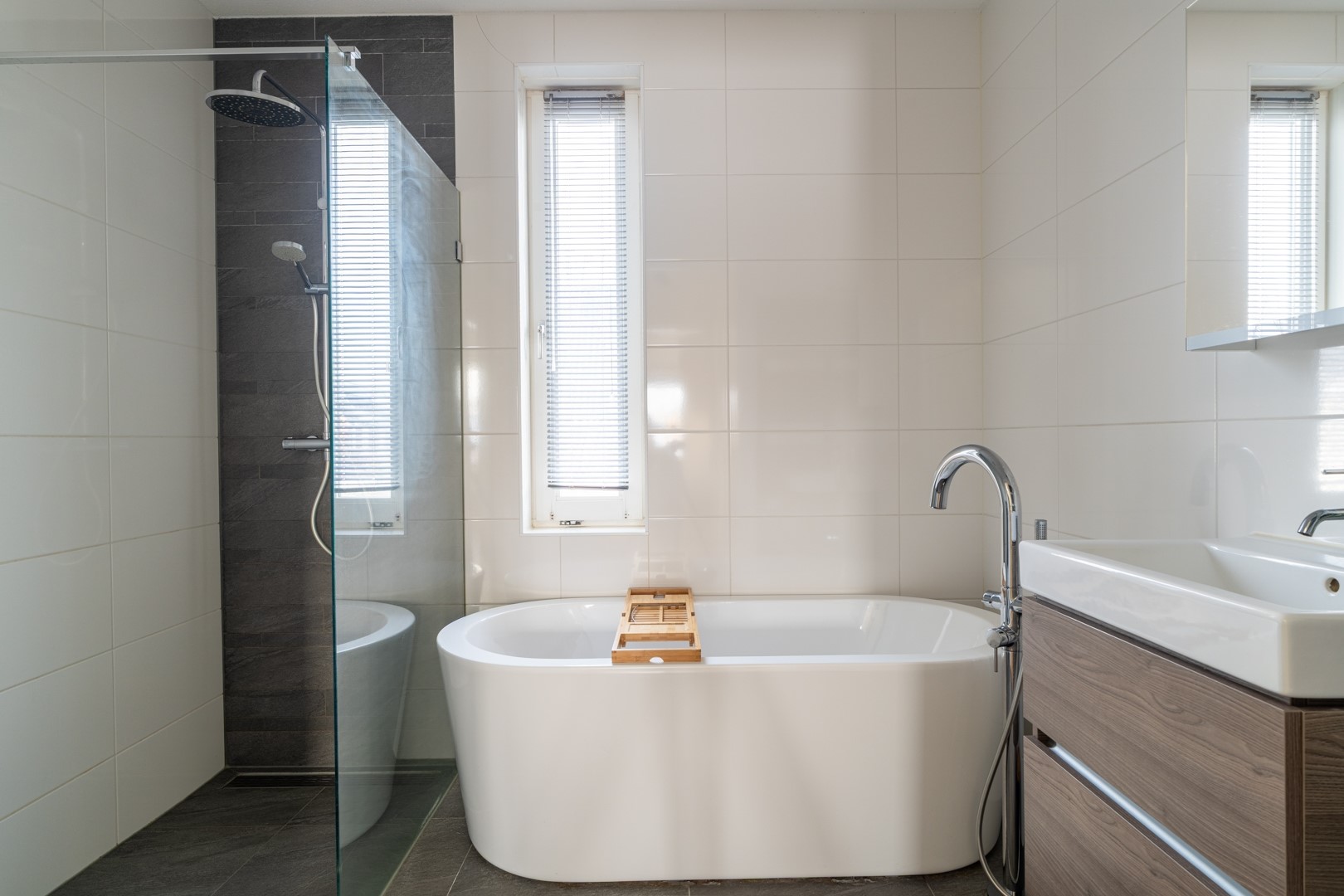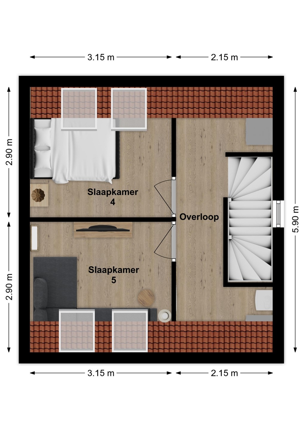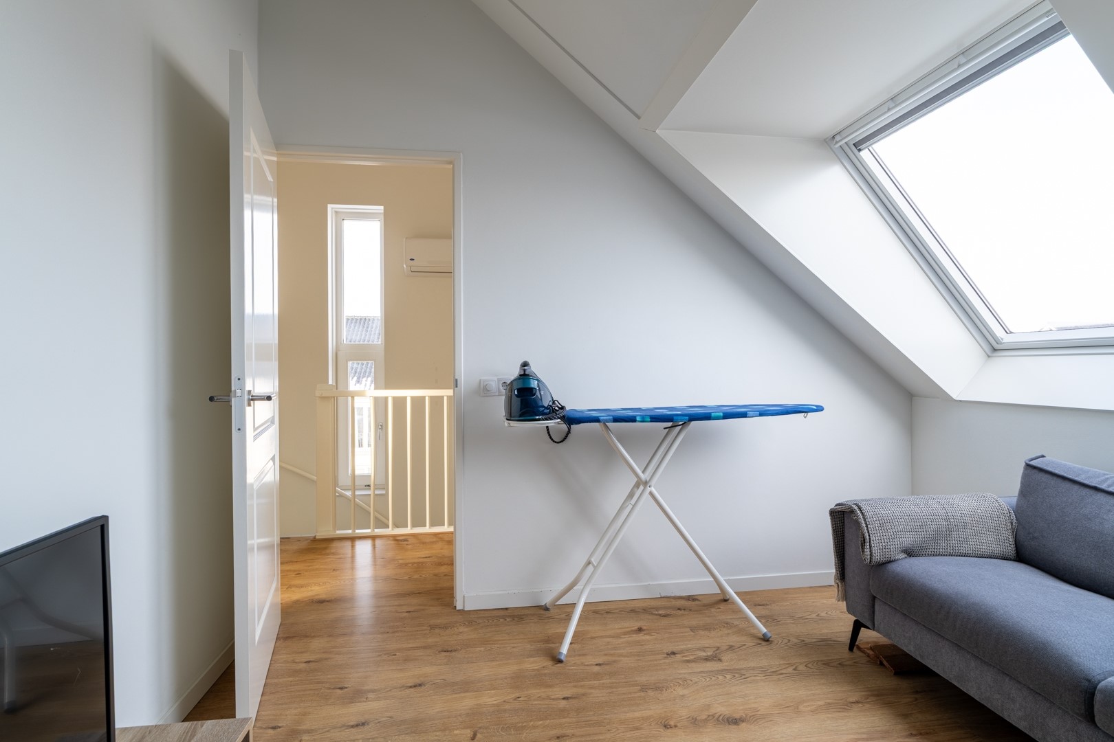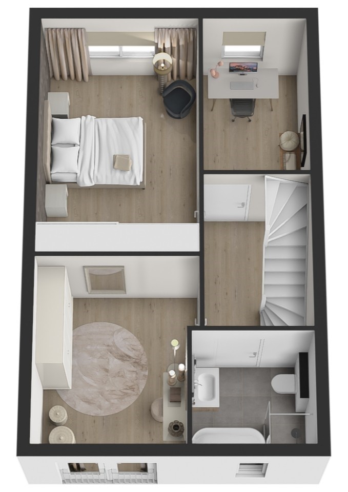 Op de eerste verdieping bevinden zich drie ruime slaapkamers en een moderne badkamer. De badkamer is compleet ingericht met een inloopdouche, vrijstaand ligbad, wastafelmeubel en een zwevend toilet. De tweede verdieping is een volwaardige woonlaag met Velux-dakkappellen, wat zorgt voor extra licht en ruimte voor nog twee (slaap)kamers. Op de overloop is een praktische washoek gerealiseerd met aansluitingen voor wasapparatuur en de WTW-installatie.