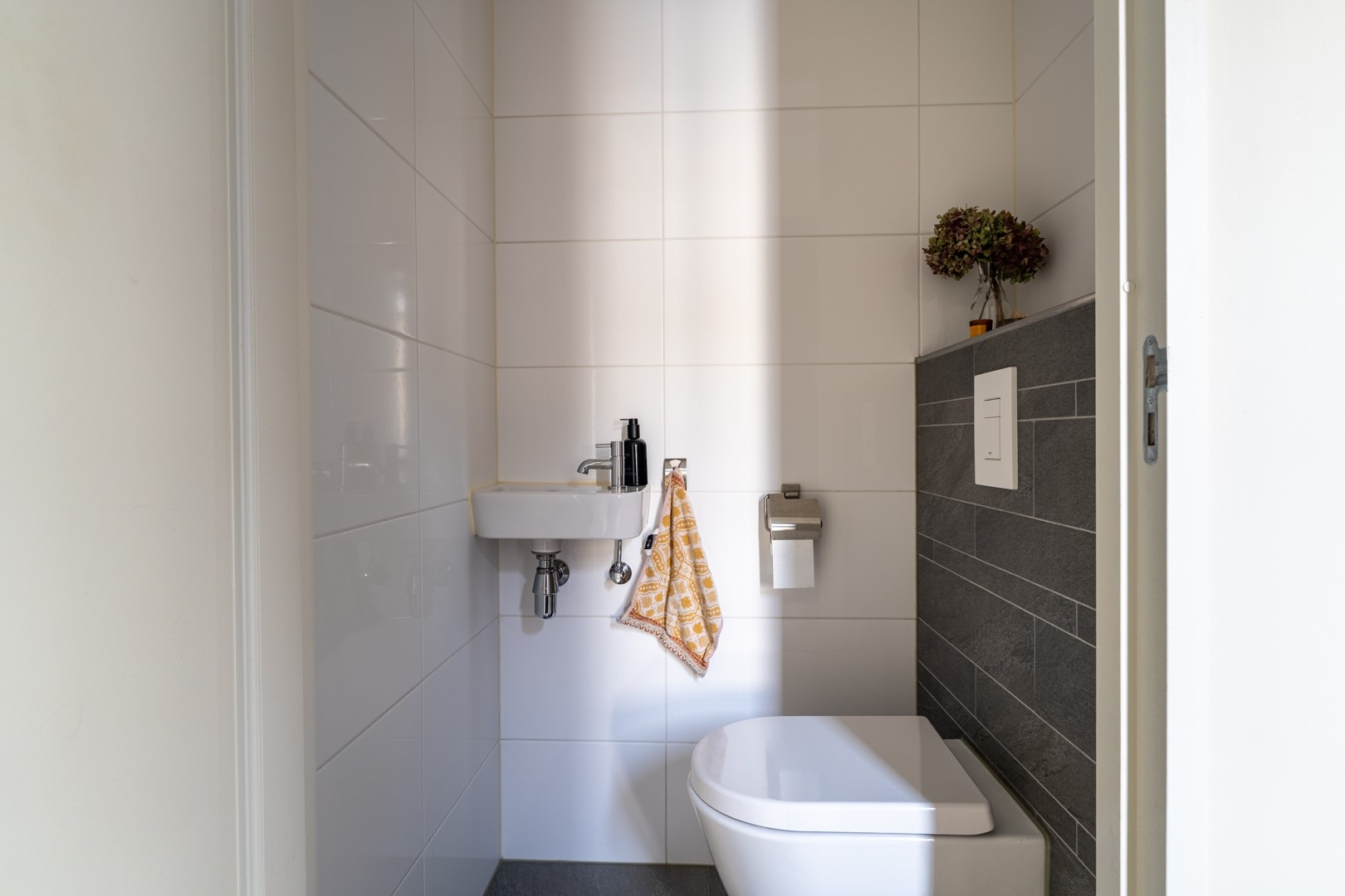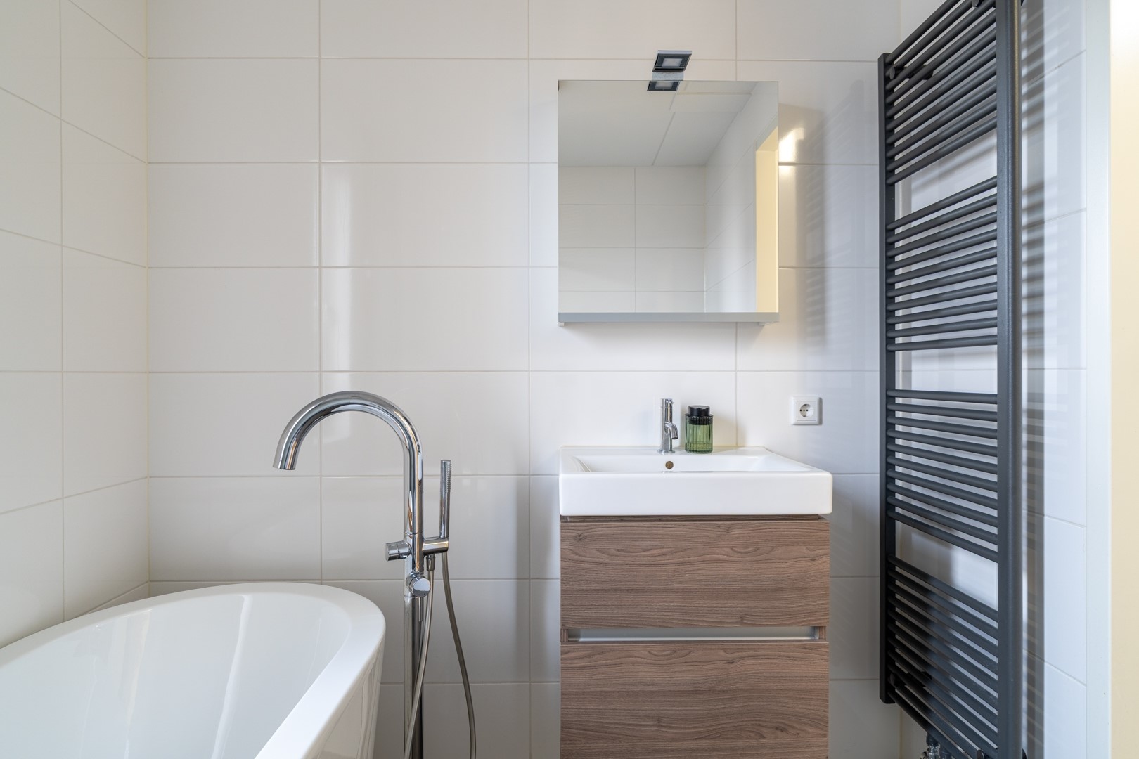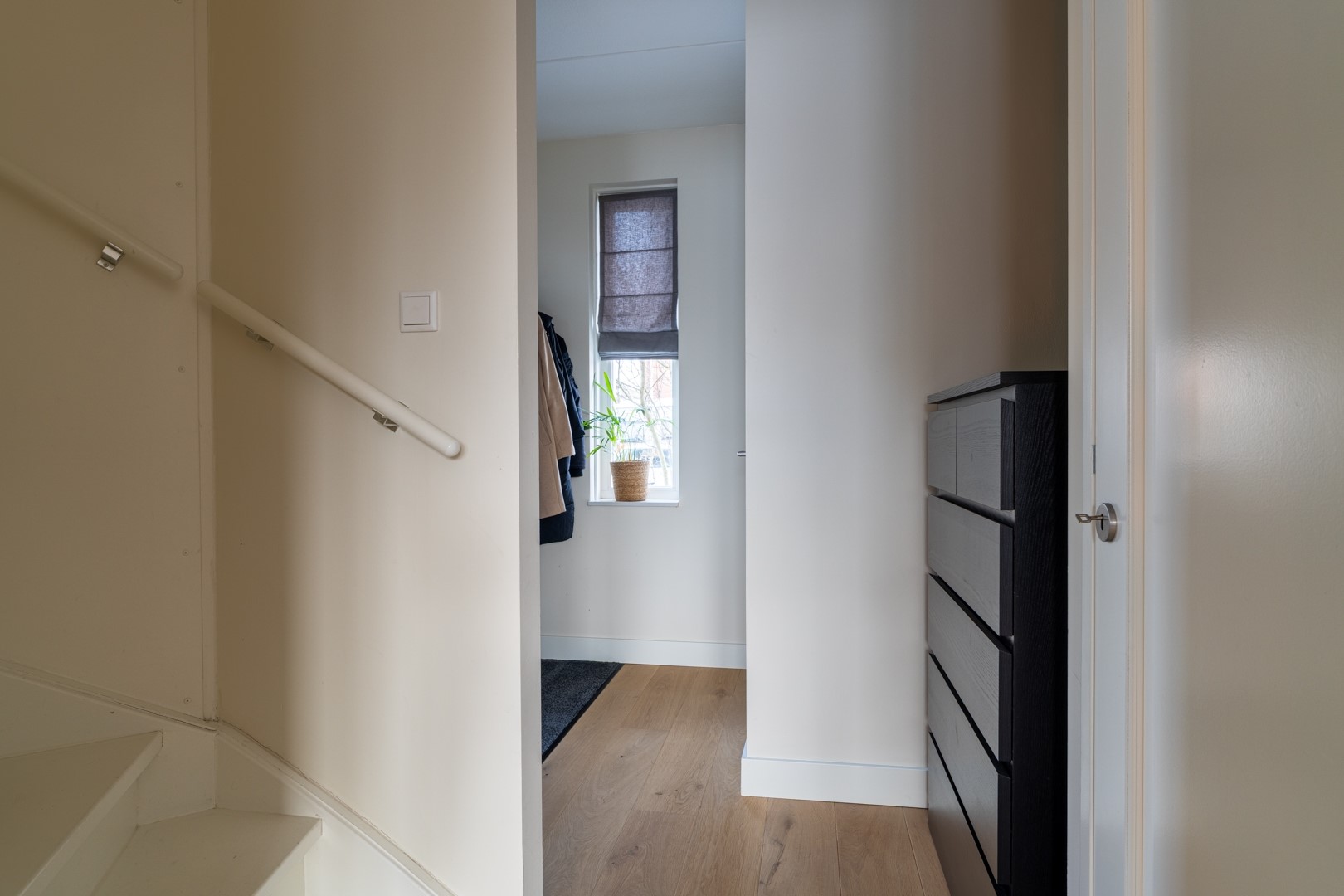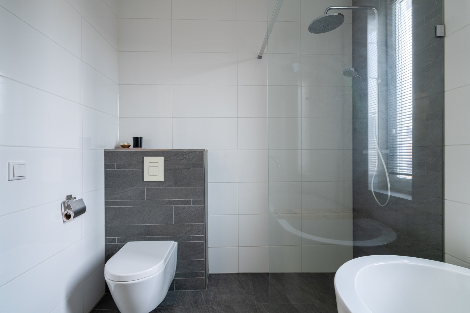 Op de eerste verdieping bevinden zich drie ruime slaapkamers en een moderne badkamer. De badkamer is compleet ingericht met een inloopdouche, vrijstaand ligbad, wastafelmeubel en een zwevend toilet. De tweede verdieping is een volwaardige woonlaag met Velux-dakkappellen, wat zorgt voor extra licht en ruimte voor nog twee (slaap)kamers. Op de overloop is een praktische washoek gerealiseerd met aansluitingen voor wasapparatuur en de WTW-installatie.