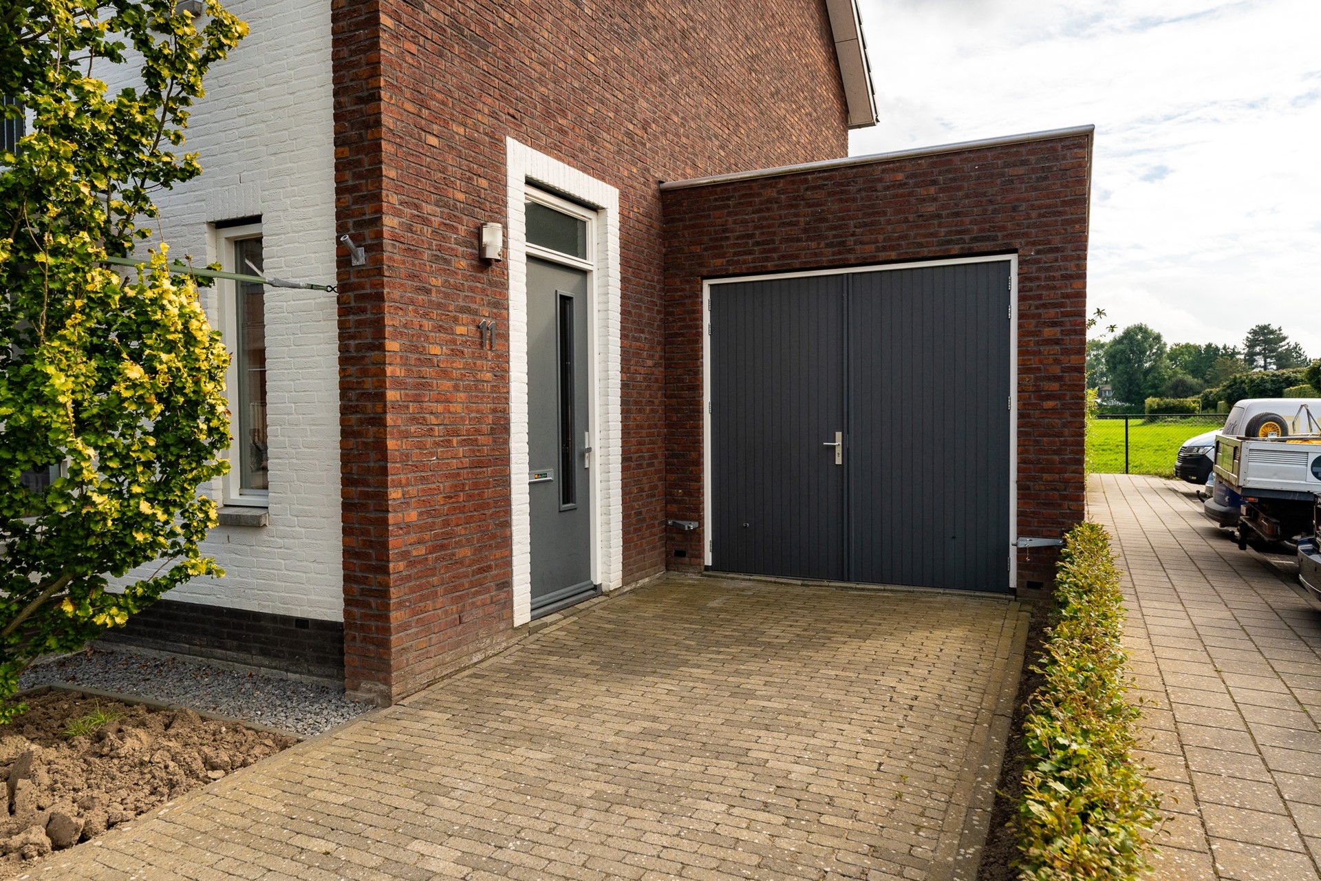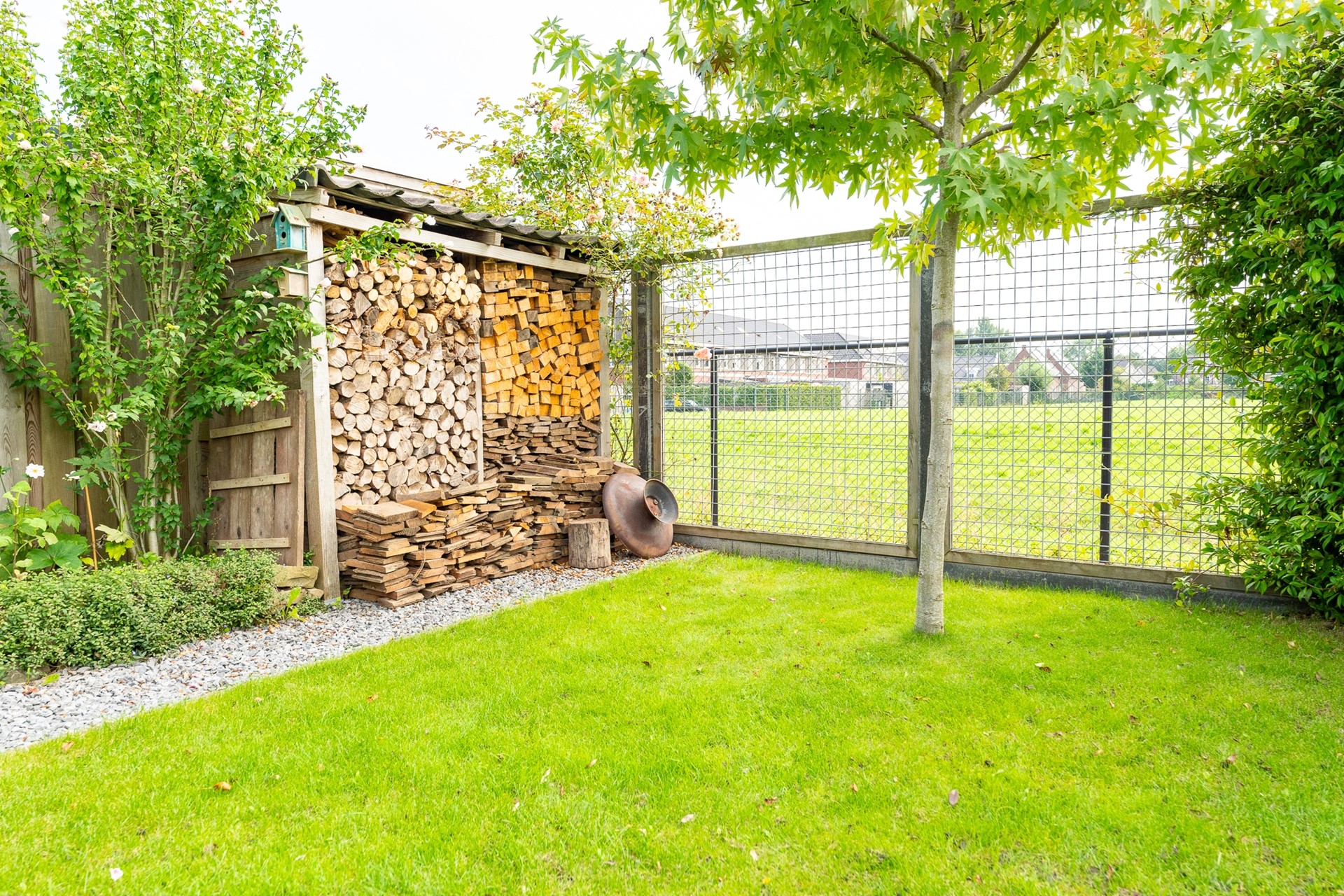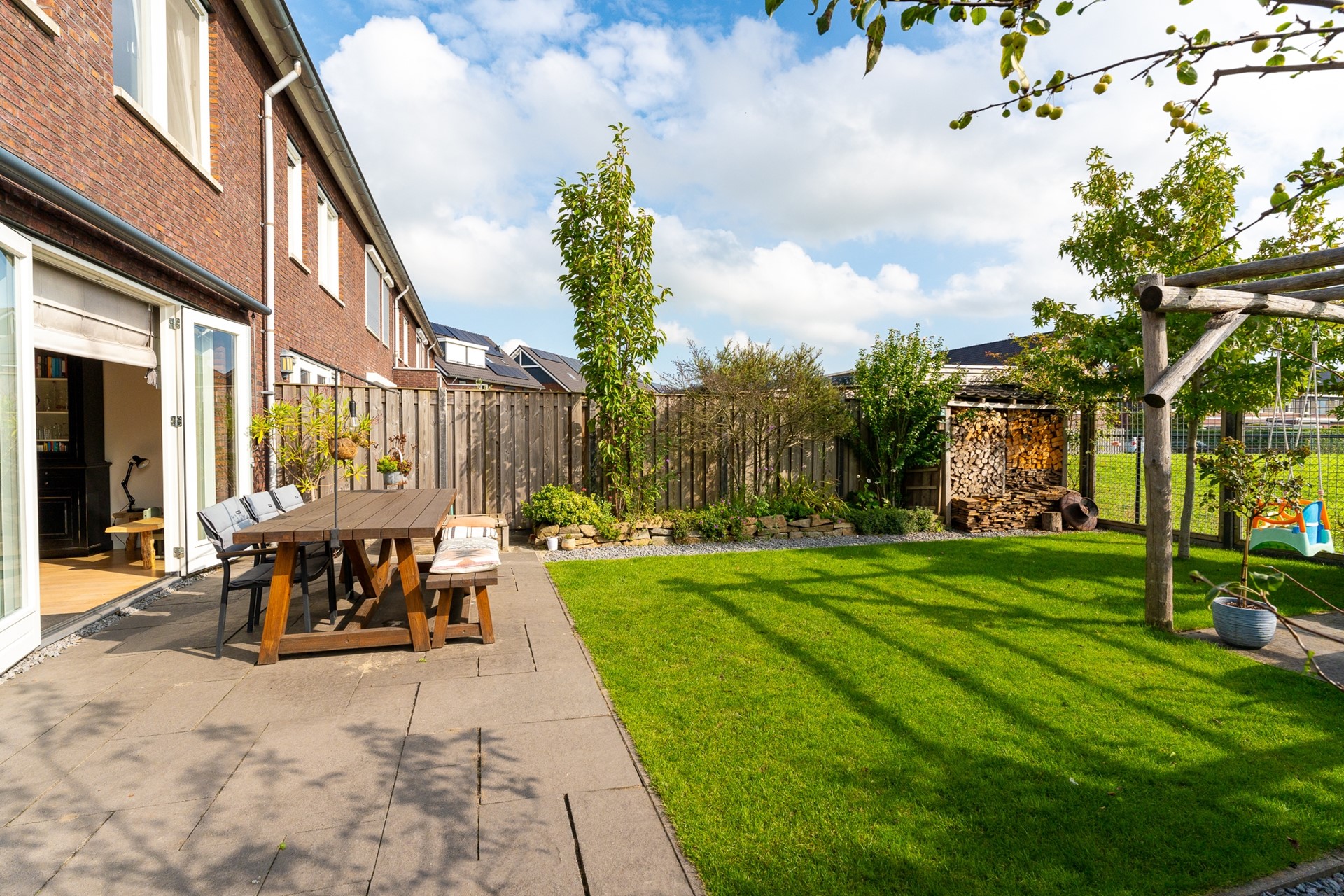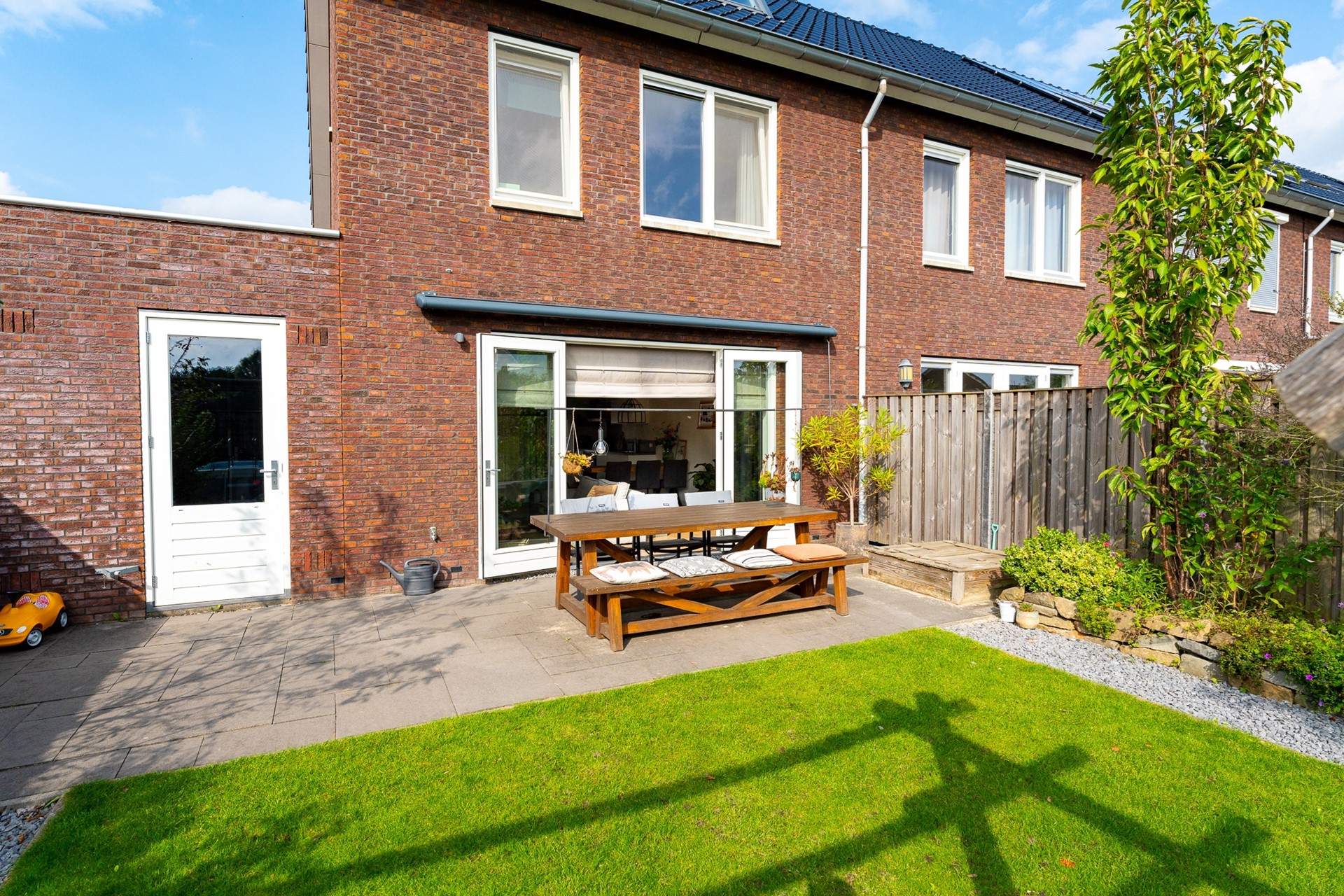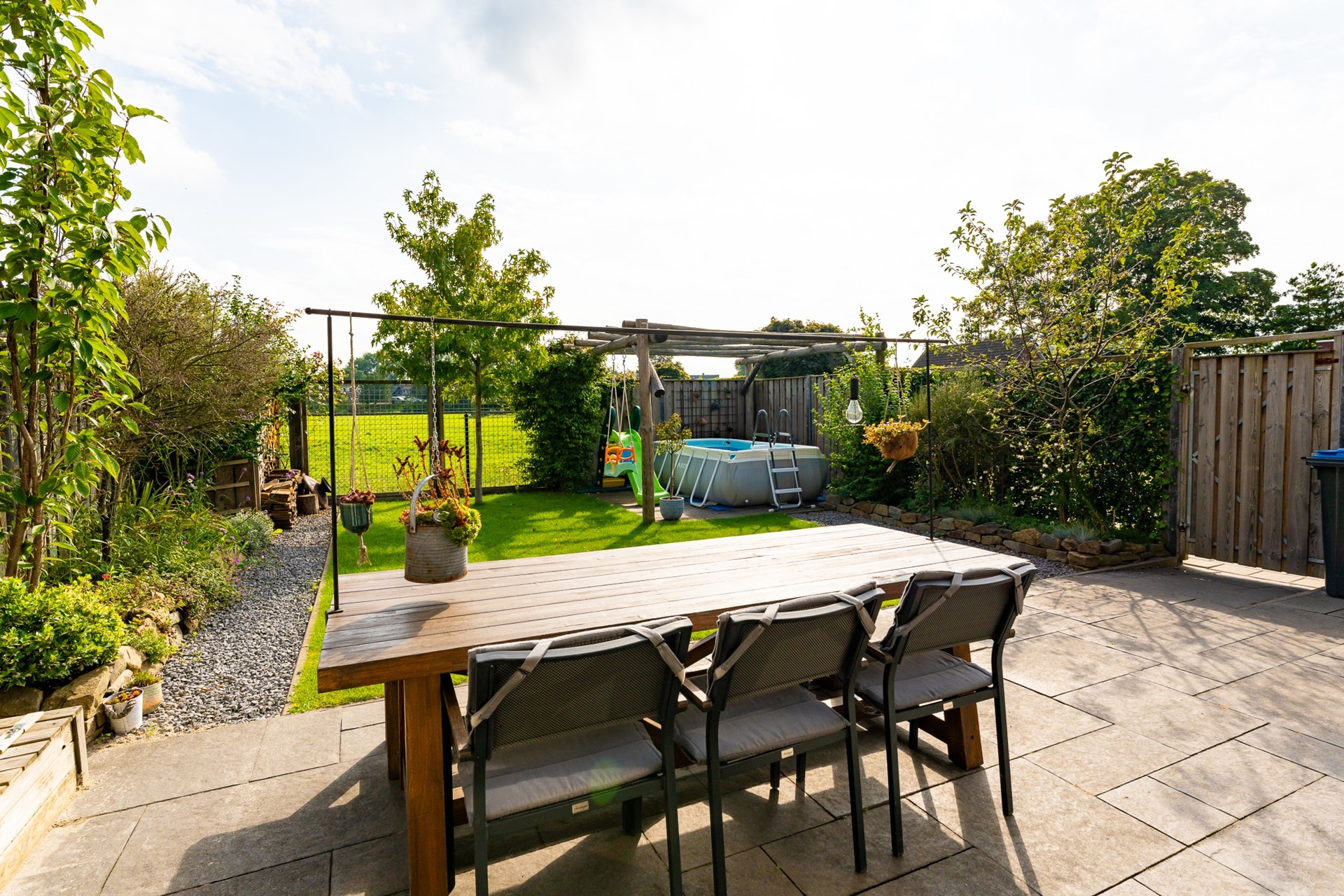 Aan de voorzijde beschikt de woning over een eigen oprit met toegang tot de garage. De achtertuin is een heerlijke plek om tot rust te komen, met vrij uitzicht over de landerijen. De tuin is verzorgd aangelegd met een gazon, bestrating en speelse plantenborders. Achterin het perceel staat een sfeervolle pergola met een gezellig zitje. Dankzij de zuidwestelijke ligging van de tuin kun je hier tot in de avond van de zon genieten.