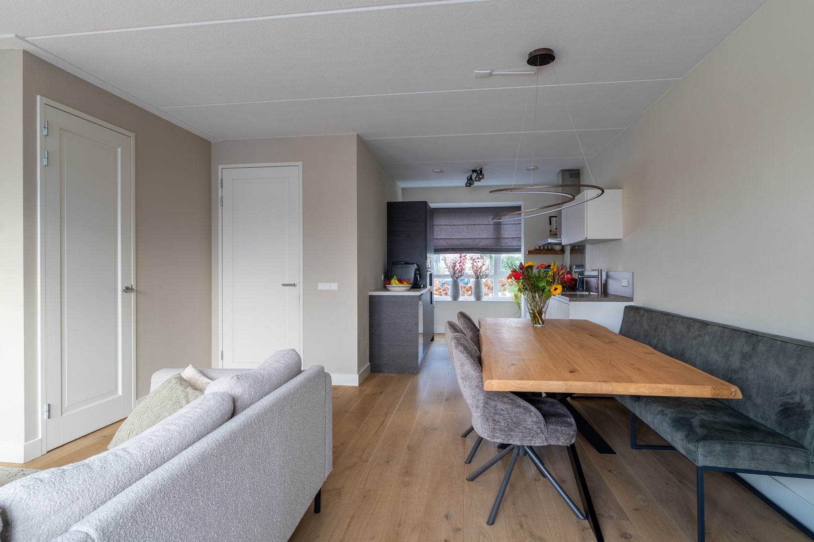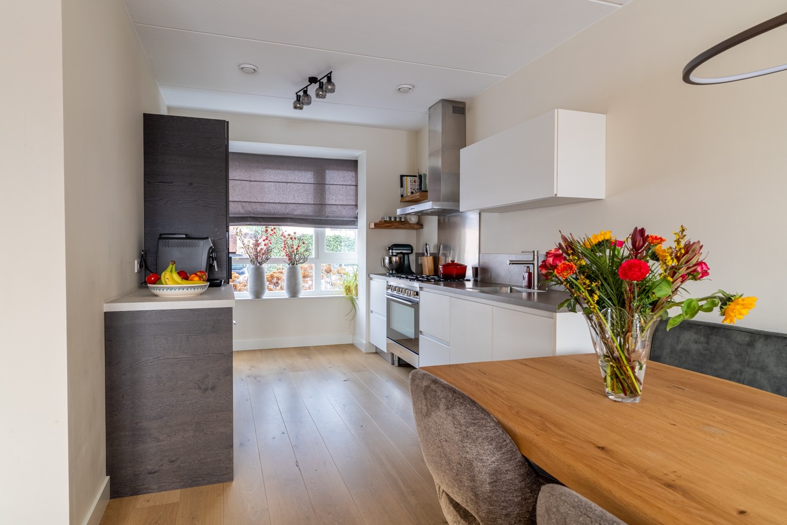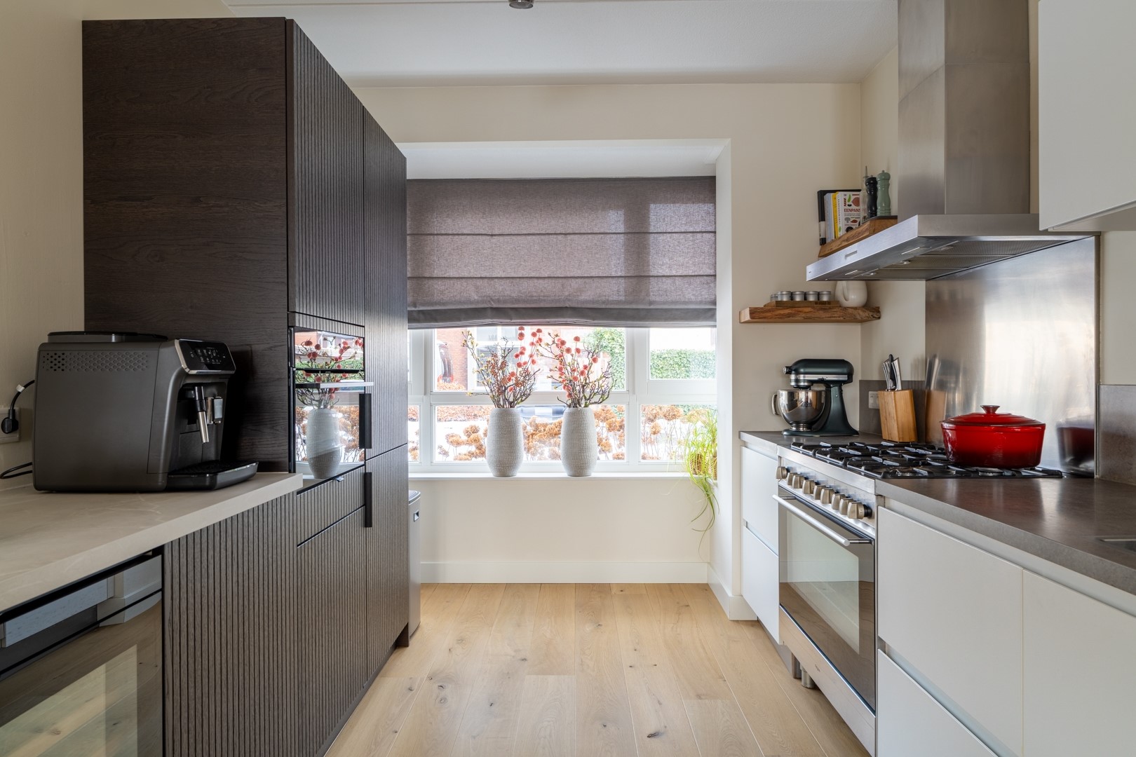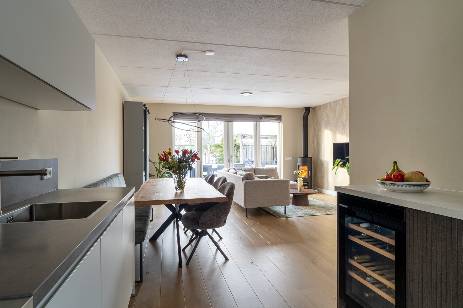 Aan de voorzijde van de woning vind je de mooie open keuken in een fijne parallelopstelling, met een sfeervolle erker die meteen opvalt. Aan de ene kant kook en spoel je, aan de andere kant zitten de koelkast, een opbergkast met oven en een gezellig koffiehoekje met wijnklimaatkast. Alles wat je nodig hebt is aanwezig, met lekker veel werk- en bergruimte. De hele begane grond is bovendien voorzien van comfortabele vloerverwarming.