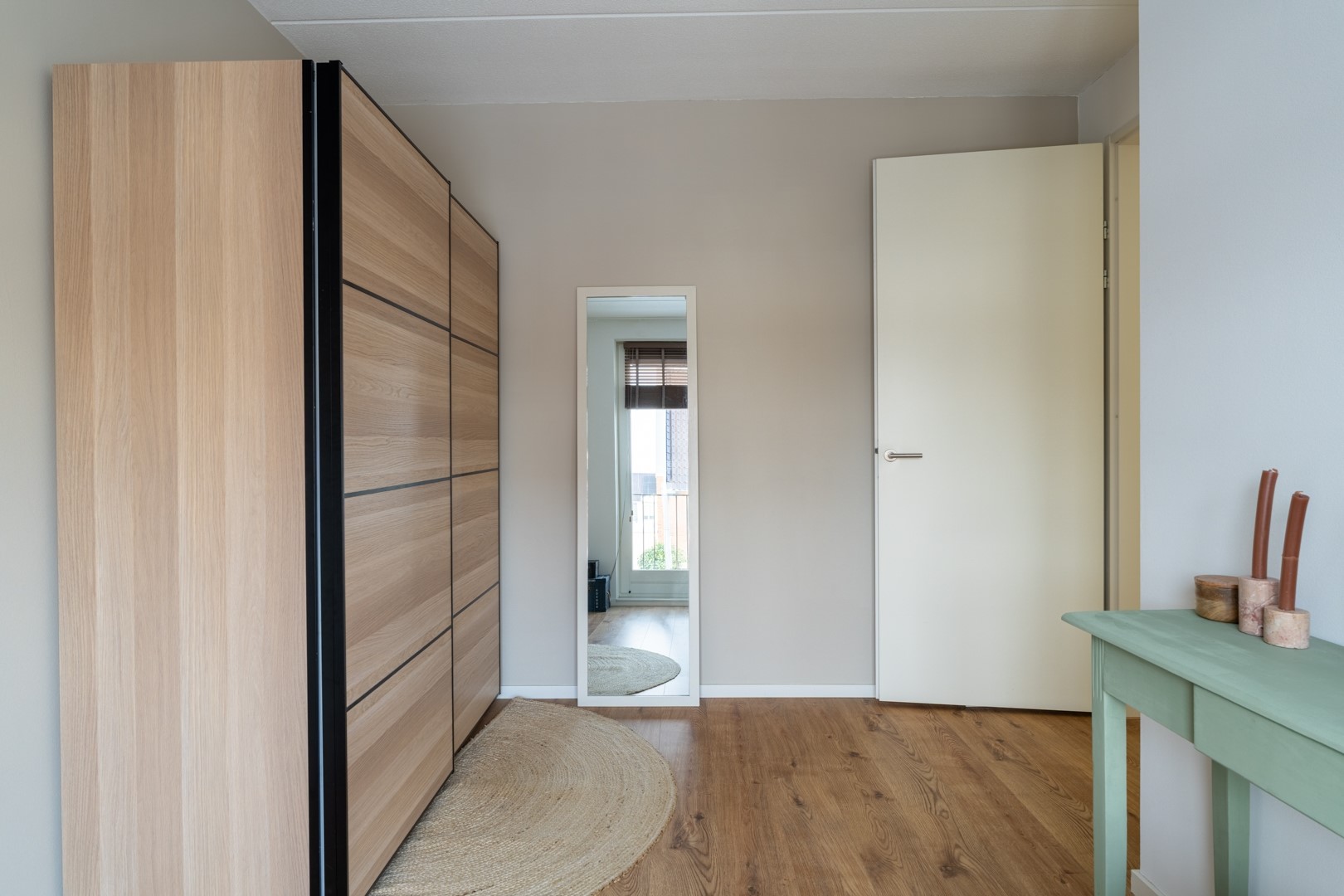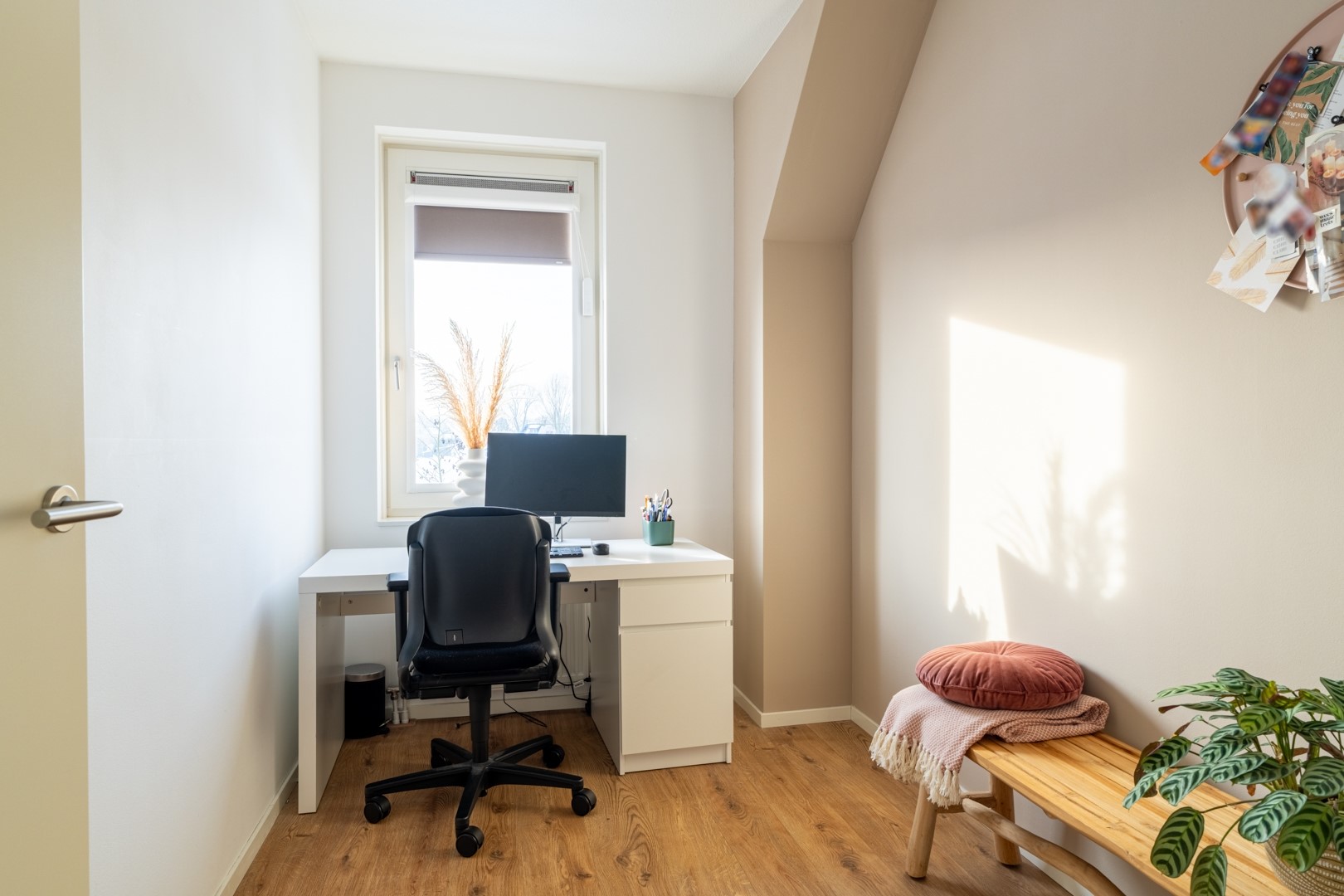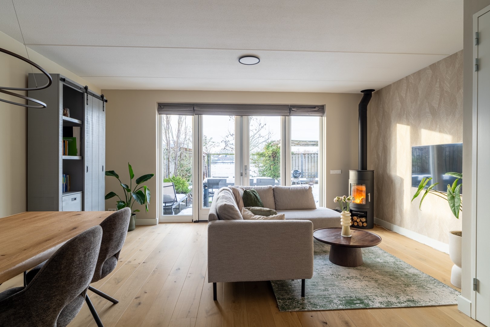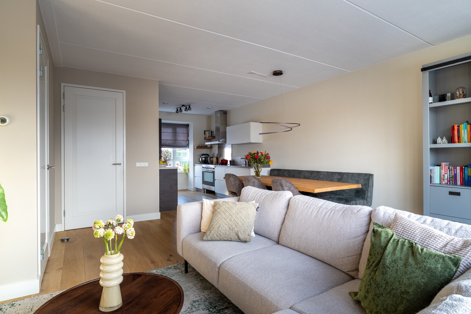 Aan de voorzijde van de woning vind je de mooie open keuken in een fijne parallelopstelling, met een sfeervolle erker die meteen opvalt. Aan de ene kant kook en spoel je, aan de andere kant zitten de koelkast, een opbergkast met oven en een gezellig koffiehoekje met wijnklimaatkast. Alles wat je nodig hebt is aanwezig, met lekker veel werk- en bergruimte. De hele begane grond is bovendien voorzien van comfortabele vloerverwarming.