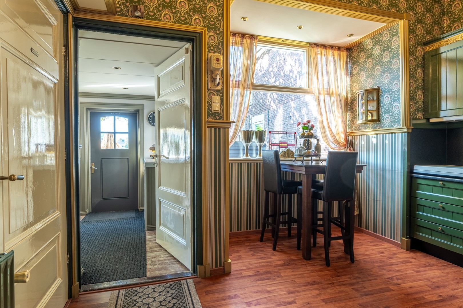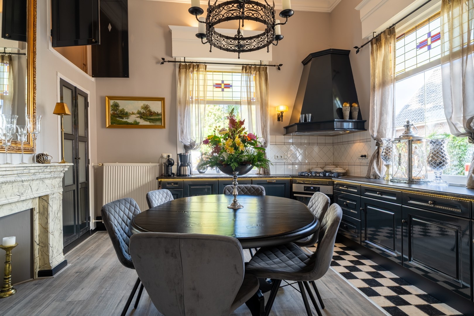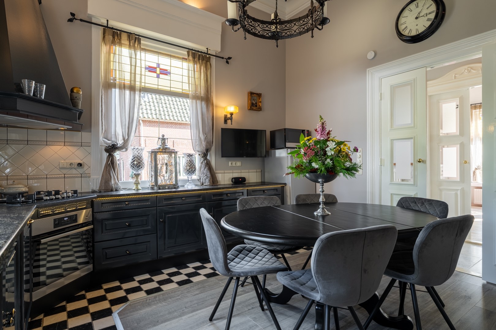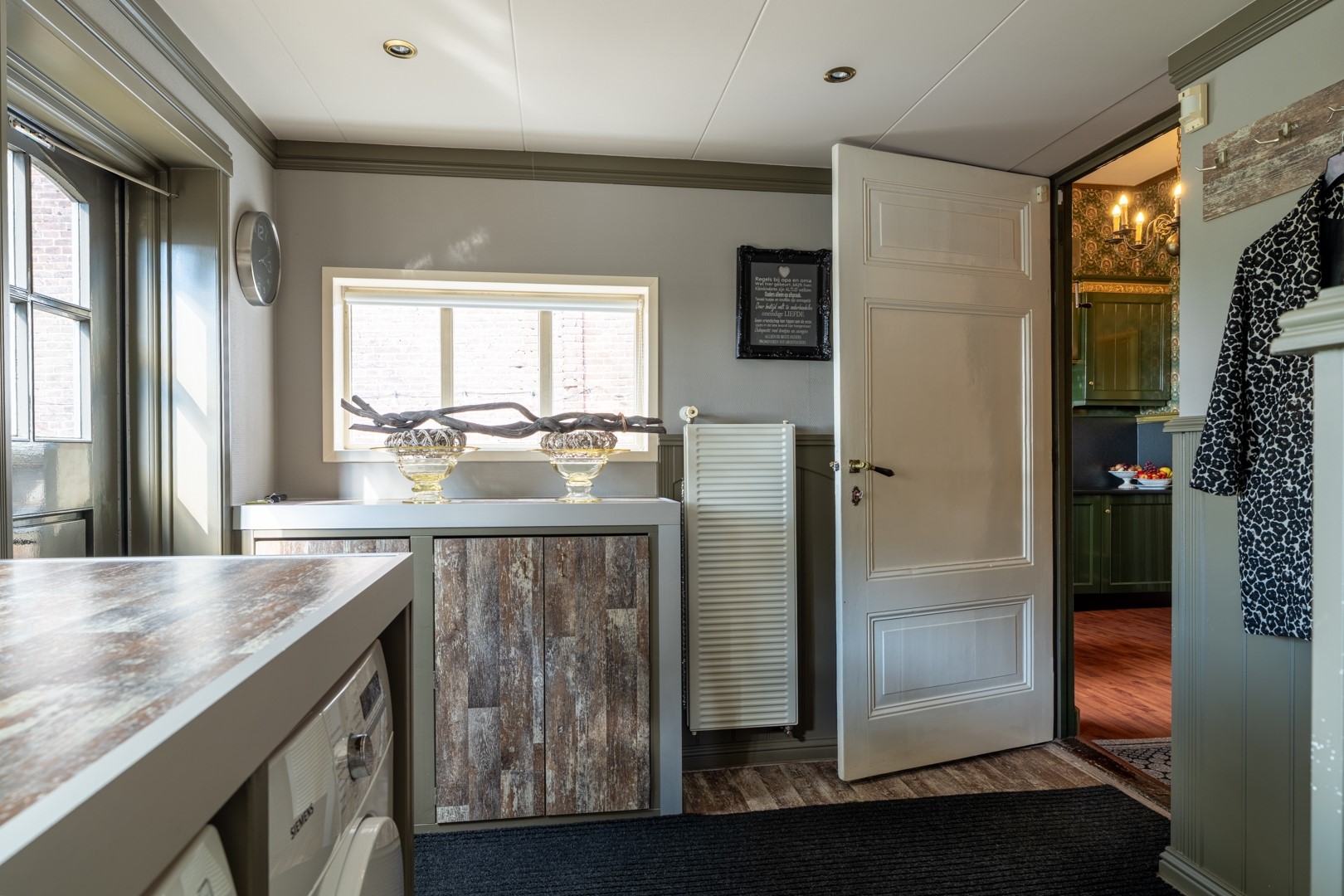 Achterin het huis is een fijne borrelkamer gemaakt – ideaal voor een goed gesprek of gezellige avond. Knus ingericht, met zithoek in de erker en een extra keukenblokje erbij. Vanuit hier heb je toegang tot de koele kelder én de wasruimte.
