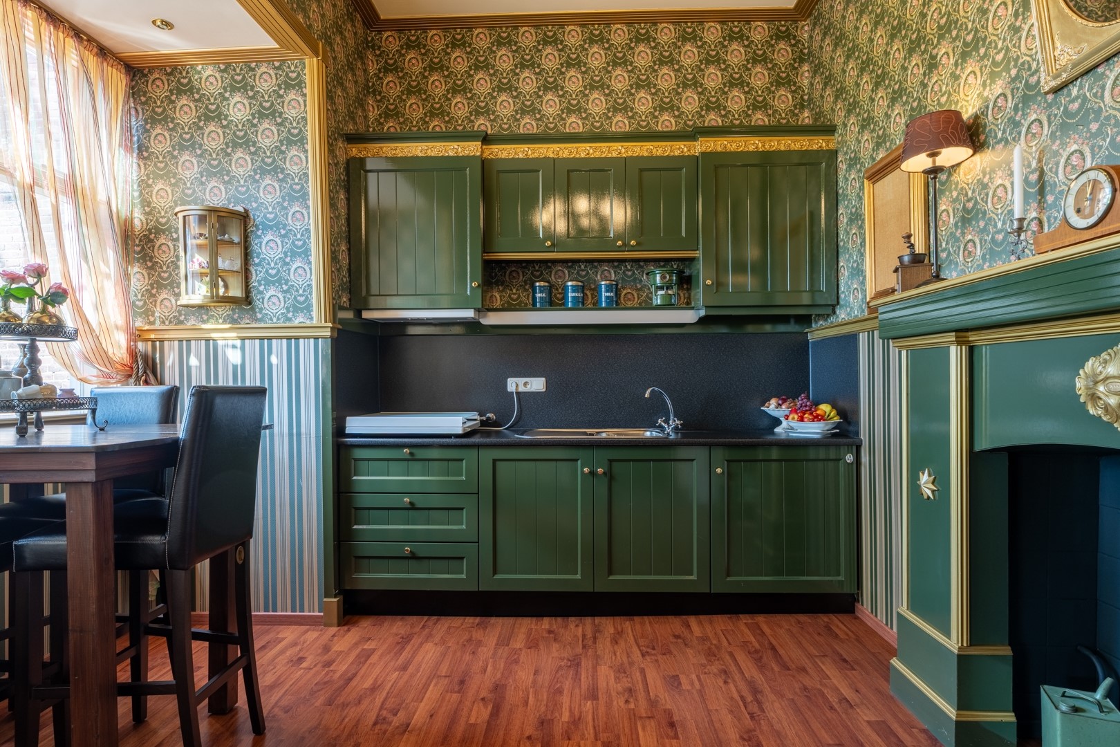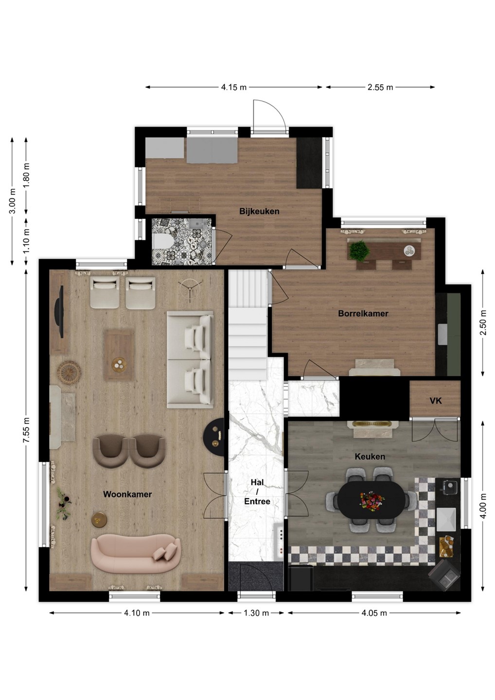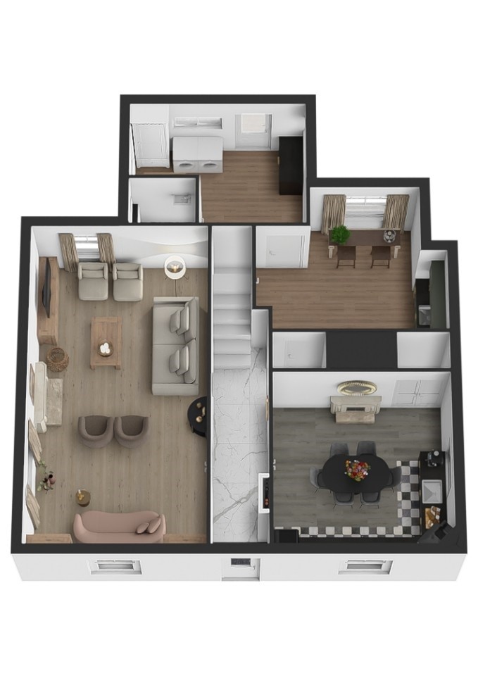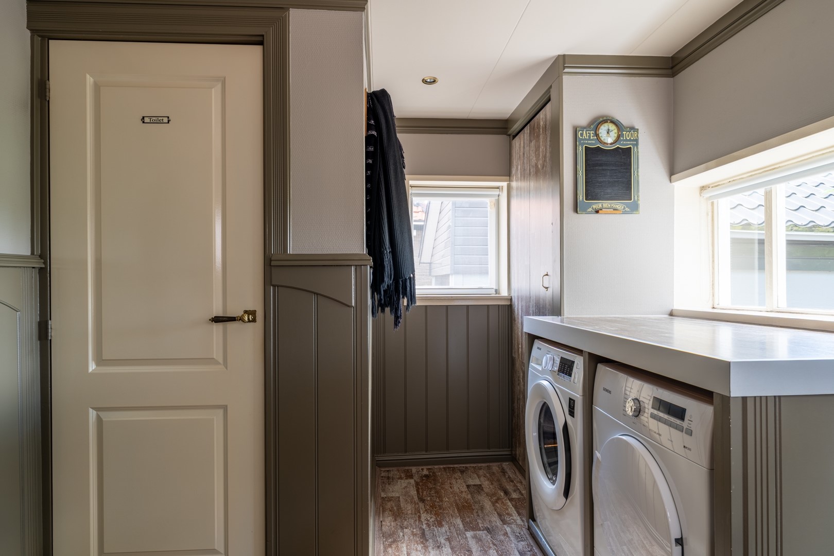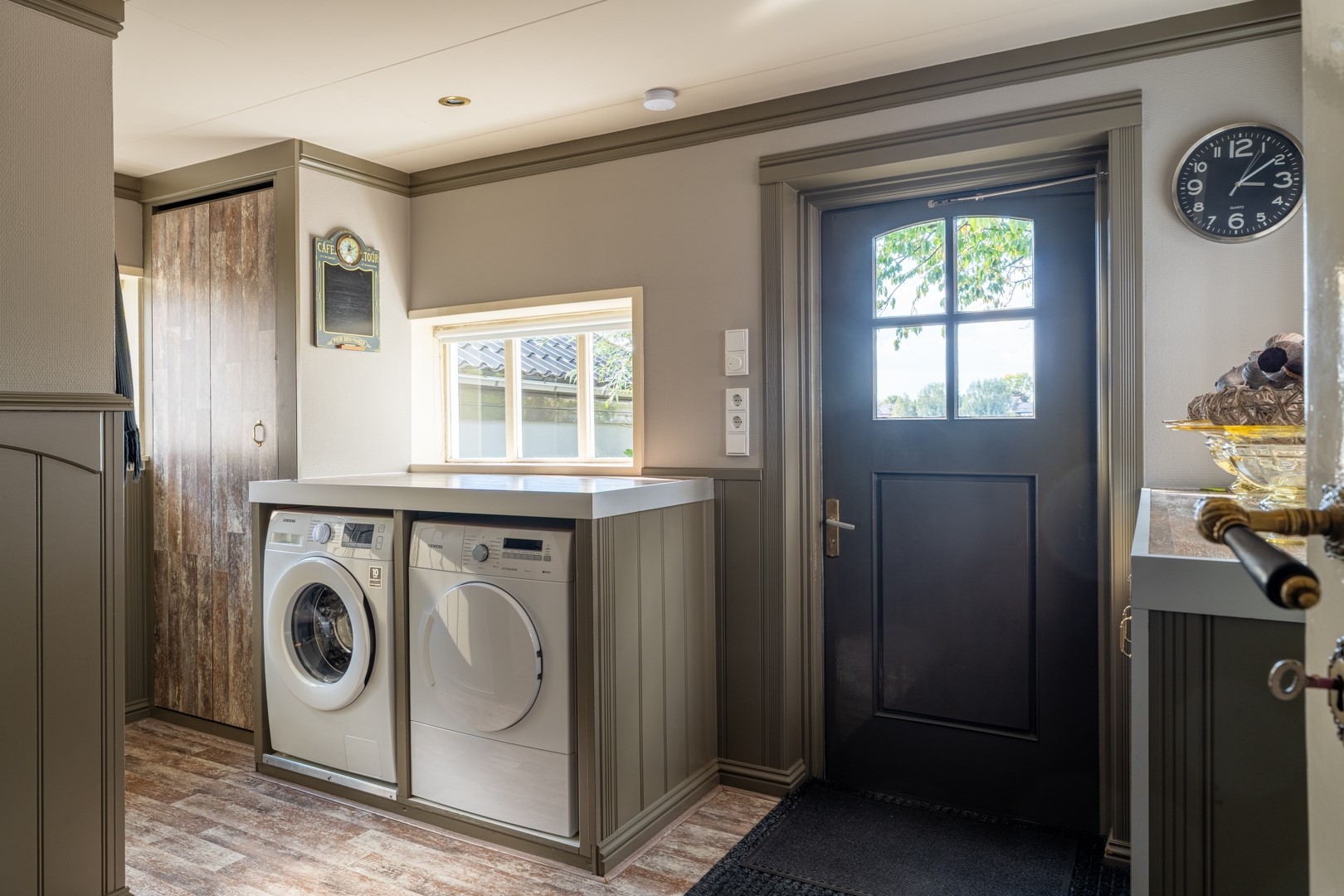 Achterin het huis is een fijne borrelkamer gemaakt – ideaal voor een goed gesprek of gezellige avond. Knus ingericht, met zithoek in de erker en een extra keukenblokje erbij. Vanuit hier heb je toegang tot de koele kelder én de wasruimte.