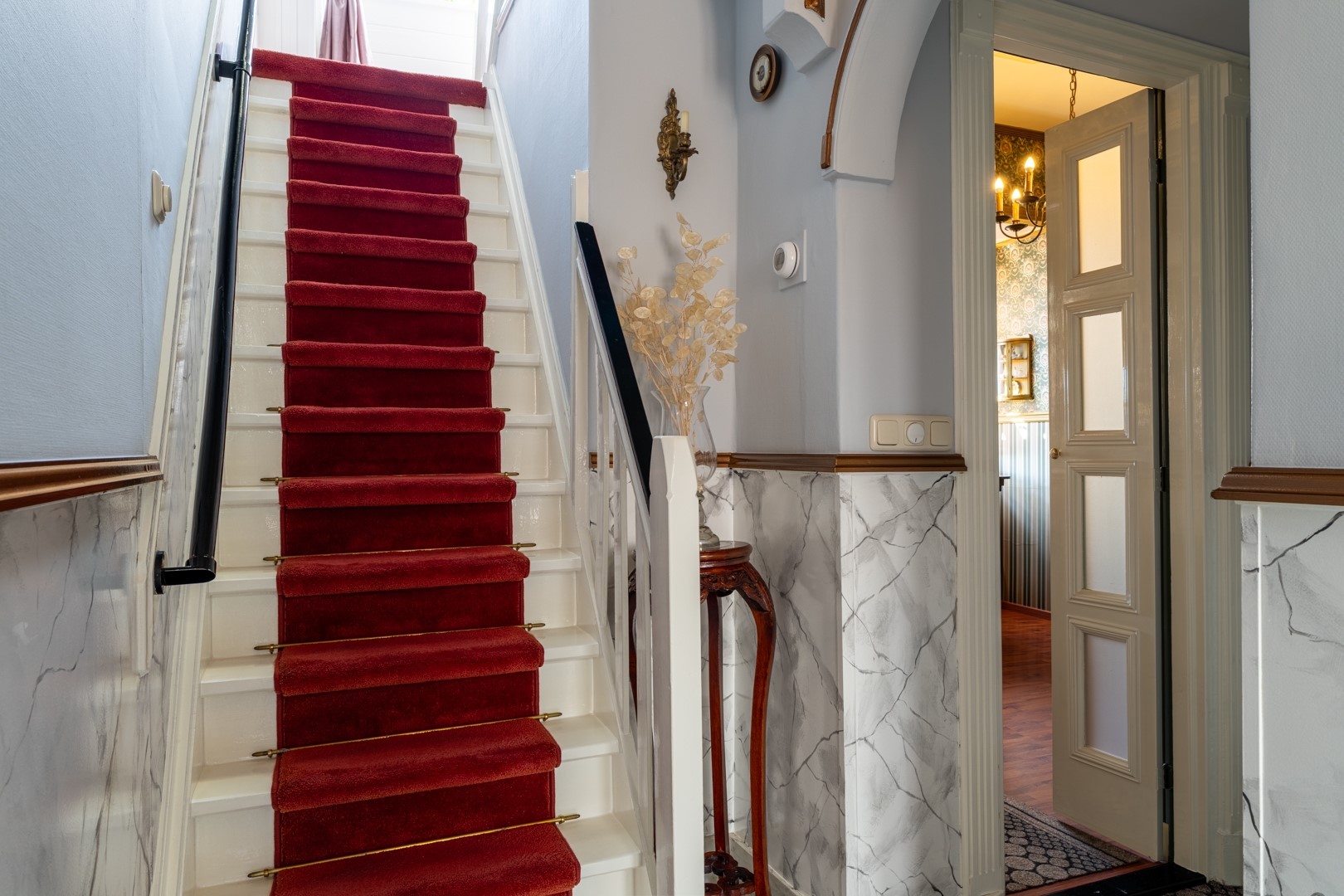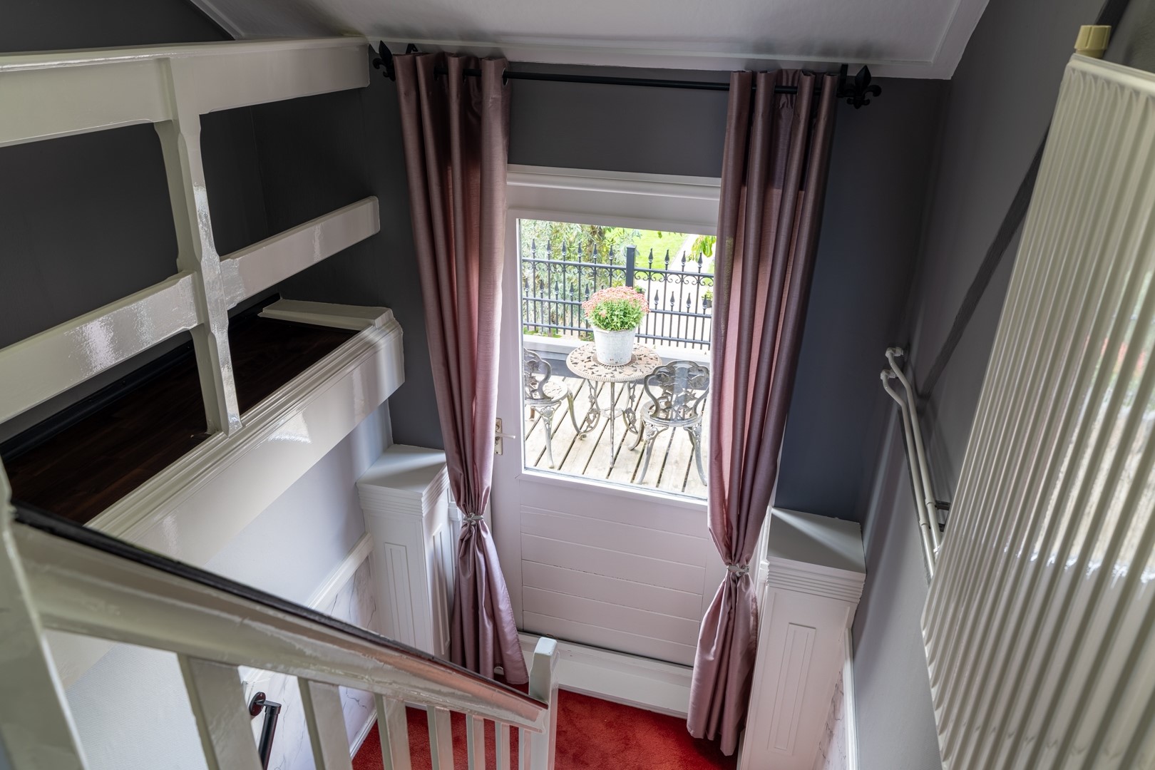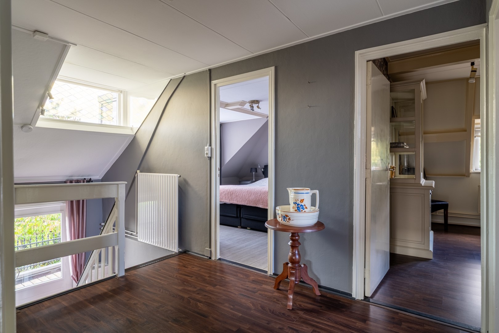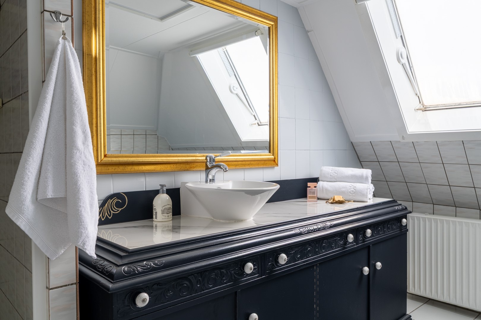 Via de klassieke borderstrap ga je naar boven, waar je meteen uitkomt bij het dakterras. Wat een plek! Op deze verdieping vind je vier grote slaapkamers én een complete badkamer met inloopdouche, ligbad, tweede toilet en een mooi wastafelmeubel. Via de overloop is er ook nog een vlizotrap naar de bergzolder.