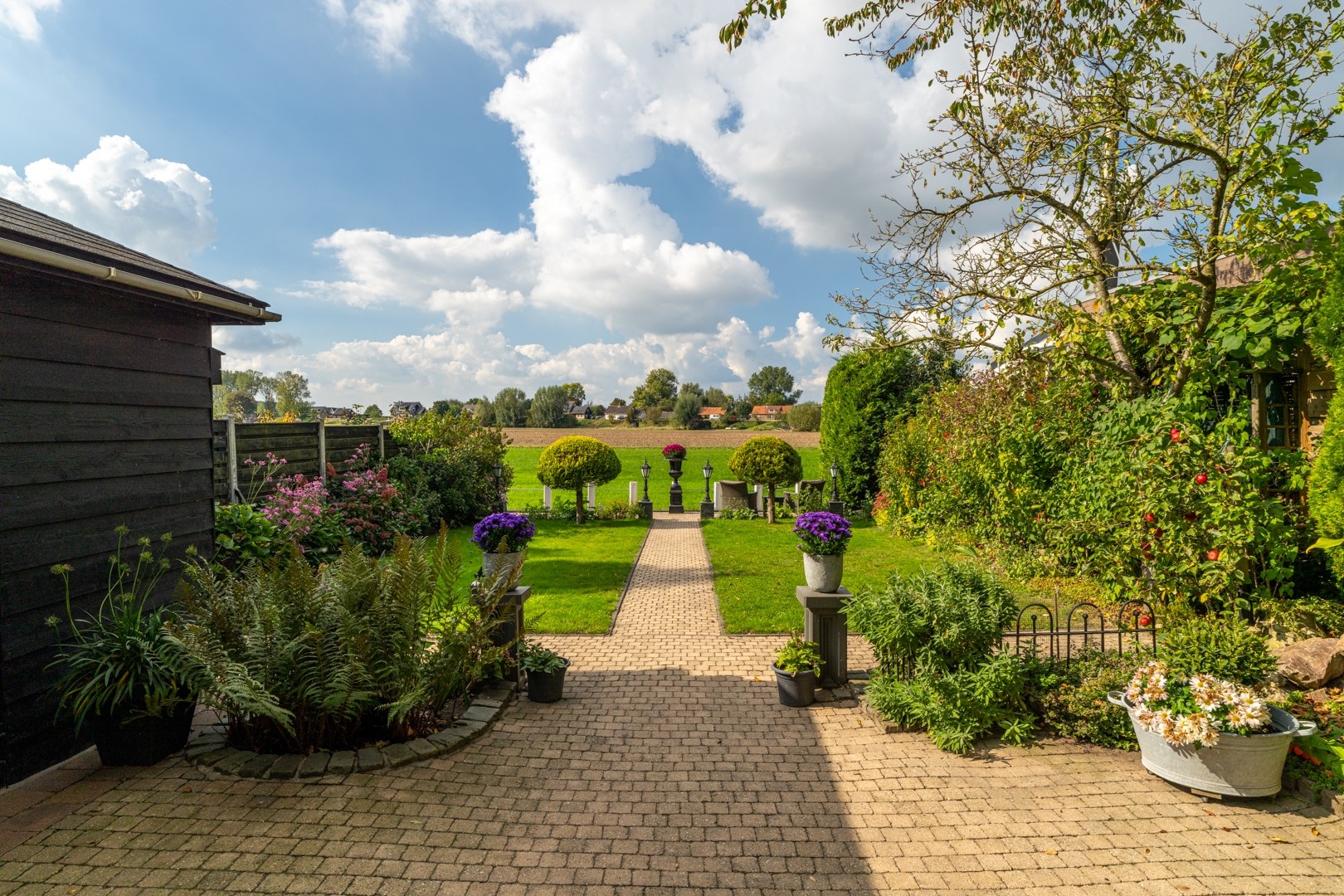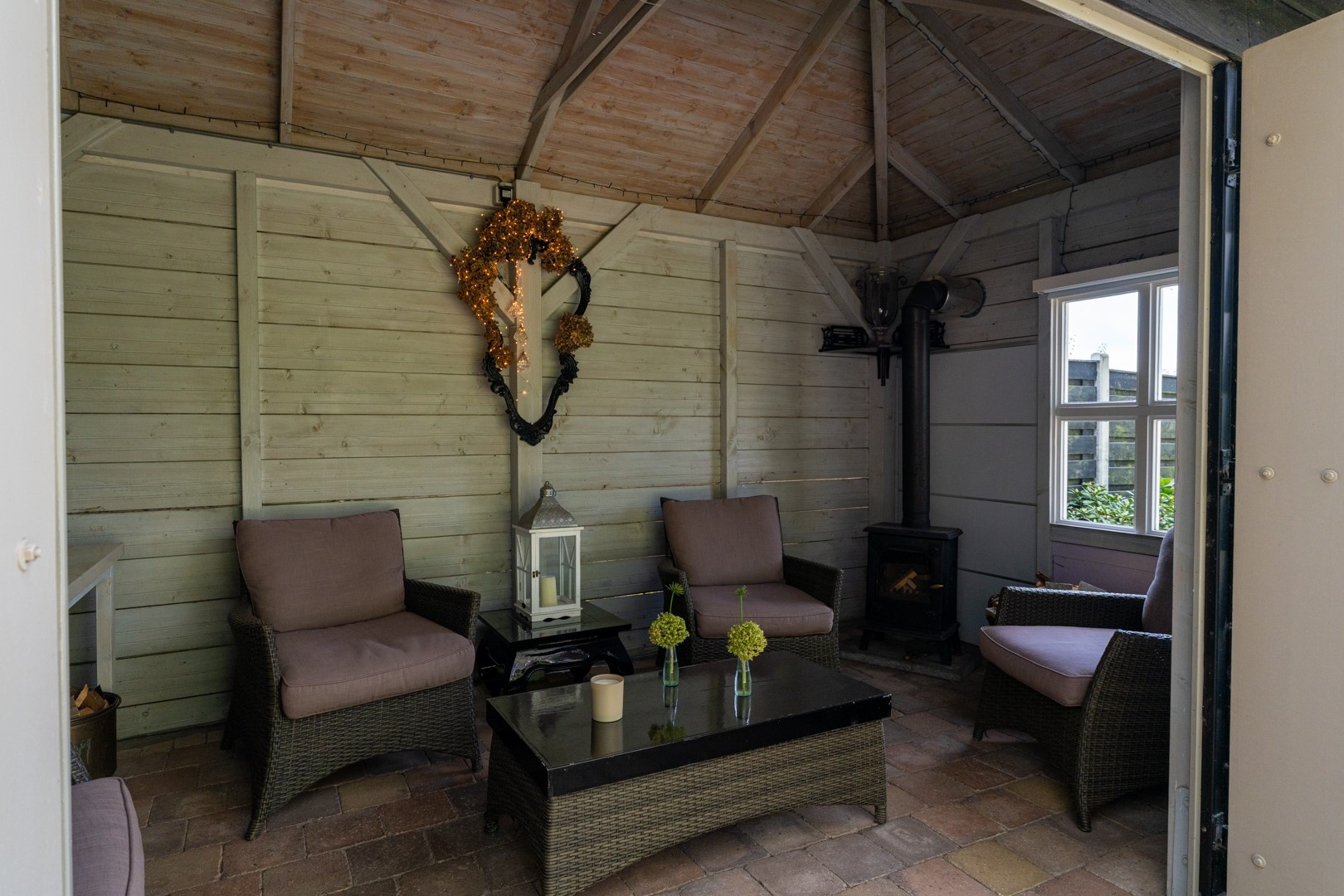 Parkeren? Dat doe je lekker op eigen terrein. De garage heeft een kanteldeur aan de voorkant, maar is ook bereikbaar via de stenen berging ernaast. De achtertuin is een oase van rust – groen, ruim en met zicht op de omliggende landerijen. En dan die tuinkamer… hier wil je gewoon zitten. Houtkachel aan, drankje erbij – genieten maar.