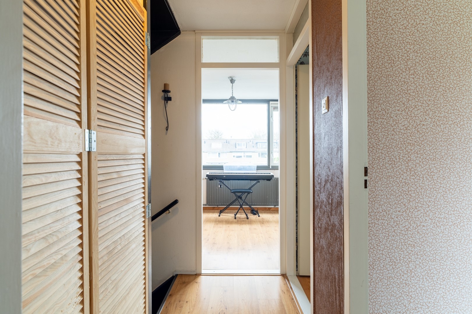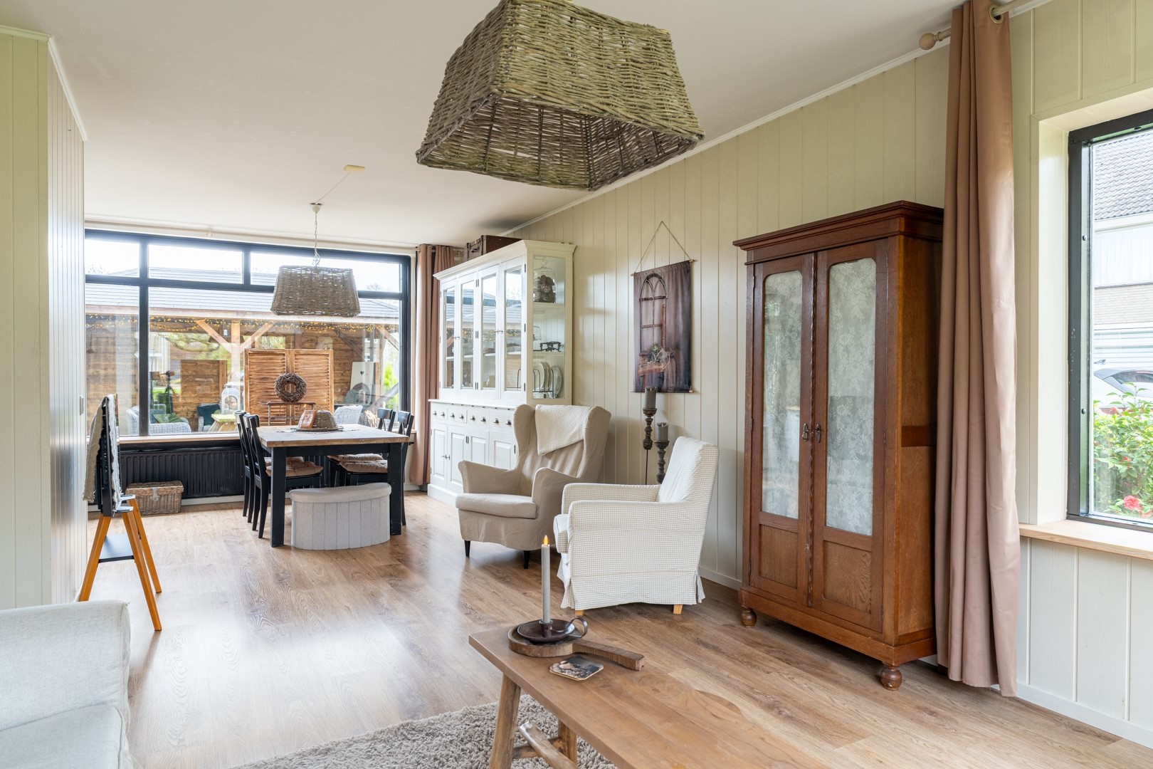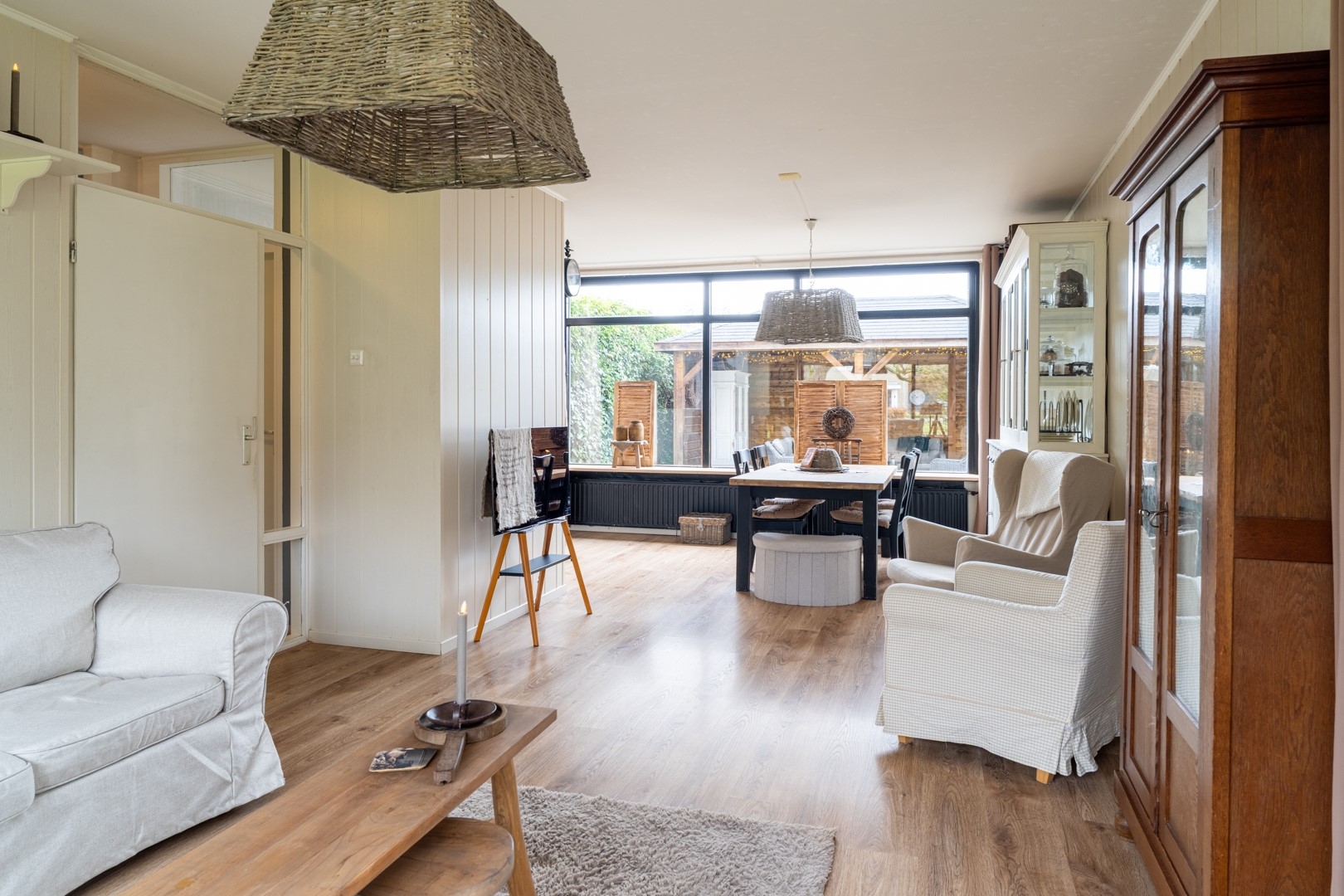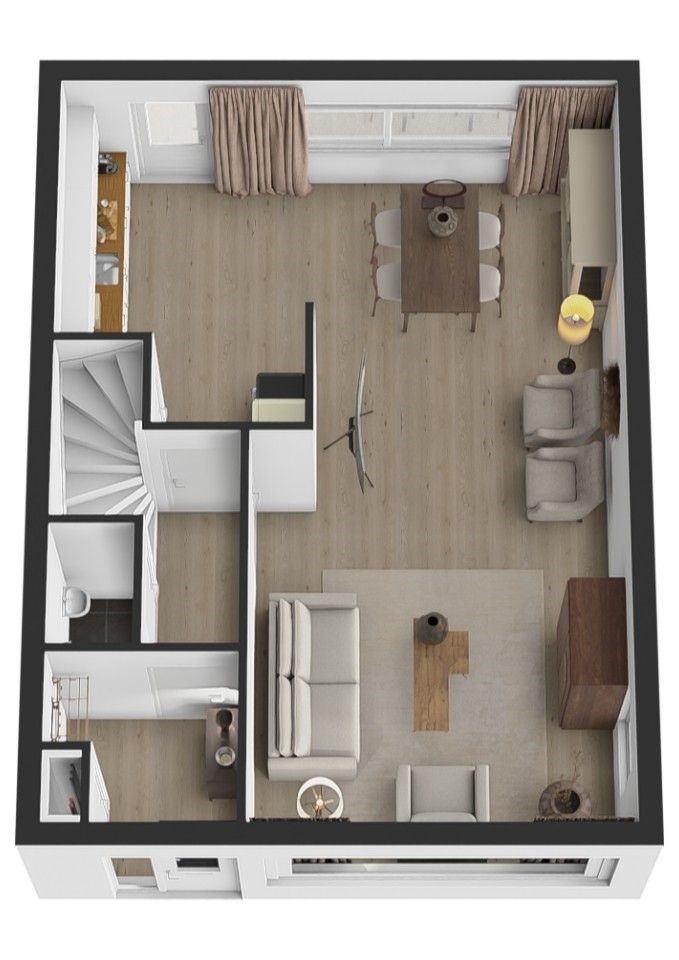 Bij binnenkomst word je verwelkomd in een ruime hal die toegang biedt tot de toiletruimte met fontein, de trapopgang en de woonkamer. De lichte doorzonwoonkamer is een heerlijke leefruimte waar grote raampartijen zorgen voor veel natuurlijk lichtinval. Dankzij de praktische indeling is er volop ruimte voor een gezellige zithoek en een royale eethoek. De trapkast biedt extra bergruimte, ideaal voor provisie of huishoudelijke spullen.
