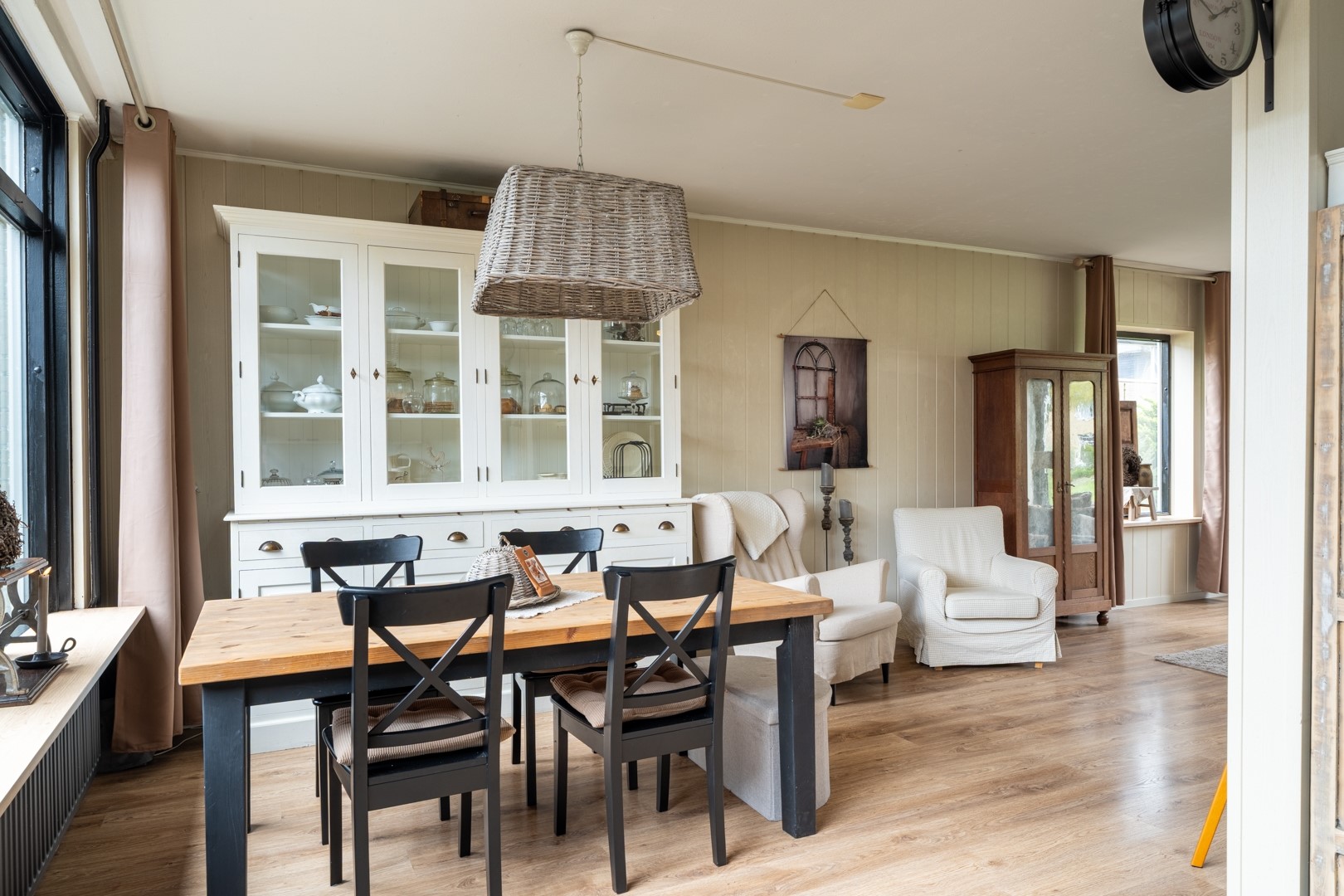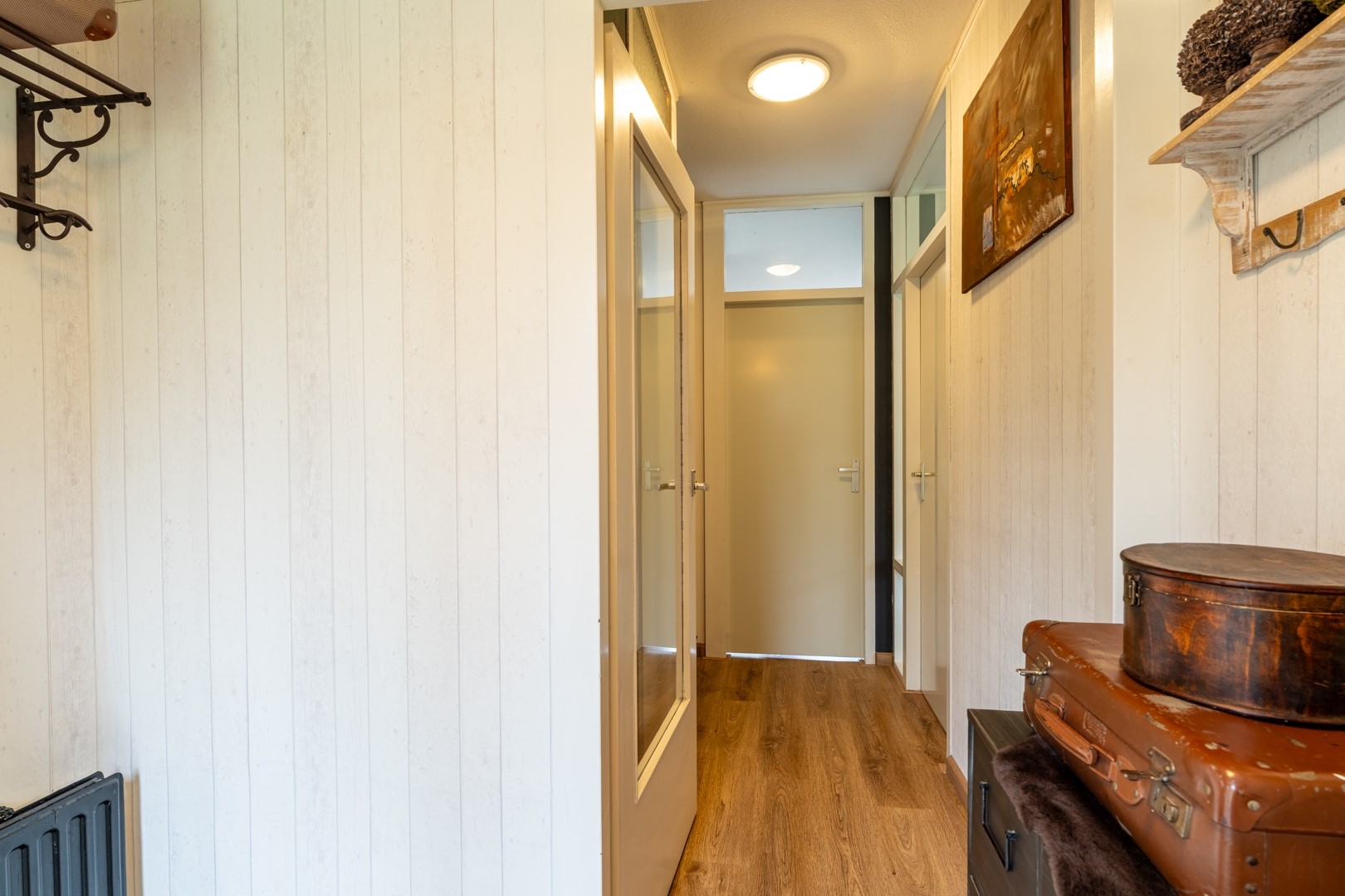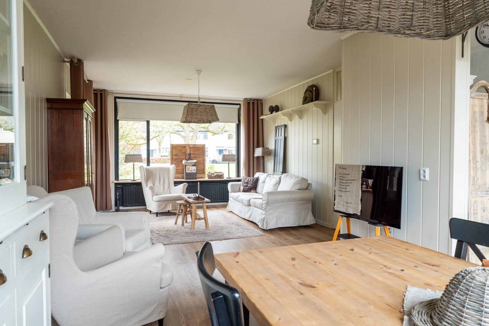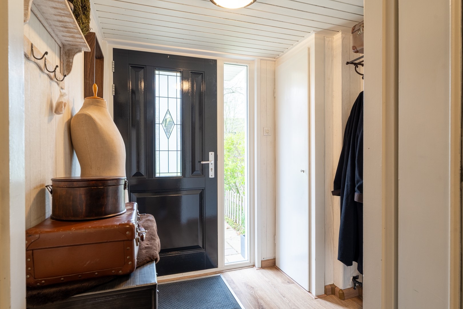 Bij binnenkomst word je verwelkomd in een ruime hal die toegang biedt tot de toiletruimte met fontein, de trapopgang en de woonkamer. De lichte doorzonwoonkamer is een heerlijke leefruimte waar grote raampartijen zorgen voor veel natuurlijk lichtinval. Dankzij de praktische indeling is er volop ruimte voor een gezellige zithoek en een royale eethoek. De trapkast biedt extra bergruimte, ideaal voor provisie of huishoudelijke spullen.