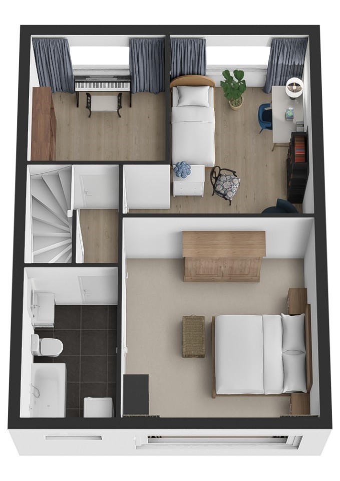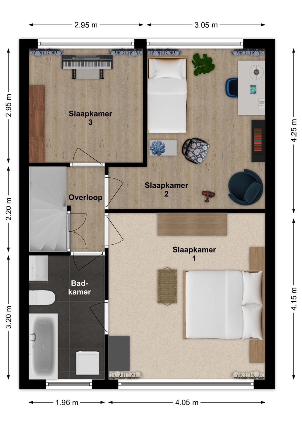 Op de eerste verdieping bevinden zich drie goed bemeten slaapkamers, stuk voor stuk prettig in te delen als slaap-, werk- of hobbyruimte. De badkamer is compleet uitgerust met een ligbad/douchecombinatie, toilet, wastafel en een aansluiting voor de wasmachine.