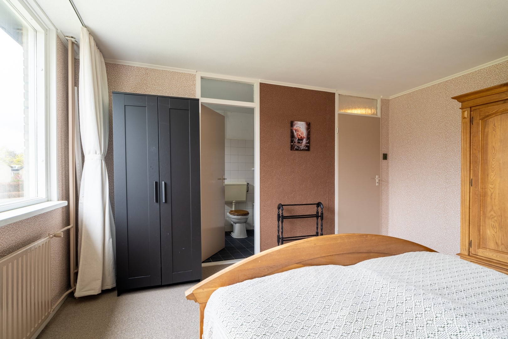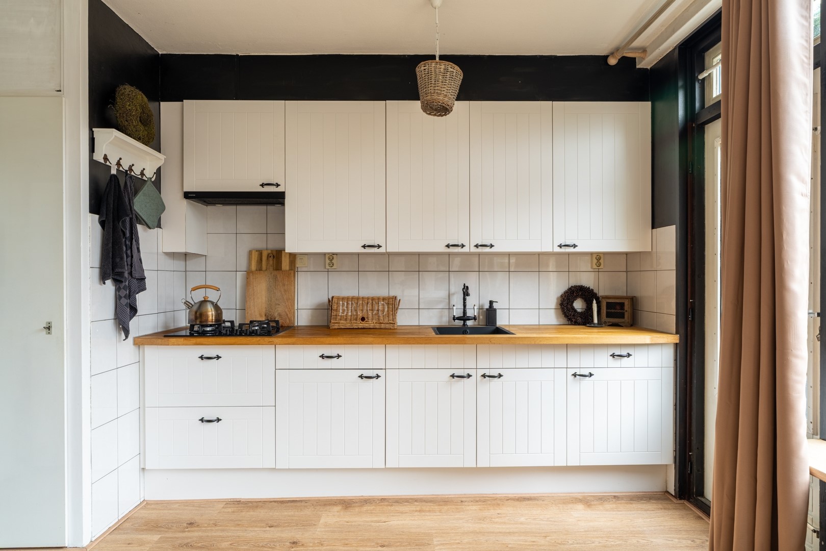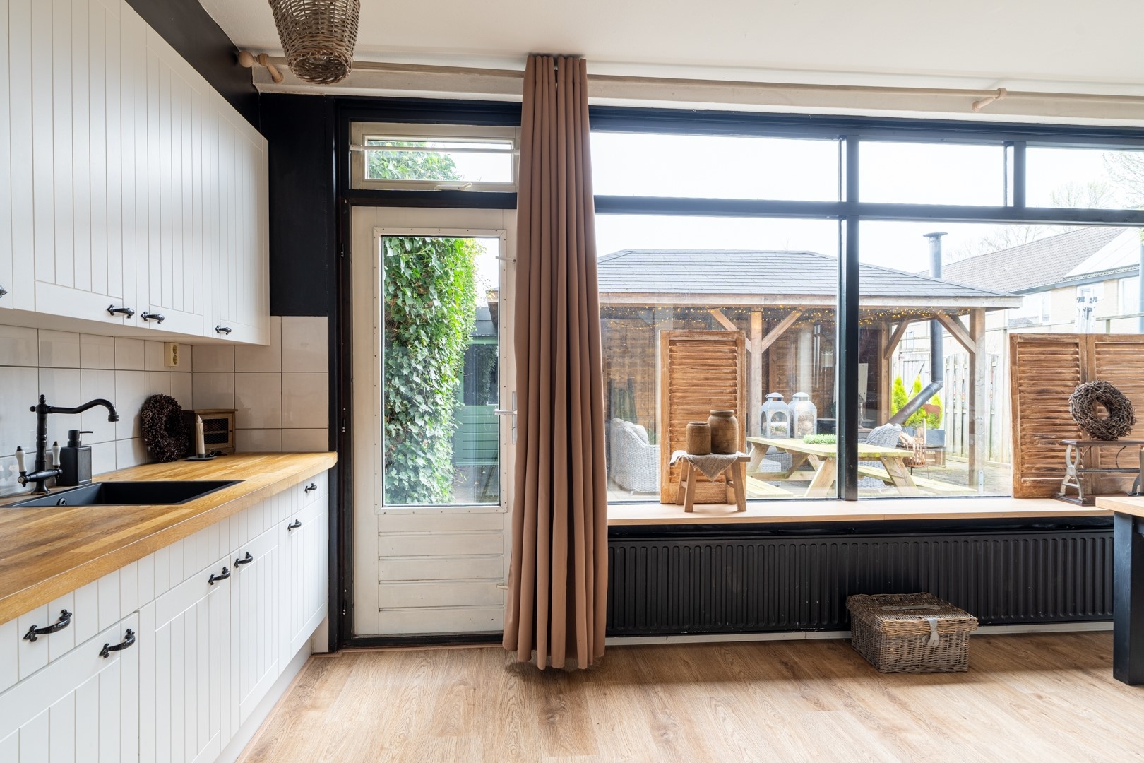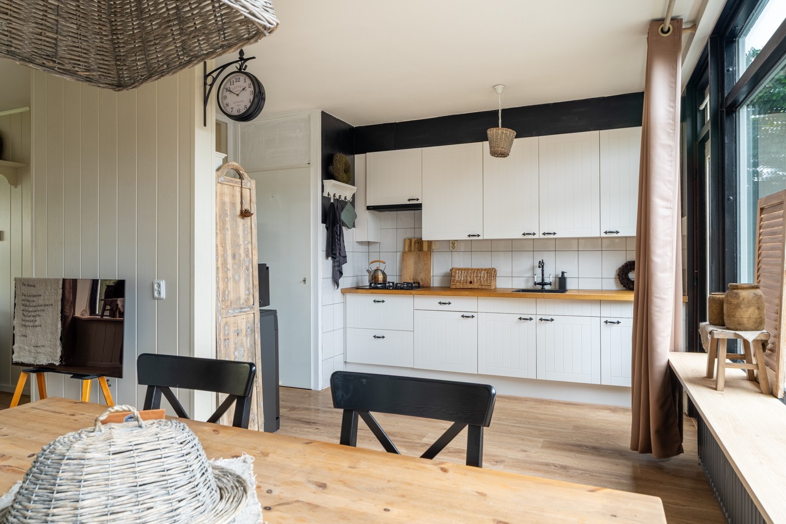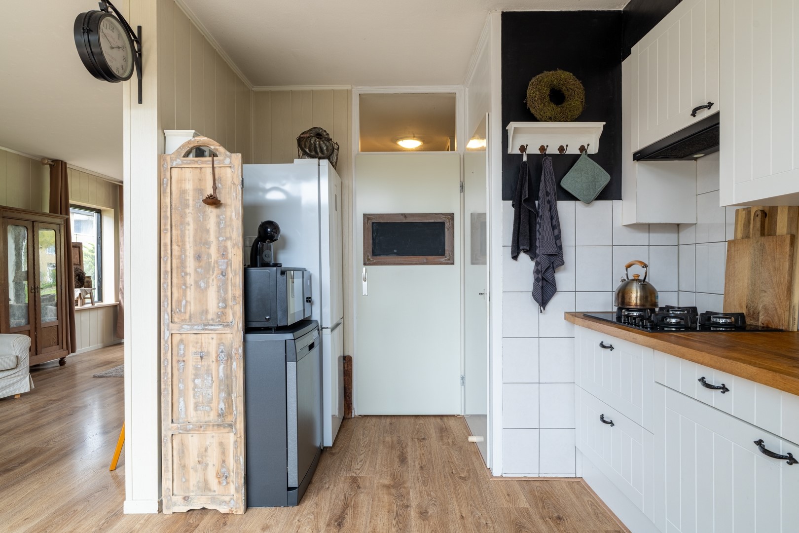 De open keuken sluit naadloos aan op de woonkamer en is functioneel ingericht. Je vindt hier een 4-pits gaskookplaat en een afzuigkap, waardoor je direct aan de slag kunt. Vanuit de keuken heb je via de tuindeur toegang tot de achtertuin, wat het contact met buiten extra prettig maakt.