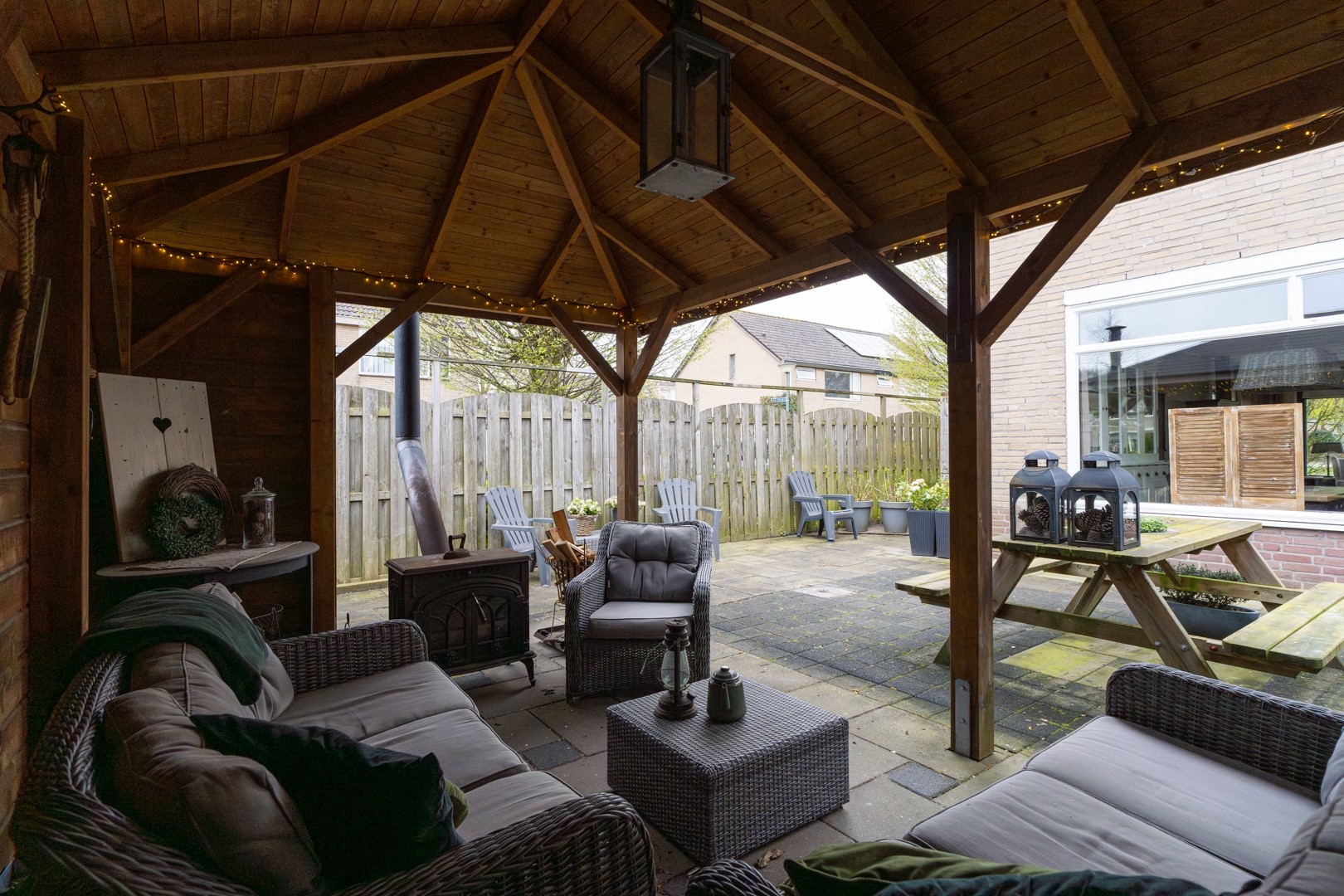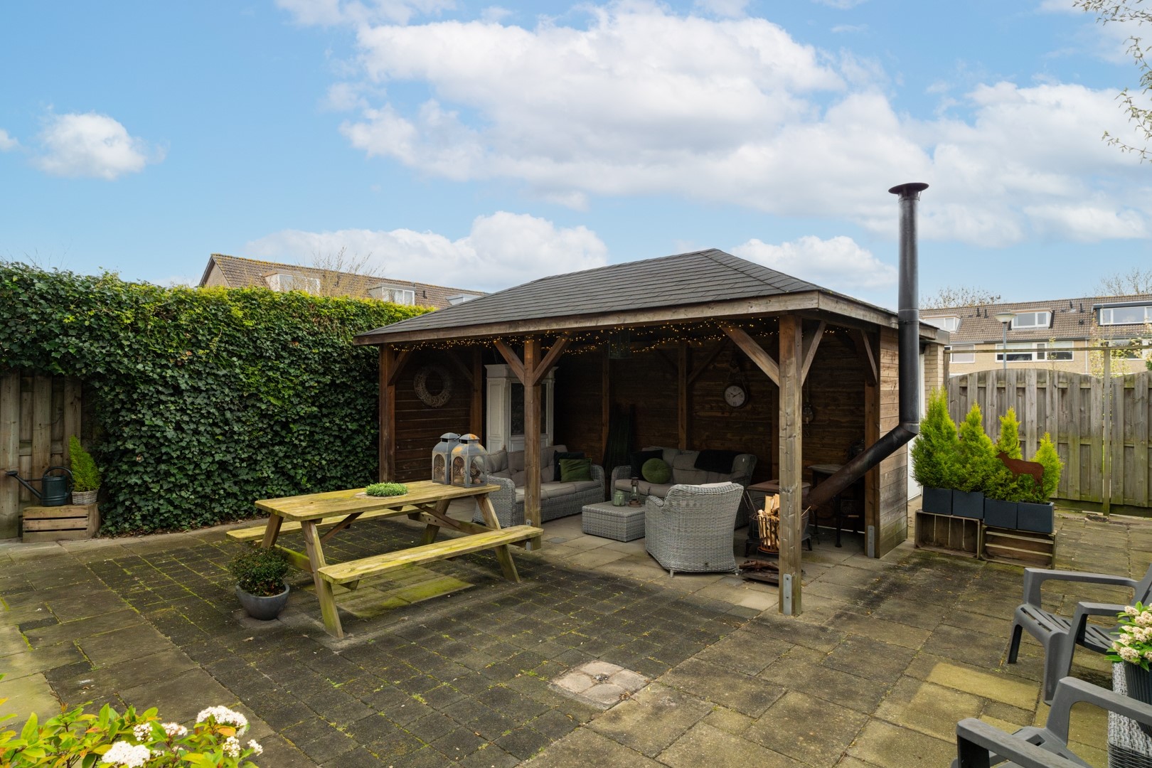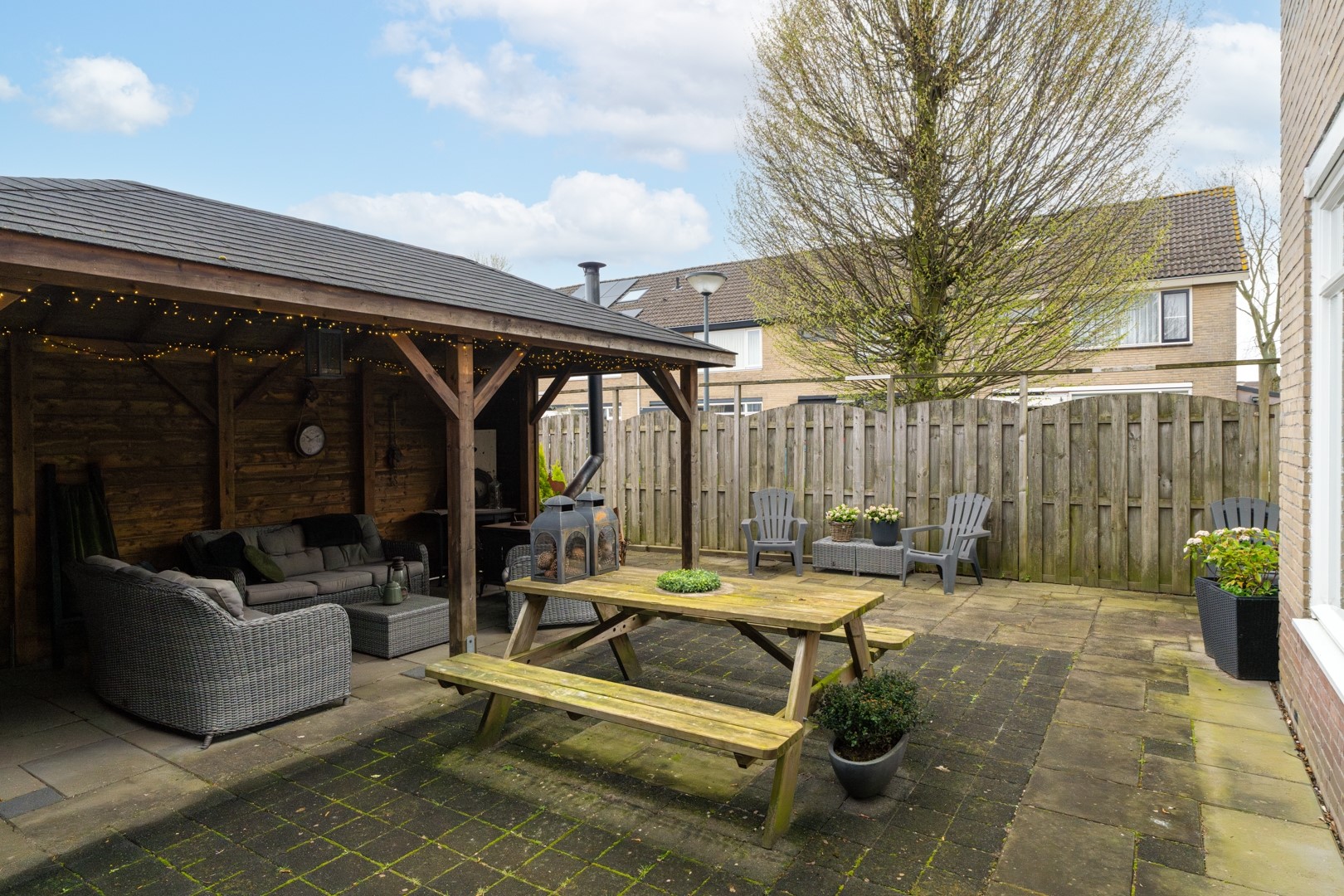 De achtertuin biedt een fijne plek om te ontspannen. Dankzij de ruime opzet en de aanwezige voorzieningen kun je hier het hele jaar door genieten. De vrijstaande garage (circa 3.05 x 6.20 meter) is voorzien van elektra en biedt volop ruimte voor opslag, een werkplaats of het stallen van een auto. Daarnaast is er een royale overkapping (circa 3.10 x 5.60 meter) – een heerlijke plek om lange avonden door te brengen, ongeacht het seizoen.