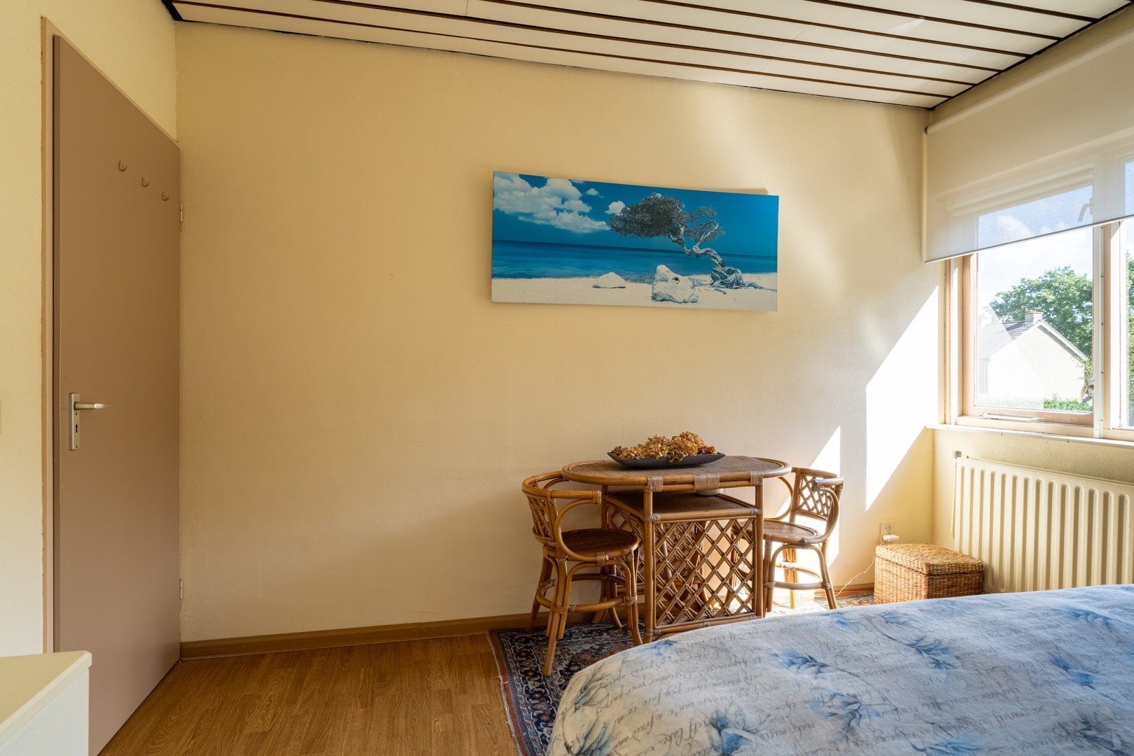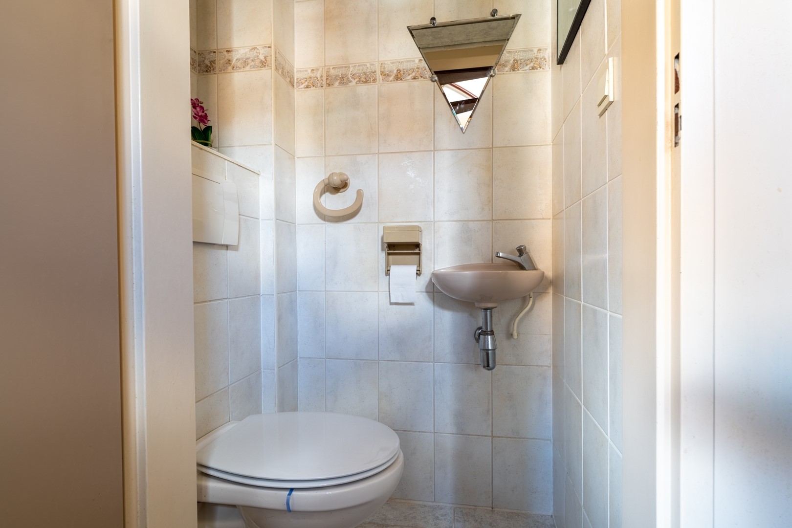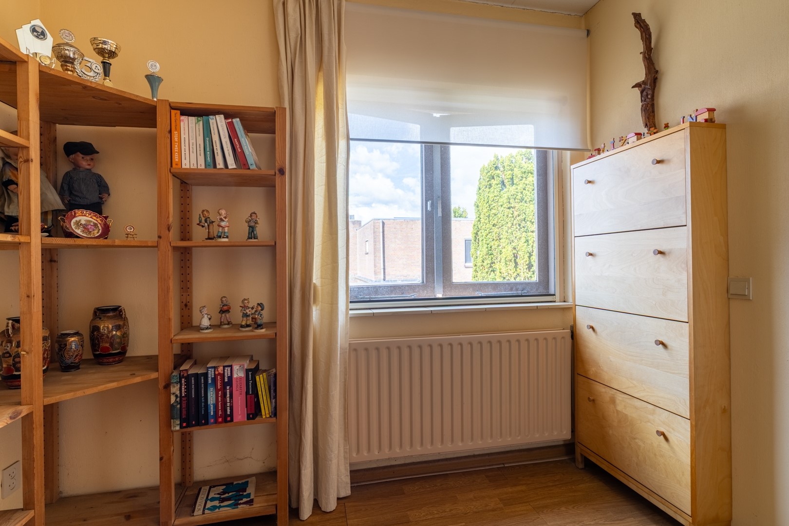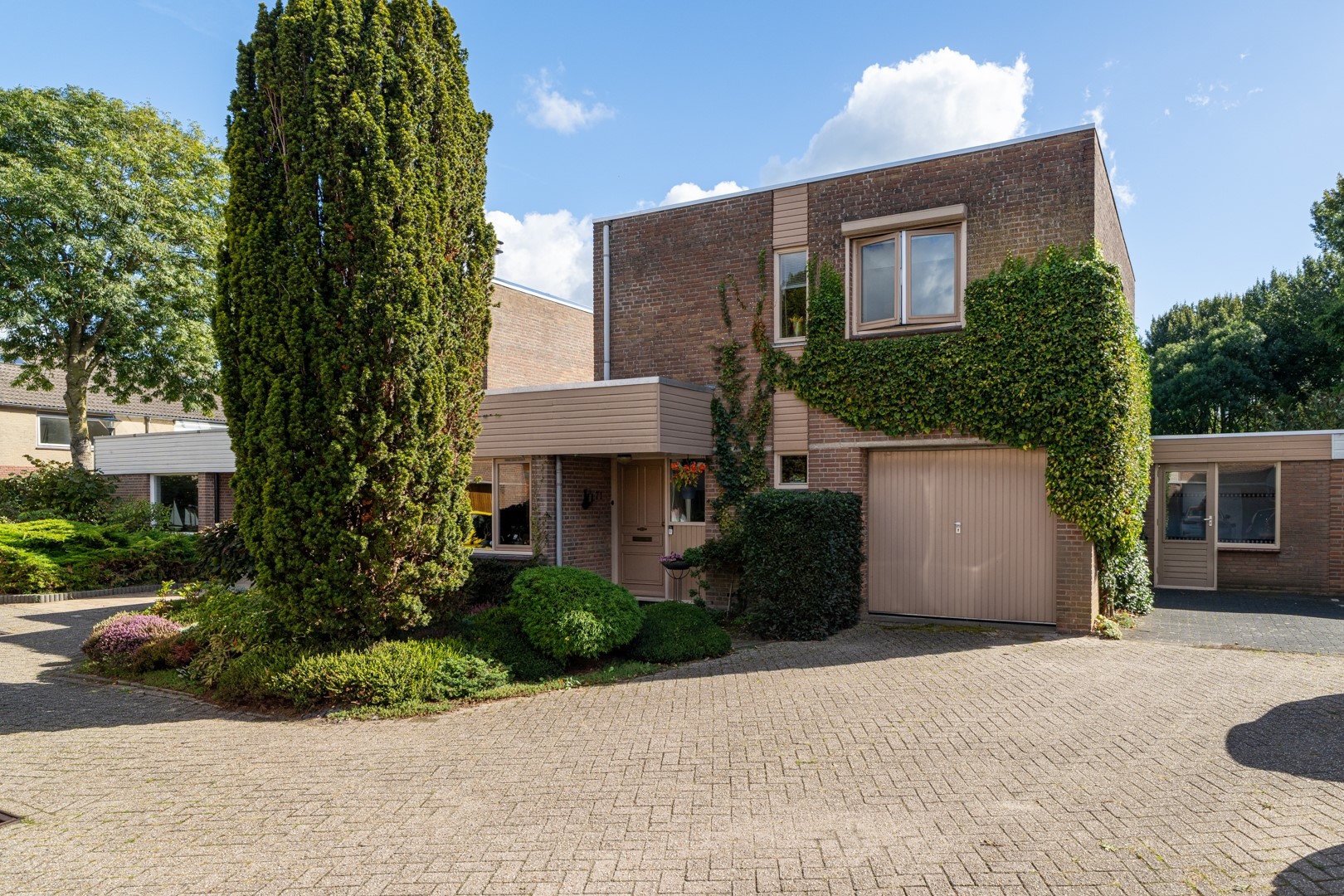 Naast het huis staat een ruime stenen garage met sectionaaldeur. Daarachter ligt nog een extra berging – ideaal voor fietsen, tuingereedschap of hobbyspullen. In de garage zijn ook de aansluitingen voor de wasmachine te vinden.