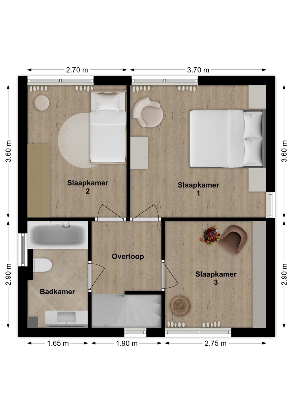 Op de eerste verdieping vind je drie ruime slaapkamers én een complete badkamer. Deze is uitgerust met een ligbad, wastafelmeubel, zwevend toilet en een designradiator. Alles wat je nodig hebt!