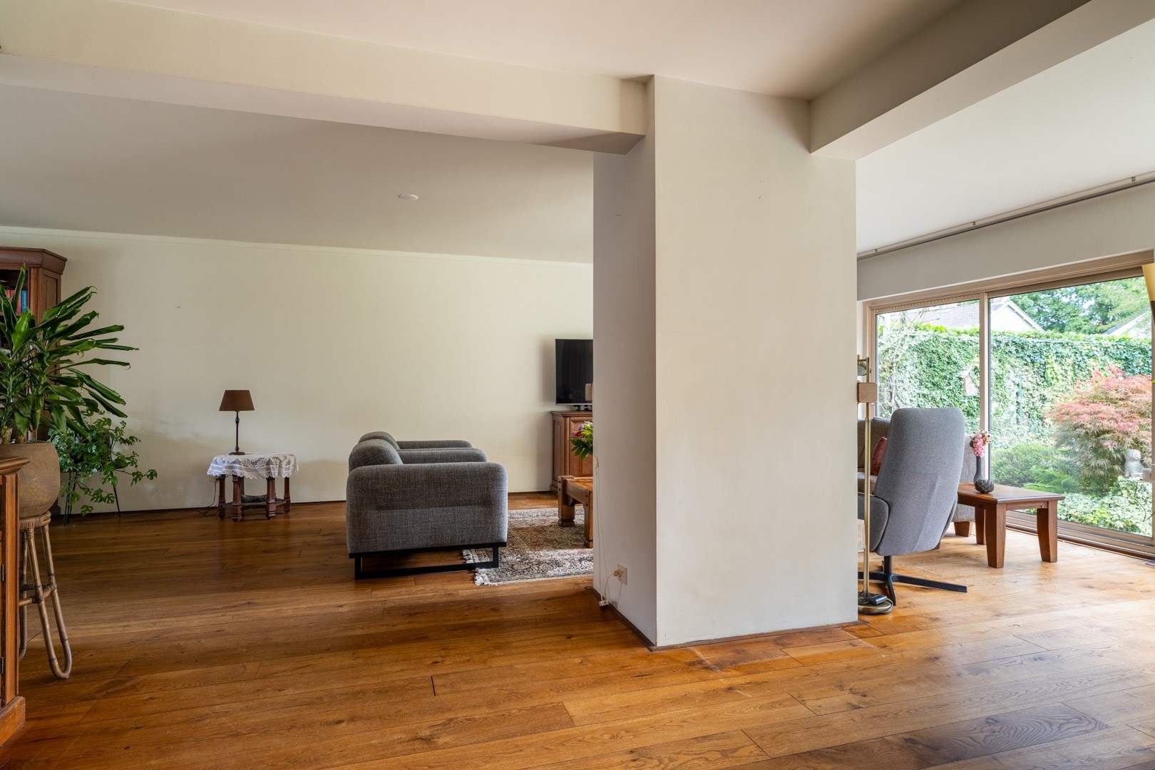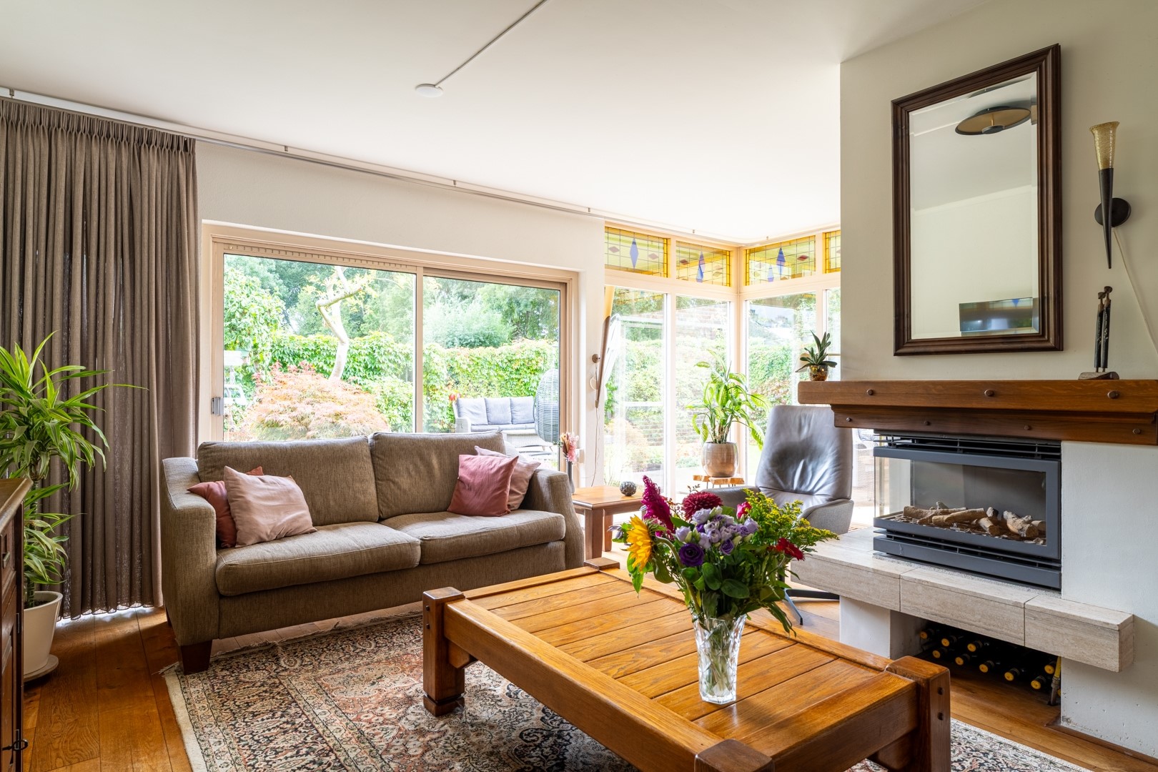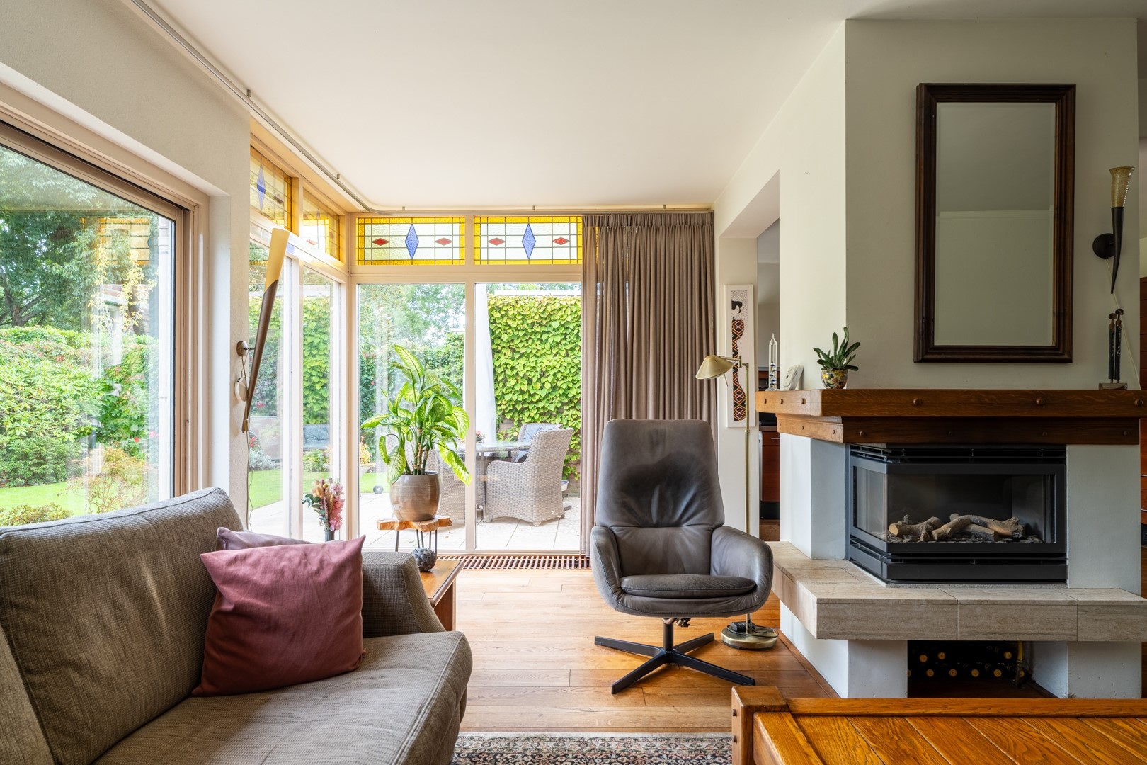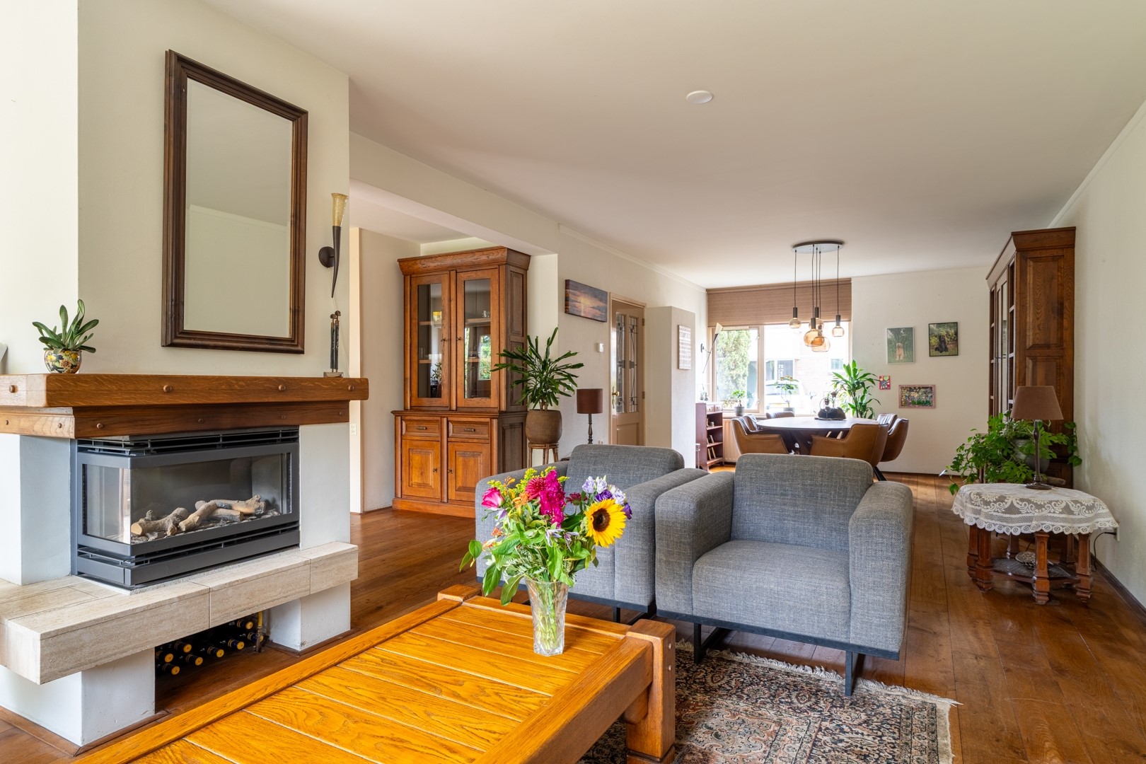 De woonkamer voelt heerlijk licht en open aan. De gezellige haard in het midden maakt het een perfecte plek voor knusse avonden. Via de schuifpui sta je zó in de achtertuin. Aan de voorzijde zit de entree, met toegang tot het toilet, een technische ruimte, de garderobe, de trap én natuurlijk de garage.