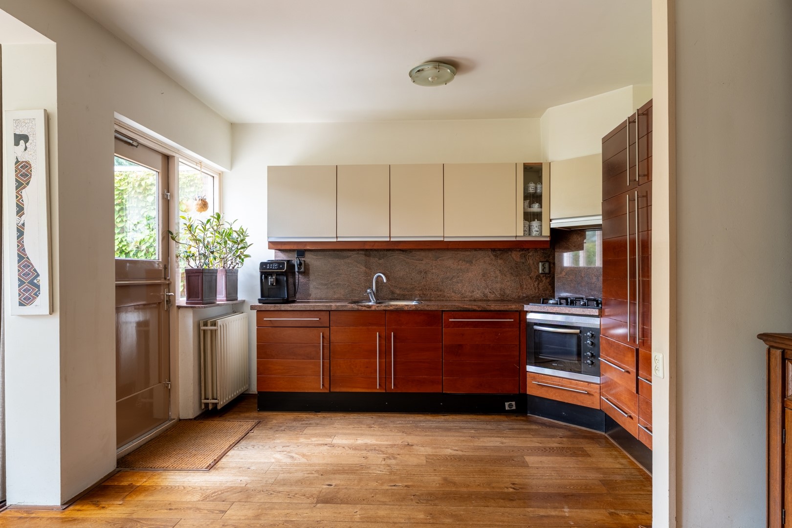 De open keuken staat in verbinding met de woonkamer en is van alle gemakken voorzien. Denk aan een 4-pits gaskookplaat, afzuigkap, combimagnetron, vaatwasser en koelkast. Het natuurstenen werkblad maakt het helemaal af.